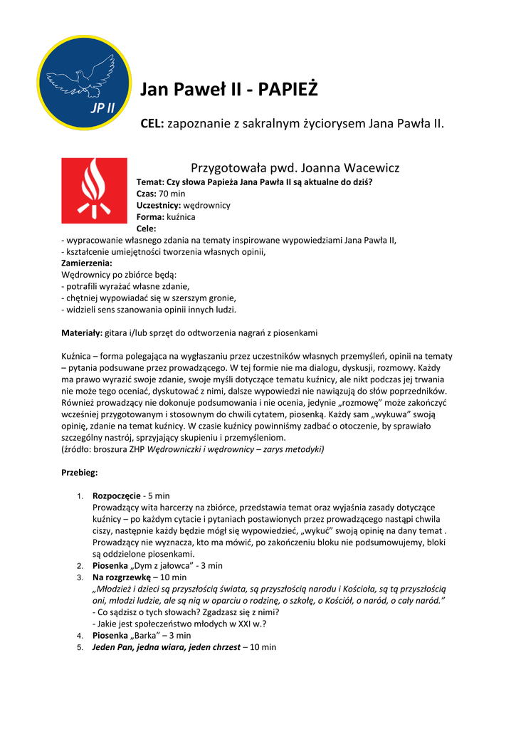 Jan Paweł II - PAPIEŻ CEL: zapoznanie z sakralnym życiorysem Jana Pawła II. Przygotowała pwd. Joanna Wacewicz Temat: Czy słowa Papieża Jana Pawła II są aktualne do dziś? Czas: 70 min Uczestnicy: wędrownicy Forma: kuźnica Cele: - wypracowanie własnego zdania na tematy inspirowane wypowiedziami Jana Pawła II, - kształcenie umiejętności tworzenia własnych opinii, Zamierzenia: Wędrownicy po zbiórce będą: - potrafili wyrażać własne zdanie, - chętniej wypowiadać się w szerszym gronie, - widzieli sens szanowania opinii innych ludzi. Materiały: gitara i/lub sprzęt do odtworzenia nagrań z piosenkami Kuźnica – forma polegająca na wygłaszaniu przez uczestników własnych przemyśleń, opinii na tematy – pytania podsuwane przez prowadzącego. W tej formie nie ma dialogu, dyskusji, rozmowy. Każdy ma prawo wyrazić swoje zdanie, swoje myśli dotyczące tematu kuźnicy, ale nikt podczas jej trwania nie może tego oceniać, dyskutować z nimi, dalsze wypowiedzi nie nawiązują do słów poprzedników. Również prowadzący nie dokonuje podsumowania i nie ocenia, jedynie „rozmowę” może zakończyć wcześniej przygotowanym i stosownym do chwili cytatem, piosenką. Każdy sam „wykuwa” swoją opinię, zdanie na temat kuźnicy. W czasie kuźnicy powinniśmy zadbać o otoczenie, by sprawiało szczególny nastrój, sprzyjający skupieniu i przemyśleniom. (źródło: broszura ZHP Wędrowniczki i wędrownicy – zarys metodyki) Przebieg: 1. 2. 3. 4. 5. Rozpoczęcie - 5 min Prowadzący wita harcerzy na zbiórce, przedstawia temat oraz wyjaśnia zasady dotyczące kuźnicy – po każdym cytacie i pytaniach postawionych przez prowadzącego nastąpi chwila ciszy, następnie każdy będzie mógł się wypowiedzieć, „wykuć” swoją opinię na dany temat . Prowadzący nie wyznacza, kto ma mówić, po zakończeniu bloku nie podsumowujemy, bloki są oddzielone piosenkami. Piosenka „Dym z jałowca” - 3 min Na rozgrzewkę – 10 min „Młodzież i dzieci są przyszłością świata, są przyszłością narodu i Kościoła, są tą przyszłością oni, młodzi ludzie, ale są nią w oparciu o rodzinę, o szkołę, o Kościół, o naród, o cały naród.” - Co sądzisz o tych słowach? Zgadzasz się z nimi? - Jakie jest społeczeństwo młodych w XXI w.? Piosenka „Barka” – 3 min Jeden Pan, jedna wiara, jeden chrzest – 10 min 6. 7. 8. 9. 10. 11. „Archidiecezję w Białymstoku zamieszkują także nasi bracia prawosławni. Szukajmy zawsze tego, co łączy, spotykajmy się w duchu ekumenicznym, módlmy się wspólnie. Czy Duch Święty nie sprawia, nie rozrządza, byśmy się spotkali w dialogu i dążyli do jedności?” (Białystok, 1991) - Żyjemy w regionie nazywanym „wielokulturowym”. Jak reaguję na spotkanie z „innym”? - Ania jest jedyną wyznawczynią prawosławia w klasie. W tym roku zdaje maturę, więc zakończy rok szkolny już pod koniec kwietnia. Klasa bardzo się zżyła przez ostatnie 3 lata, dlatego uczniowie chcą przed rozstaniem wybrać się razem na tańce. Kwietniowy termin, który wybrali to czas, kiedy katolicy są już po świętach wielkanocnych, a wyznawcy prawosławia mają wtedy Wielki Tydzień, czyli czas najściślejszego postu i pokuty. Ania chciałaby pójść na spotkanie z klasą, ale równie ważne jest dla niej duchowe przygotowanie do Wielkanocy. Jak zachowałbyś się na miejscu Ani? Jakich argumentów użyłbyś w rozmowie z klasą? Piosenka „Wieczorne śpiewogranie” – 3 min Lasów wonnych smak – 10 min „Człowiek otrzymał od Boga zadanie panowania nad przyrodą. To panowanie nie oznacza samowolnego niszczenia przyrody, wykorzystywania jej zasobów bez ograniczeń. Mówię to tu, na białostockiej ziemi, która należy do jednej z najpiękniejszych w Polsce wraz ze wspaniałą Puszczą Białowieską (…). Przyroda cierpi z powodu człowieka. Dar panowania nad przyrodą powinniśmy wykorzystywać w poczuciu odpowiedzialności, świadomości, że jest to wspólne dobro ludzkości.” (Białystok, 1991) - Prawo Harcerskie podpowiada nam, że mamy szanować przyrodę i starać się ją poznać. Jaki wysiłek podejmuję będąc wędrownikiem, aby poznać piękno przyrody w najbliższym otoczeniu? - Co sądzisz o wycince lasów w celu budowania nowoczesnych dróg? Piosenka „Góralu, czy Ci nie żal” – 3 min Jestem świadomy odpowiedzialności harcerskiego wychowawcy i opiekuna, czyli o służbie słów kilka – 15 min „Człowiek, jako ten, który wytwarza, który siebie bogaci, nie żyje tylko dla siebie, nie produkuje dla siebie – ma bogacić społeczeństwo.”(Białystok, 1991) Jesteś wędrownikiem. Coraz częściej zastanawiasz się nad tym, co dalej. Co dalej z edukacją, co dalej z harcerstwem. Człowiek nie żyje tylko dla siebie, ma bogacić społeczeństwo, mówi Papież. - Jak myślisz, czy Twoja postawa może kogoś ubogacić? Jakie własne cechy charakteru wskazałbyś tutaj? - Czy jesteś dla kogoś autorytetem? - Przed Tobą decyzja dalszej ścieżki w ZHP. Czy widzisz siebie w roli harcerskiego instruktora – wychowawcy młodych ludzi? Dlaczego tak/nie? A może masz już inny plan? - W zobowiązaniu instruktorskim są takie słowa: Powierzonej przez Związek Harcerstwa Polskiego służby nie opuszczę samowolnie. Jak się do nich odnoszę? Piosenka „Dobranoc” – 3 min Zakończenie - 5 min Prowadzący dziękuje za wspólnie spędzony czas. Uczestnicy zawiązują krąg.