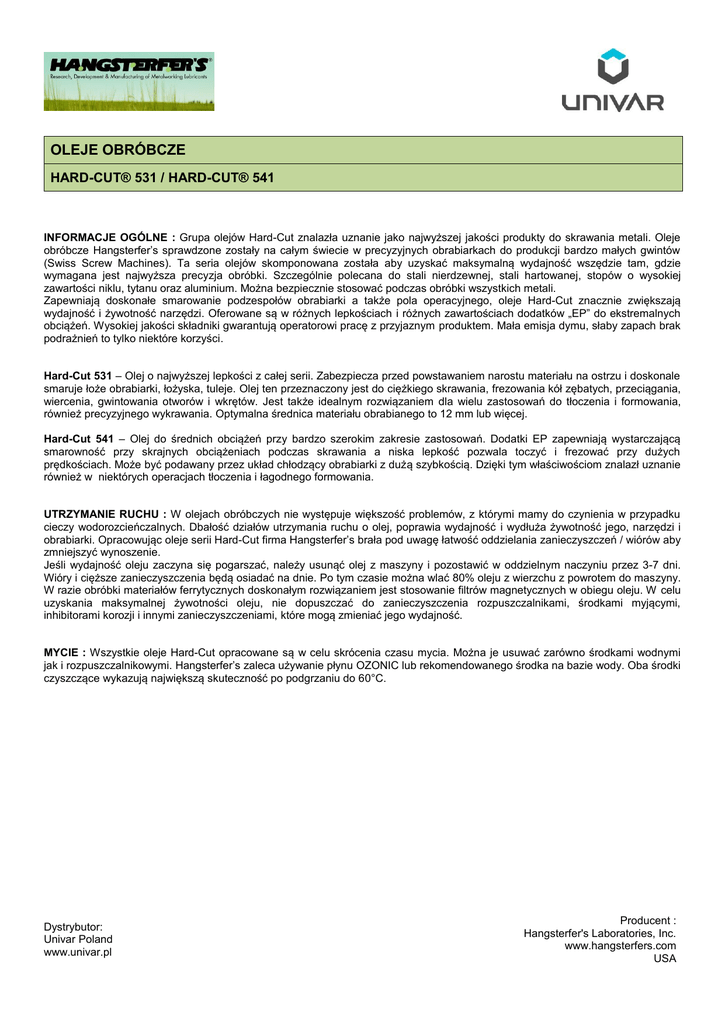 OLEJE OBRÓBCZE HARD-CUT® 531 / HARD-CUT® 541 INFORMACJE OGÓLNE : Grupa olejów Hard-Cut znalazła uznanie jako najwyższej jakości produkty do skrawania metali. Oleje obróbcze Hangsterfer’s sprawdzone zostały na całym świecie w precyzyjnych obrabiarkach do produkcji bardzo małych gwintów (Swiss Screw Machines). Ta seria olejów skomponowana została aby uzyskać maksymalną wydajność wszędzie tam, gdzie wymagana jest najwyższa precyzja obróbki. Szczególnie polecana do stali nierdzewnej, stali hartowanej, stopów o wysokiej zawartości niklu, tytanu oraz aluminium. Można bezpiecznie stosować podczas obróbki wszystkich metali. Zapewniają doskonałe smarowanie podzespołów obrabiarki a także pola operacyjnego, oleje Hard-Cut znacznie zwiększają wydajność i żywotność narzędzi. Oferowane są w różnych lepkościach i różnych zawartościach dodatków „EP” do ekstremalnych obciążeń. Wysokiej jakości składniki gwarantują operatorowi pracę z przyjaznym produktem. Mała emisja dymu, słaby zapach brak podrażnień to tylko niektóre korzyści. Hard-Cut 531 – Olej o najwyższej lepkości z całej serii. Zabezpiecza przed powstawaniem narostu materiału na ostrzu i doskonale smaruje łoże obrabiarki, łożyska, tuleje. Olej ten przeznaczony jest do ciężkiego skrawania, frezowania kół zębatych, przeciągania, wiercenia, gwintowania otworów i wkrętów. Jest także idealnym rozwiązaniem dla wielu zastosowań do tłoczenia i formowania, również precyzyjnego wykrawania. Optymalna średnica materiału obrabianego to 12 mm lub więcej. Hard-Cut 541 – Olej do średnich obciążeń przy bardzo szerokim zakresie zastosowań. Dodatki EP zapewniają wystarczającą smarowność przy skrajnych obciążeniach podczas skrawania a niska lepkość pozwala toczyć i frezować przy dużych prędkościach. Może być podawany przez układ chłodzący obrabiarki z dużą szybkością. Dzięki tym właściwościom znalazł uznanie również w niektórych operacjach tłoczenia i łagodnego formowania. UTRZYMANIE RUCHU : W olejach obróbczych nie występuje większość problemów, z którymi mamy do czynienia w przypadku cieczy wodorozcieńczalnych. Dbałość działów utrzymania ruchu o olej, poprawia wydajność i wydłuża żywotność jego, narzędzi i obrabiarki. Opracowując oleje serii Hard-Cut firma Hangsterfer’s brała pod uwagę łatwość oddzielania zanieczyszczeń / wiórów aby zmniejszyć wynoszenie. Jeśli wydajność oleju zaczyna się pogarszać, należy usunąć olej z maszyny i pozostawić w oddzielnym naczyniu przez 3-7 dni. Wióry i cięższe zanieczyszczenia będą osiadać na dnie. Po tym czasie można wlać 80% oleju z wierzchu z powrotem do maszyny. W razie obróbki materiałów ferrytycznych doskonałym rozwiązaniem jest stosowanie filtrów magnetycznych w obiegu oleju. W celu uzyskania maksymalnej żywotności oleju, nie dopuszczać do zanieczyszczenia rozpuszczalnikami, środkami myjącymi, inhibitorami korozji i innymi zanieczyszczeniami, które mogą zmieniać jego wydajność. MYCIE : Wszystkie oleje Hard-Cut opracowane są w celu skrócenia czasu mycia. Można je usuwać zarówno środkami wodnymi jak i rozpuszczalnikowymi. Hangsterfer’s zaleca używanie płynu OZONIC lub rekomendowanego środka na bazie wody. Oba środki czyszczące wykazują największą skuteczność po podgrzaniu do 60°C. Dystrybutor: Univar Poland www.univar.pl Producent : Hangsterfer's Laboratories, Inc. www.hangsterfers.com USA Hard-Cut® 531 541 Postać Ciecz Ciecz Kolor Czerwona Czerwona Zapach Łagodny Łagodny Ciężar właściwy g/cm3 0,95 0,93 Lepkość cSt @ 40°C 39 28 Punkt zapłonu °C 190 187 Temperatura krzepnięcia °C -18 -18 Rozpuszczalność w wodzie % <0.01 <0.01 Temperatura wrzenia °C 215 226 Prężność par mm Hg / 25° <0.01 <0.01 pH (roztwór 10%) Nie badano Nie badano Chlor Występuje jako dodatek Hard-Cut 531 i Hard-Cut 541 : oferowane są w opakowaniach 19,4 i 213 litrów (5 i 55 galonów) oraz pojemnikach zbiorczych 1066 lub 1279 litrów (275 lub 330 galonów). Wszystkie opakowania dystrybuowane są na całym świecie. Uwaga: Powyższe informacje zgodne są z naszą wiedzą i doświadczeniem. Zastrzegamy sobie prawo do dokonywania zmian w produktach i formulacjach. Firma Hangsterfer’s i jej autoryzowani przedstawiciele nie ponoszą odpowiedzialności za jakiekolwiek straty, szkody lub zobowiązania wynikające z użytkowania produktu w procesach produkcyjnych klienta lub w połączeniu z innymi substancjami. Klient musi przeprowadzić własne testy by zadecydować o przydatności produktu w jego procesie produkcyjnym. Karty charakterystyki produktów Hangsterfer’s są dostępne i aktualizowane sukcesywnie, klient w razie potrzeby powinien je konsultować Dystrybutor: Univar Poland www.univar.pl Producent : Hangsterfer's Laboratories, Inc. www.hangsterfers.com USA