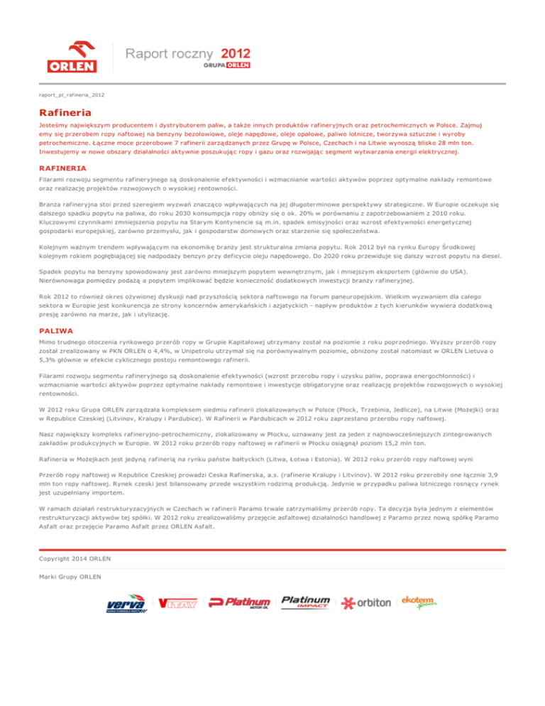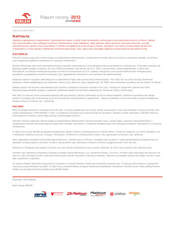 raport_pl_rafineria_2012 Rafineria Jesteśmy największym producentem i dystrybutorem paliw, a także innych produktów rafineryjnych oraz petrochemicznych w Polsce. Zajmuj emy się przerobem ropy naftowej na benzyny bezołowiowe, oleje napędowe, oleje opałowe, paliwo lotnicze, tworzywa sztuczne i wyroby petrochemiczne. Łączne moce przerobowe 7 rafinerii zarządzanych przez Grupę w Polsce, Czechach i na Litwie wynoszą blisko 28 mln ton. Inwestujemy w nowe obszary działalności aktywnie poszukując ropy i gazu oraz rozwijając segment wytwarzania energii elektrycznej. RAFINERIA Filarami rozwoju segmentu rafineryjnego są doskonalenie efektywności i wzmacnianie wartości aktywów poprzez optymalne nakłady remontowe oraz realizację projektów rozwojowych o wysokiej rentowności. Branża rafineryjna stoi przed szeregiem wyzwań znacząco wpływających na jej długoterminowe perspektywy strategiczne. W Europie oczekuje się dalszego spadku popytu na paliwa, do roku 2030 konsumpcja ropy obniży się o ok. 20% w porównaniu z zapotrzebowaniem z 2010 roku. Kluczowymi czynnikami zmniejszenia popytu na Starym Kontynencie są m.in. spadek emisyjności oraz wzrost efektywności energetycznej gospodarki europejskiej, zarówno przemysłu, jak i gospodarstw domowych oraz starzenie się społeczeństwa. Kolejnym ważnym trendem wpływającym na ekonomikę branży jest strukturalna zmiana popytu. Rok 2012 był na rynku Europy Środkowej kolejnym rokiem pogłębiającej się nadpodaży benzyn przy deficycie oleju napędowego. Do 2020 roku przewiduje się dalszy wzrost popytu na diesel. Spadek popytu na benzyny spowodowany jest zarówno mniejszym popytem wewnętrznym, jak i mniejszym eksportem (głównie do USA). Nierównowaga pomiędzy podażą a popytem implikować będzie konieczność dodatkowych inwestycji branży rafineryjnej. Rok 2012 to również okres ożywionej dyskusji nad przyszłością sektora naftowego na forum paneuropejskim. Wielkim wyzwaniem dla całego sektora w Europie jest konkurencja ze strony koncernów amerykańskich i azjatyckich - napływ produktów z tych kierunków wywiera dodatkową presję zarówno na marże, jak i utylizację. PALIWA Mimo trudnego otoczenia rynkowego przerób ropy w Grupie Kapitałowej utrzymany został na poziomie z roku poprzedniego. Wyższy przerób ropy został zrealizowany w PKN ORLEN o 4,4%, w Unipetrolu utrzymał się na porównywalnym poziomie, obniżony został natomiast w ORLEN Lietuva o 5,3% głównie w efekcie cyklicznego postoju remontowego rafinerii. Filarami rozwoju segmentu rafineryjnego są doskonalenie efektywności (wzrost przerobu ropy i uzysku paliw, poprawa energochłonności) i wzmacnianie wartości aktywów poprzez optymalne nakłady remontowe i inwestycje obligatoryjne oraz realizację projektów rozwojowych o wysokiej rentowności. W 2012 roku Grupa ORLEN zarządzała kompleksem siedmiu rafinerii zlokalizowanych w Polsce (Płock, Trzebinia, Jedlicze), na Litwie (Możejki) oraz w Republice Czeskiej (Litvinov, Kralupy i Pardubice). W Rafinerii w Pardubicach w 2012 roku zaprzestano przerobu ropy naftowej. Nasz największy kompleks rafineryjno-petrochemiczny, zlokalizowany w Płocku, uznawany jest za jeden z najnowocześniejszych zintegrowanych zakładów produkcyjnych w Europie. W 2012 roku przerób ropy naftowej w rafinerii w Płocku osiągnął poziom 15,2 mln ton. Rafineria w Możejkach jest jedyną rafinerią na rynku państw bałtyckich (Litwa, Łotwa i Estonia). W 2012 roku przerób ropy naftowej wyni Przerób ropy naftowej w Republice Czeskiej prowadzi Ceska Rafinerska, a.s. (rafinerie Kralupy i Litvinov). W 2012 roku przerobiły one łącznie 3,9 mln ton ropy naftowej. Rynek czeski jest bilansowany przede wszystkim rodzimą produkcją. Jedynie w przypadku paliwa lotniczego rosnący rynek jest uzupełniany importem. W ramach działań restrukturyzacyjnych w Czechach w rafinerii Paramo trwale zatrzymaliśmy przerób ropy. Ta decyzja była jednym z elementów restrukturyzacji aktywów tej spółki. W 2012 roku zrealizowaliśmy przejęcie asfaltowej działalności handlowej z Paramo przez nową spółkę Paramo Asfalt oraz przejęcie Paramo Asfalt przez ORLEN Asfalt. Copyright 2014 ORLEN Marki Grupy ORLEN