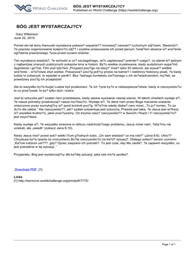 BÓG JEST WYSTARCZAJ?CY Published on World Challenge (https://worldchallenge.org) BÓG JEST WYSTARCZAJ?CY Gary Wilkerson June 22, 2015 Ponad sto lat temu francuski wynalazca pokaza? wspania?? innowacj? nazwan? ruchomym zdj?ciem. Stwierdzi?, ?e poprzez organizowanie kolejno?ci zdj?? i szybkie przesuwanie ich przed jasnym ?wiat?em stwarza si? wra?enie ogl?dania prawdziwego ?ycia przed oczami widzów. Ten wynalazca wiedzia?, ?e wchodzi w co? szczególnego, wi?c zaplanowa? premier? czego?, co stanie si? jednym z najbardziej znanych publicznych pokazów kina w historii. By?o wielkie oczekiwanie, kiedy audytorium wype?nili dygnitarze i go?cie. Film pod tytu?em „Przyjazd poci?gu na stacj?” trwa? tylko 50 sekund, ale wywar? wielkie wra?enie – w?a?ciwie zbyt wielkie. Pokazywa? poci?g jad?cy prosto na kamer? i niektórzy historycy pisali, ?e kiedy ludzie to zobaczyli, to wpadali w panik?. Bez ?adnego kontekstu zwi?zanego z ich do?wiadczeniem, my?leli, ze prawdziwy poci?g ich przejedzie! Ale to wszystko by?a iluzja! Ludzie byli przekonani, ?e ich ?ycie by?o w niebezpiecze?stwie, kiedy w rzeczywisto?ci to co prze?ywali, to by? tylko dym i lustra. Jest to sztuczka jak? szatan nam przedstawia, kiedy stawia wyzwanie naszej wierze. W takich chwilach wydaje si?, ?e nasze potrzeby przekraczaj? nasze mo?liwo?ci. Wydaje si?, ?e dane nam przez Boga marzenie zostanie zniszczone przez wymykaj?cy si? spod kontroli poci?g. W?a?nie wtedy diabe? nam mówi, „To ju? koniec. To za du?o dla ciebie.” Ale rzeczywisto??, jak? szatan prezentuje jest sztuczna. Prawda jest taka, ?e Jezus jest wi?kszy ni? wszelkie trudno?ci, jakie prze?ywamy. On trzyma nasz? rzeczywisto?? w Swoich r?kach i t? rzeczywisto?ci? jest zwyci?stwo. Kiedy wydaje si?, ?e wszystko stracone w obliczu nadchodz?cego problemu, Jezus mówi nam, ?eby?my nie uciekali, ale „usiedli” (zobacz Jana 6:10). Kiedy Jezus mia? przed sob? wielki t?um g?odnych ludzi, „On sam wiedzia? co ma robi?” (Jana 6:6). Ufno?? Chrystusa by?a oparta na zrozumieniu Bo?ej rzeczywisto?ci za ka?d? sytuacj?. Dlatego poleci? swoim uczniom: „Ka?cie ludziom usi???, gdy? Ojciec zaspokoi ich potrzeb?. To jest czas, aby Mu zaufa?, ?e zapewni wszystko, co jest potrzebne w tej sytuacji..” Przyjacielu, Bóg jest wystarczaj?cy dla ka?dej sytuacji, jaka nas mo?e spotka?. Download PDF [1] Links [1] http://sermons.worldchallenge.org/printpdf/7775/ Page 1 of 1