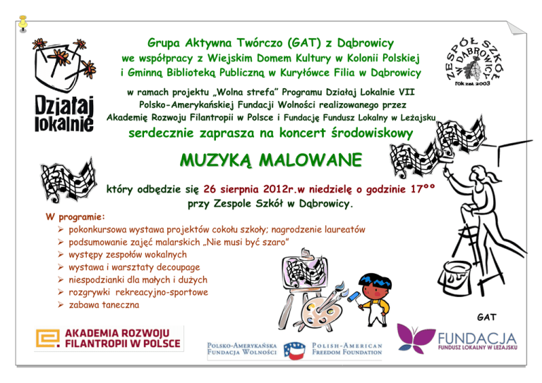 Grupa Aktywna Twórczo (GAT) z Dąbrowicy we współpracy z Wiejskim Domem Kultury w Kolonii Polskiej i Gminną Biblioteką Publiczną w Kuryłówce Filia w Dąbrowicy w ramach projektu „Wolna strefa” Programu Działaj Lokalnie VII Polsko-Amerykańskiej Fundacji Wolności realizowanego przez Akademię Rozwoju Filantropii w Polsce i Fundację Fundusz Lokalny w Leżajsku serdecznie zaprasza na koncert środowiskowy MUZYKĄ MALOWANE który odbędzie się 26 sierpnia 2012r.w niedzielę o godzinie 17ºº przy Zespole Szkół w Dąbrowicy. W programie: pokonkursowa wystawa projektów cokołu szkoły; nagrodzenie laureatów podsumowanie zajęć malarskich „Nie musi być szaro” występy zespołów wokalnych wystawa i warsztaty decoupage niespodzianki dla małych i dużych rozgrywki rekreacyjno-sportowe zabawa taneczna GAT