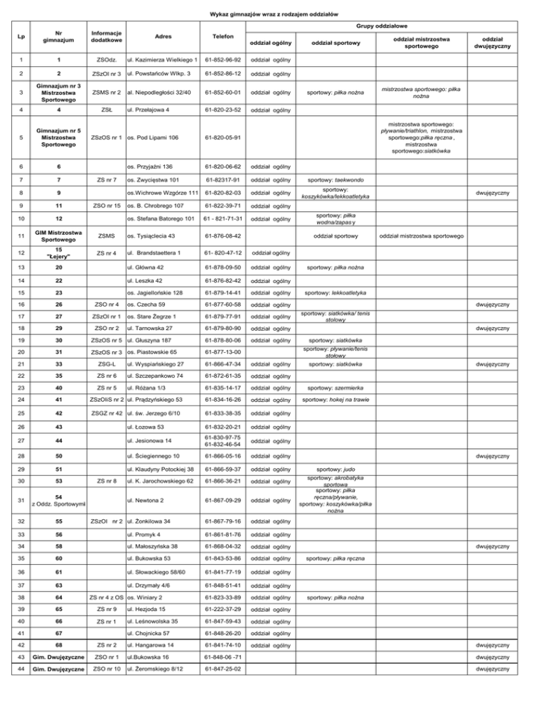 Wykaz gimnazjów wraz z rodzajem oddziałów Grupy oddziałowe Nr gimnazjum Informacje dodatkowe Adres 1 1 ZSOdz. ul. Kazimierza Wielkiego 1 61-852-96-92 oddział ogólny 2 2 ZSzOI nr 3 ul. Powstańców Wlkp. 3 61-852-86-12 oddział ogólny 3 Gimnazjum nr 3 Mistrzostwa Sportowego ZSMS nr 2 al. Niepodległości 32/40 61-852-60-01 oddział ogólny 4 4 ZSŁ ul. Przełajowa 4 61-820-23-52 oddział ogólny 5 Gimnazjum nr 5 Mistrzostwa Sportowego 6 6 7 7 8 9 9 11 10 12 11 GIM Mistrzostwa Sportowego 12 15 "Łejery" 13 Lp Telefon oddział ogólny ZSzOS nr 1 os. Pod Lipami 106 os. Przyjaźni 136 oddział sportowy oddział mistrzostwa sportowego sportowy: piłka nożna mistrzostwa sportowego: piłka nożna mistrzostwa sportowego: pływanie/triathlon, mistrzostwa sportowego:piłka ręczna , mistrzostwa sportowego:siatkówka 61-820-05-91 61-820-06-62 oddział ogólny os. Zwycięstwa 101 61-82317-91 oddział ogólny sportowy: taekwondo os.Wichrowe Wzgórze 111 61-820-82-03 oddział ogólny sportowy: koszykówka/lekkoatletyka os. B. Chrobrego 107 61-822-39-71 oddział ogólny os. Stefana Batorego 101 61 - 821-71-31 oddział ogólny ZSMS os. Tysiąclecia 43 61-876-08-42 ZS nr 4 ul. Brandstaettera 1 61- 820-47-12 oddział ogólny 20 ul. Główna 42 61-878-09-50 oddział ogólny 14 22 ul. Leszka 42 61-876-82-42 oddział ogólny 15 23 os. Jagiellońskie 128 61-879-14-41 oddział ogólny 16 26 ZSO nr 4 os. Czecha 59 61-877-60-58 oddział ogólny 17 27 ZSzOI nr 1 os. Stare Żegrze 1 61-879-77-91 oddział ogólny 18 29 ul. Tarnowska 27 61-879-80-90 oddział ogólny 19 30 ZSzOS nr 5 ul. Głuszyna 187 61-878-80-06 oddział ogólny 20 31 ZSzOS nr 3 os. Piastowskie 65 61-877-13-00 21 33 ZSG-L ul. Wyspiańskiego 27 61-866-47-34 oddział ogólny 22 35 ZS nr 6 ul. Szczepankowo 74 61-872-61-35 oddział ogólny 23 40 ZS nr 5 ul. Różana 1/3 61-835-14-17 oddział ogólny sportowy: szermierka 24 41 ZSzOIiS nr 2 ul. Prądzyńskiego 53 61-834-16-26 oddział ogólny sportowy: hokej na trawie 25 42 ZSGZ nr 42 ul. św. Jerzego 6/10 61-833-38-35 oddział ogólny 26 43 ul. Łozowa 53 61-832-20-21 oddział ogólny oddział ogólny ZS nr 7 ZSO nr 15 ZSO nr 2 oddział dwujęzyczny dwujęzyczny sportowy: piłka wodna/zapas y oddział sportowy oddział mistrzostwa sportowego sportowy: piłka nożna sportowy: lekkoatletyka dwujęzyczny sportowy: siatkówka/ tenis stolowy dwujęzyczny sportowy: siatkówka sportowy: pływanie/tenis stołowy sportowy: siatkówka dwujęzyczny 27 44 ul. Jesionowa 14 61-830-97-75 61-832-46-54 28 50 ul. Ściegiennego 10 61-866-05-16 oddział ogólny 29 51 ul. Klaudyny Potockiej 38 61-866-59-37 oddział ogólny 30 53 ul. K. Jarochowskiego 62 61-866-36-21 oddział ogólny 31 54 z Oddz. Sportowymi ul. Newtona 2 61-867-09-29 oddział ogólny 32 55 61-867-79-16 oddział ogólny 33 56 ul. Promyk 4 61-861-81-76 oddział ogólny 34 58 ul. Małoszyńska 38 61-868-04-32 oddział ogólny 35 60 ul. Bukowska 53 61-843-53-86 oddział ogólny 36 61 ul. Słowackiego 58/60 61-841-77-19 oddział ogólny 37 63 ul. Drzymały 4/6 61-848-51-41 oddział ogólny 38 64 61-823-33-89 oddział ogólny 39 65 ZS nr 9 ul. Hezjoda 15 61-222-37-29 oddział ogólny 40 66 ZS nr 1 ul. Leśnowolska 35 61-847-59-43 oddział ogólny 41 67 ul. Chojnicka 57 61-848-26-20 oddział ogólny 42 68 ul. Hangarowa 14 61-841-74-10 oddział ogólny 43 Gim. Dwujęzyczne ZSO nr 1 ul.Bukowska 16 61-848-06 -71 dwujęzyczny 44 Gim. Dwujęzyczne ZSO nr 10 ul. Żeromskiego 8/12 61-847-25-02 dwujęzyczny ZS nr 8 ZSzOI nr 2 ul. Żonkilowa 34 ZS nr 4 z OS os. Winiary 2 ZS nr 2 dwujęzyczny sportowy: judo sportowy: akrobatyka sportowa sportowy: piłka ręczna/pływanie, sportowy: koszykówka/piłka nożna dwujęzyczny sportowy: piłka ręczna sportowy: piłka nożna dwujęzyczny