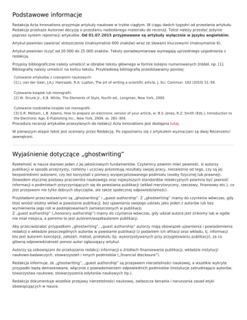Podstawowe informacje Redakcja Acta Innovations przyjmuje artykuły naukowe w trybie ciągłym. W ciągu dwóch tygodni od przesłania artykułu Redakcja przekaże Autorowi decyzję o przesłaniu nadesłanego materiału do recenzji. Tekst należy przesłać jedynie poprzez system rejestracji artykułów. Od 01.07.2015 przyjmowane są artykuły wyłącznie w języku angielskim. Artykuł powinien zawierać streszczenie (maksymalnie 600 znaków) wraz ze słowami kluczowymi (maksymalnie 6). Artykuł powinien liczyć od 20 000 do 25 000 znaków. Teksty ponadwymiarowe wymagają uprzedniego uzgodnienia z redakcją. Przypisy bibliograficzne należy umieścić w obrębie tekstu głównego w formie kolejno numerowanych źródeł, np. [1]. Bibliografię należy umieścić na końcu tekstu. Przykładową bibliografię przedstawiamy poniżej: Cytowanie artykułów z czasopism naukowych: [1] J. van der Geer, J.A.J. Hanraads, R.A. Lupton, The art of writing a scientific article, J. Sci. Commun. 163 (2010) 51–59. Cytowanie książek lub monografii: [2] W. Strunk Jr., E.B. White, The Elements of Style, fourth ed., Longman, New York, 2000. Cytowanie rozdziałów książek lub monografii: [3] G.R. Mettam, L.B. Adams, How to prepare an electronic version of your article, w: B.S. Jones, R.Z. Smith (Eds.), Introduction to the Electronic Age, E-Publishing Inc., New York, 2009, ss. 281–304. Procedura recenzji artykułów przesyłanych do redakcji Acta Innovations jest dostępna tutaj. W pierwszym etapie tekst jest oceniany przez Redakcję. Po zapoznaniu się z artykułem wyznaczani są dwaj Recenzenci zewnętrzni. Wyjaśnienie dotyczące „ghostwriting” Rzetelność w nauce stanowi jeden z jej jakościowych fundamentów. Czytelnicy powinni mieć pewność, iż autorzy publikacji w sposób przejrzysty, rzetelny i uczciwy prezentują rezultaty swojej pracy, niezależnie od tego, czy są jej bezpośrednimi autorami, czy też korzystali z pomocy wyspecjalizowanego podmiotu (osoby fizycznej lub prawnej). Dowodem etycznej postawy pracownika naukowego oraz najwyższych standardów redakcyjnych powinna być jawność informacji o podmiotach przyczyniających się do powstania publikacji (wkład merytoryczny, rzeczowy, finansowy etc.), co jest przejawem nie tylko dobrych obyczajów, ale także społecznej odpowiedzialności. Przykładami przeciwstawnymi są „ghostwriting” i „guest authorship”. Z „ghostwriting” mamy do czynienia wówczas, gdy ktoś wniósł istotny wkład w powstanie publikacji, bez ujawnienia swojego udziału jako jeden z autorów lub bez wymienienia jego roli w podziękowaniach zamieszczonych w publikacji. Z „guest authorship” („honorary authorship”) mamy do czynienia wówczas, gdy udział autora jest znikomy lub w ogóle nie miał miejsca, a pomimo to jest autorem/współautorem publikacji. Aby przeciwdziałać przypadkom „ghostwriting”, „guest authorship” autorzy mają obowiązek ujawnienia i powiadomienia redakcji o wkładzie poszczególnych autorów w powstanie publikacji (z podaniem ich afiliacji oraz wkładu, tj. informacji kto jest autorem koncepcji, założeń, metod, protokołu itp. wykorzystywanych przy przygotowaniu publikacji), za co główną odpowiedzialność ponosi autor zgłaszający artykuł. Autorzy są zobowiązani do przekazania redakcji informacji o źródłach finansowania publikacji, wkładzie instytucji naukowo-badawczych, stowarzyszeń i innych podmiotów („financial disclosure”). Redakcja informuje, że „ghostwriting”, „guest authorship” są przejawem nierzetelności naukowej, a wszelkie wykryte przypadki będą demaskowane, włącznie z powiadomieniem odpowiednich podmiotów (instytucje zatrudniające autorów, towarzystwa naukowe, stowarzyszenia edytorów naukowych itp.). Redakcja dokumentuje wszelkie przejawy nierzetelności naukowej, zwłaszcza łamania i naruszania zasad etyki obowiązujących w nauce. Kryteria dopuszczenia artykułu do publikacji w Acta Innovations 1. Artykuł powinien zostać napisany zgodnie z profilem Acta Innovations. 2. Tytuł artykułu powinien dobrze odzwierciedlać jego zawartość. 3. Artykuł powinien zawierać: a) tytuł w języku angielskim b) streszczenie i słowa kluczowe w języku angielskim c) właściwe podpisy rysunków i tabel d) prawidłowe cytowanie zgodne z zasadami obowiązującymi w Acta Innovations e) prawidłowo sporządzoną bibliografię. 4. Artykuł powinien być napisany poprawnym stylistycznie językiem. 5. Artykuł powinien prezentować wyniki oryginalnych badań o charakterze empirycznym, teoretycznym, technicznym lub analitycznym. 6. Artykuł powinien przedstawiać obecny stan wiedzy, metodykę badań i przebieg procesu badawczego. 7. Interpretacja wyników oraz wnioski powinny być logiczne i uzasadnione. Do pobrania Wzór formatowania w języku angielskim Automatyczne style bibliograficzne (do fakultatywnego stosowania przez Autorów) Poniższe pliki .xsl należy umieścić w katalogu C:\Program Files\Microsoft Office\Office12\Bibliography\Style. ieee_pl.xsl ieee_reference.xsl Strona CBI Pro-Akademia używa ciasteczek (cookies), dzięki którym nasz serwis może działać lepiej. Zobacz
