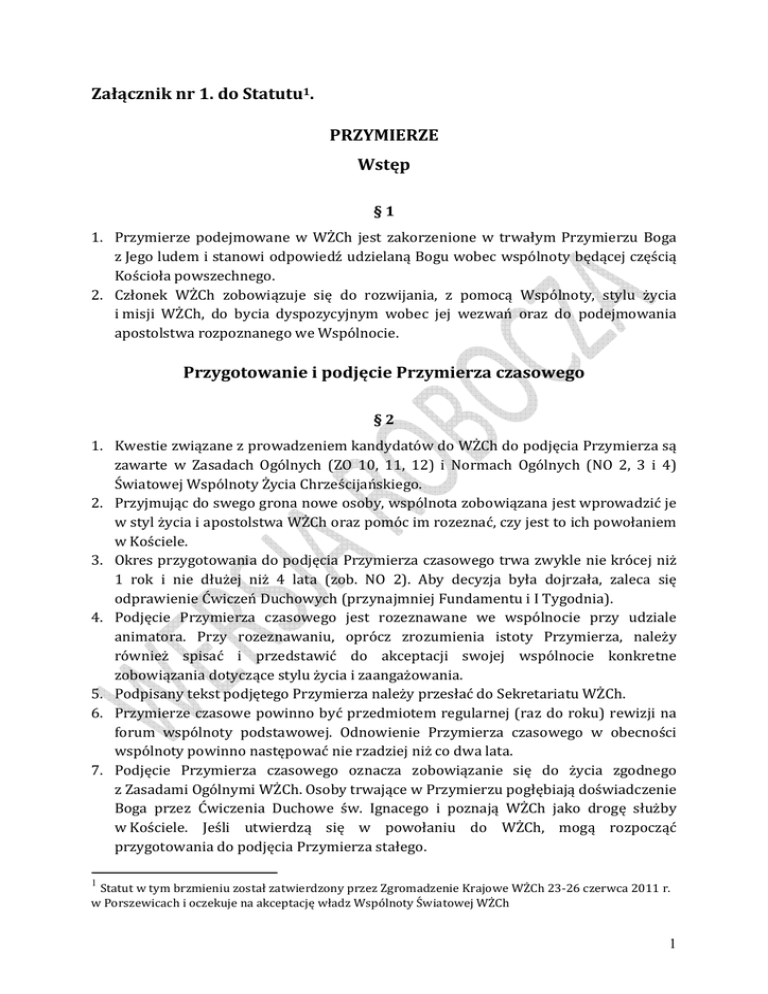 Załącznik nr 1. do Statutu1. PRZYMIERZE Wstęp §1 1. Przymierze podejmowane w WŻCh jest zakorzenione w trwałym Przymierzu Boga z Jego ludem i stanowi odpowiedź udzielaną Bogu wobec wspólnoty będącej częścią Kościoła powszechnego. 2. Członek WŻCh zobowiązuje się do rozwijania, z pomocą Wspólnoty, stylu życia i misji WŻCh, do bycia dyspozycyjnym wobec jej wezwań oraz do podejmowania apostolstwa rozpoznanego we Wspólnocie. Przygotowanie i podjęcie Przymierza czasowego §2 1. Kwestie związane z prowadzeniem kandydatów do WŻCh do podjęcia Przymierza są zawarte w Zasadach Ogólnych (ZO 10, 11, 12) i Normach Ogólnych (NO 2, 3 i 4) Światowej Wspólnoty Życia Chrześcijańskiego. 2. Przyjmując do swego grona nowe osoby, wspólnota zobowiązana jest wprowadzić je w styl życia i apostolstwa WŻCh oraz pomóc im rozeznać, czy jest to ich powołaniem w Kościele. 3. Okres przygotowania do podjęcia Przymierza czasowego trwa zwykle nie krócej niż 1 rok i nie dłużej niż 4 lata (zob. NO 2). Aby decyzja była dojrzała, zaleca się odprawienie Ćwiczeń Duchowych (przynajmniej Fundamentu i I Tygodnia). 4. Podjęcie Przymierza czasowego jest rozeznawane we wspólnocie przy udziale animatora. Przy rozeznawaniu, oprócz zrozumienia istoty Przymierza, należy również spisać i przedstawić do akceptacji swojej wspólnocie konkretne zobowiązania dotyczące stylu życia i zaangażowania. 5. Podpisany tekst podjętego Przymierza należy przesłać do Sekretariatu WŻCh. 6. Przymierze czasowe powinno być przedmiotem regularnej (raz do roku) rewizji na forum wspólnoty podstawowej. Odnowienie Przymierza czasowego w obecności wspólnoty powinno następować nie rzadziej niż co dwa lata. 7. Podjęcie Przymierza czasowego oznacza zobowiązanie się do życia zgodnego z Zasadami Ogólnymi WŻCh. Osoby trwające w Przymierzu pogłębiają doświadczenie Boga przez Ćwiczenia Duchowe św. Ignacego i poznają WŻCh jako drogę służby w Kościele. Jeśli utwierdzą się w powołaniu do WŻCh, mogą rozpocząć przygotowania do podjęcia Przymierza stałego. 1 Statut w tym brzmieniu został zatwierdzony przez Zgromadzenie Krajowe WŻCh 23-26 czerwca 2011 r. w Porszewicach i oczekuje na akceptację władz Wspólnoty Światowej WŻCh 1 Przymierze stałe i jego warunki §3 1. Przymierze stałe jest owocem rozeznania powołania do WŻCh, aktem woli oraz deklaracją, aby swoją drogę do zbawienia realizować w duchowości WŻCh. 2. Warunki podjęcia Przymierza stałego: − odprawienie pełnych Ćwiczeń Duchowych w dowolnej formie: w ciągu życia lub w odosobnieniu, rozłożonych na kilka lat albo 30-dniowych (zob. NO 4) bądź kilkakrotny udział w rekolekcjach ignacjańskich i doświadczenie pełnego procesu Ćwiczeń w życiu; − podejmowanie rozeznanej misji z Jezusem. 3. Okres pomiędzy złożeniem po raz pierwszy Przymierza czasowego a podjęciem Przymierza stałego powinien trwać nie krócej niż 2 lata i nie dłużej niż 8 lat (zob. NO 3). 4. Podjęcie Przymierza stałego wymaga rozeznania we wspólnocie i akceptacji przez władzę wspólnoty lokalnej, a w razie jej braku – przez Radę Wykonawczą. O zamiarze podjęcia Przymierza należy pisemnie powiadomić Radę Wykonawczą i uzyskać potwierdzenie tej decyzji (zob. Statut § 16 p. 14). 5. Kopię tekstu Przymierza stałego, wraz z datą i miejscem jego złożenia, własnoręcznym podpisem oraz z potwierdzeniem przez odpowiednie władze, należy niezwłocznie przesłać do Sekretariatu WŻCh. Ogólny tekst Przymierza WŻCh w Polsce: W odpowiedzi na dar miłości Boga do mnie pragnę coraz bardziej kochać i naśladować Jezusa Chrystusa oraz uczestniczyć w Jego misji. Podejmuję Przymierze czasowe (stałe) z Bogiem obecnym i działającym we Wspólnocie Życia Chrześcijańskiego, rozumiejąc je tak, jak jest to opisane w Zasadach Ogólnych WŻCh. Zobowiązuję się, z pomocą Wspólnoty, do realizacji stylu życia i apostołowania, jaki proponuje Wspólnota Życia Chrześcijańskiego, czerpiąc z osobistego doświadczenia Ćwiczeń Duchowych św. Ignacego. Świadomy(a) swoich słabości i ograniczeń proszę Boga w Trójcy Jedynego, aby dopomógł mi dochować wierności Przymierzu. Proszę też Maryję, szczególną Opiekunkę naszej Wspólnoty, o wstawiennictwo w jego realizacji. Amen. Można też przygotować własny tekst Przymierza, w którym niezbędne są następujące zdania: Podejmuję Przymierze czasowe (stałe) z Bogiem obecnym i działającym we Wspólnocie Życia Chrześcijańskiego, rozumiejąc je tak, jak jest to opisane w Zasadach Ogólnych WŻCh. Zobowiązuję się, z pomocą Wspólnoty, do realizacji stylu życia i apostołowania, jaki proponuje Wspólnota Życia Chrześcijańskiego. 2
