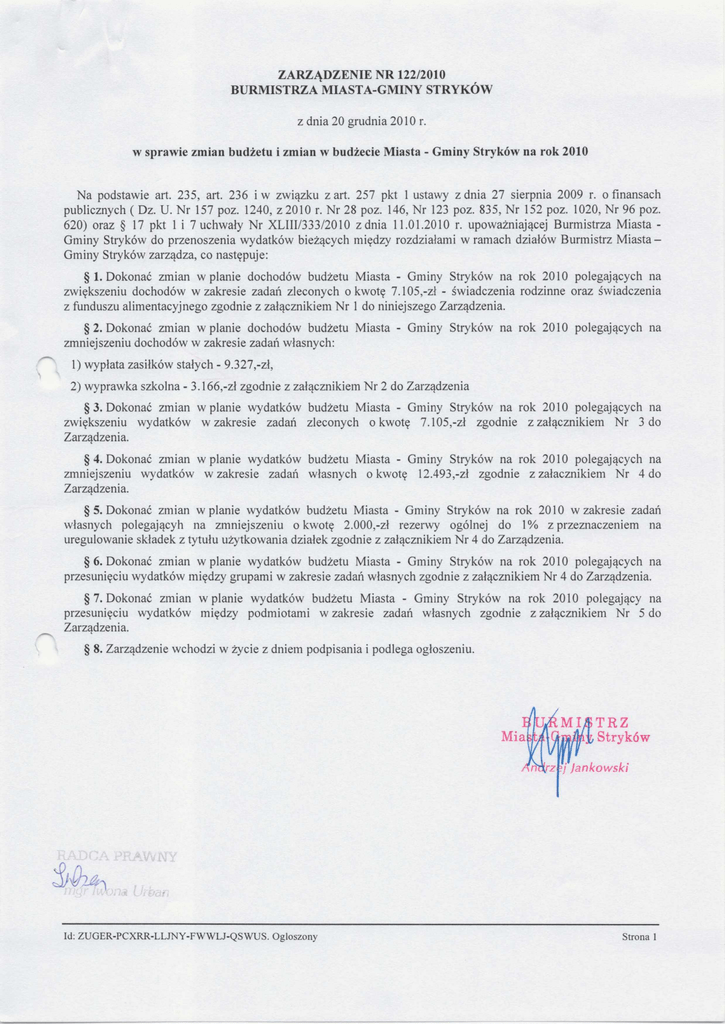 ZARZĄDZENIE NR 122/2010 BURMISTRZA MIASTA-GMINY STRYKÓW z dnia 20 grudnia 2010 r. w sprawie zmian budżetu i zmian w budżecie Miasta - Gminy Stryków na rok 2010 Na podstawie art. 235, art. 236 iw związku żart. 257 pkt 1 ustawy z dnia 27 sierpnia 2009 r. o finansach publicznych ( Dz. U. Nr 157 poz. 1240, z 2010 r. Nr 28 poz. 146, Nr 123 poz. 835, Nr 152 poz. 1020, Nr 96 poz. 620) oraz § 17 pkt 1 i 7 uchwały Nr XLlII/333/2010 z dnia 11.01.2010 r. upoważniającej Burmistrza Miasta Gminy Stryków do przenoszenia wydatków bieżących między rozdziałami w ramach działów Burmistrz Miasta Gminy Stryków zarządza, co następuje: § 1. Dokonać zmian w planie dochodów budżetu Miasta - Gminy Stryków na rok 2010 polegających na zwiększeniu dochodów w zakresie zadań zleconych o kwotę 7.105,-zł - świadczenia rodzinne oraz świadczenia z funduszu alimentacyjnego zgodnie z załącznikiem Nr 1 do niniejszego Zarządzenia. § 2. Dokonać zmian w planie dochodów budżetu Miasta - Gminy Stryków na rok 2010 polegających na zmniejszeniu dochodów w zakresie zadań własnych: 1) wypłata zasiłków stałych - 9.327,-zł, 2) wyprawka szkolna - 3.166,-zł zgodnie z załącznikiem Nr 2 do Zarządzenia § 3. Dokonać zmian w planie wydatków budżetu Miasta - Gminy Stryków na rok 2010 polegających na zwiększeniu wydatków w zakresie zadań zleconych o kwotę 7.105,-zł zgodnie z załącznikiem Nr 3 do Zarządzenia. § 4. Dokonać zmian w planie wydatków budżetu Miasta - Gminy Stryków na rok 2010 polegających na zmniejszeniu wydatków w zakresie zadań własnych o kwotę 12.493,-zł zgodnie z załącznikiem Nr 4 do Zarządzenia. § 5. Dokonać zmian w planie wydatków budżetu Miasta - Gminy Stryków na rok 2010 w zakresie zadań własnych polegającyh na zmniejszeniu o kwotę 2.000,-zł rezerwy ogólnej do 1% z przeznaczeniem na uregulowanie składek z tytułu użytkowania działek zgodnie z załącznikiem Nr 4 do Zarządzenia. § 6. Dokonać zmian w planie wydatków budżetu Miasta - Gminy Stryków na rok 2010 polegających na przesunięciu wydatków między grupami w zakresie zadań własnych zgodnie z załącznikiem Nr 4 do Zarządzenia. § 7. Dokonać zmian w planie wydatków budżetu Miasta - Gminy Stryków na rok 2010 polegający na przesunięciu wydatków między podmiotami w zakresie zadań własnych zgodnie z załącznikiem Nr 5 do Zarządzenia. § 8. Zarządzenie wchodzi w życie z dniem podpisania i podlega ogłoszeniu. Mia MIJSTRZ mMh Stryków 7 Jankowski Id: ZUGER-PCXRR-LLJNY-FWWLJ-QSWUS. Ogłoszony Strona 1 Załącznik Nr 1 do Zarządzenia Nr 122/2010 Burmistrza Miasta-Gminy Stryków z dnia 20 grudnia 2010 r. Zmiany budżetu Miasta - Gminy Stryków po stronie dochodów - zadania zlecone Dz. Rozdz. K wota zwiększenia zl W yszczególnienie § 7.105,00 Pom oc społeczna 852 85212 ubezpieczenia 7.105,00 2010 Dotacje celowe otrzym ane z budżetu państw a na realizację zadań bieżących z zakresu adm inistracji rządowej oraz innych zadań zleconych gm inie (związkom gm in) ustawami 7.105,00 Św iadczenia rodzinne, św iadczenia z funduszu em erytalne i rentow e z ubezpieczenia społecznego alim entacyjnego oraz składki na 7.105,00 Razem zadania zlecone b il £ Miasta-C Andrz Id: ZUGER-PCXRR-LLJNY-FWWLJ-QSWUS. Ogłoszony Strona 1 Załącznik Nr 2 do Zarządzenia Nr 122/2010 Burmistrza Miasta-Gminy Stryków z dnia 20 grudnia 2010 r. Zmiany budżetu Miasta - Gminy Stryków po stronie dochodów - zadania własne Dz. Rozdz. 852 Kwota zm niejszenia zł W yszczególnienie § 9.327,00 Pomoc społeczna 85216 9.327,00 Zasiłki stałe 2030 Dotacje celowe otrzym ane z budżetu państw a na realizację własnych zadań bieżących gmin (zw iązków gm in) 854 3.166,00 Edukacyjna opieka w ychow aw cza 85415 9.327,00 3.166,00 Pom oc m aterialna dla uczniów 2030 Dotacje celowe otrzym ane z budżetu państwa na realizację własnych zadań bieżących gmin (zw iązków gm in) 3.166,00 12.493,00 Razem zadania własne B ij Miast IS/TRZ tryków Anchęz&j J akowski Id: ZUGER-PCXRR-LLJNY-FWWLJ-QSWUS. Ogłoszony Strona 1 Załącznik Nr 3 do Zarządzenia Nr 122/2010 Burmistrza Miasta-Gminy Stryków z dnia 20 grudnia 2010 r. Zmiany budżetu Miasta - Gminy Stryków po stronie wydatków - zadania zlecone Dz. Rozdz. 1 Grupa wydatków 2 852 Kwota zwiększenia zl 4 3 Pomoc społeczna 85212 7.105,00 Św iadczenia rodzinne, św iadczenia z funduszu alim entacyjnego oraz składki na ubezpieczenia emerytalne i rentowe z ubezpieczenia społecznego 7.105,00 W ydatki bieżące - św iadczenia na rzecz osób fizycznych 4.842,00 W ydatki bieżące - w ynagrodzenia i składki od nich naliczane 2.263,00 Razem zadania zlecone 7.105,00 BU Miasta A ndr Id: ZUGER-PCXRR-LLJNY-FWWLJ-QSWUS. Ogłoszony RZ tryków kow ski Strona 1 Załącznik Nr 4 do Zarządzenia Nr 122/2010 Burmistrza Miasta-Gminy Stryków z dnia 20 grudnia 2010 r. Zmiany budżetu Miasta - Gminy Stryków po stronie wydatków - zadania własne Dz. Rozdz. 1 Grupa wydatków 2 700 3 G ospodarka m ieszkaniow a 70005 Gospodarka gruntam i i nieruchom ościam i Kwota K wota zwiększenia zm niejszenia z! zł 4 5 2.000,00 2.000,00 W ydatki bieżące - wydatki zw iązane z realizacją ich statutow ych zadań 2.000,00 750 Adm inistracja publiczna 75022 10.000,00 10.000,00 Rady gmin (m iast i m iast na prawach powiatu) 5.000,00 5.000,00 W ydatki bieżące - św iadczenia na rzecz osób fizycznych 5.000,00 W ydatki bieżące —w ydatki zw iązane z realizacją ich statutow ych zadań 75023 5.000,00 Urzędy gm in (m iast i m iast na praw ach powiatu) 1.000,00 W ydatki bieżące - św iadczenia na rzecz osób fizycznych 1.000,00 W ydatki bieżące - w ynagrodzenia i składki od nich naliczane 75095 1.000,00 Pozostała działalność 4.000,00 W ydatki bieżące - św iadczenia na rzecz osób fizycznych 4.000,00 W ydatki bieżące - w ydatki zw iązane z realizacją ich statutow ych zadań 758 801 80103 2.000,00 Rezerwy ogólne i celowe 2.000,00 W ydatki bieżą