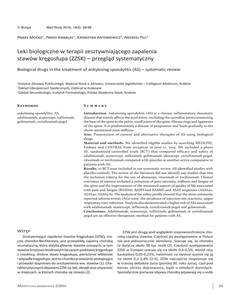 © Borgis Med Rodz 2016; 19(2): 59-69 Paweł Moćko1, Paweł Kawalec1, Katarzyna Antoniewicz2, Andrzej Pilc3 Leki biologiczne w terapii zesztywniającego zapalenia stawów kręgosłupa (ZZSK) – przegląd systematyczny Biological drugs in the treatment of ankylosing spondylitis (AS) – systematic review Instytut Zdrowia Publicznego, Wydział Nauk o Zdrowiu, Uniwersytet Jagielloński – Collegium Medicum, Kraków Zakład Ubezpieczeń Społecznych, Oddział w Krakowie 3 Zakład Neurobiologii, Instytut Farmakologii, Polska Akademia Nauk, Kraków 1 2 Keywords Summary ankylosing spondylitis, AS, adalimumab, etanercept, infliximab, golimumab, certolizumab pegol Introduction. Ankylosing spondylitis (AS) is a chronic inflammatory rheumatic disease that mainly affects the axial joints, including the sacroiliac joints connecting the base of the spine to the pelvis, small joints of the spine, fibrous rings and ligaments of the spine. It is predominantly a disease of progressive and leads gradually to the above-mentioned joint stiffness. Aim. Presentation of current and alternative therapies of AS using biological drugs. Material and methods. We identified eligible studies by searching MEDLINE, Embase and CENTRAL from inception to June 17, 2014. We included a phase III, randomized controlled trials (RCT) that compared efficacy and safety of adalimumab, etanercept, infliximab, golimumab, abatacept, certolizumab pegol, rituximab or tocilizumab compared with placebo or another active comparator in patients with AS. Results. 10 RCT were included in our systematic review. All identified studies with placebo controls. The review of the literature did not identify any studies that met the inclusion criteria for the use of abatacept, rituximab or tocilizumab. Clinical outcomes of interest included a reduction of pain intensity, stiffness and fatigue of the spine and the improvement of the measured aspects of quality of life associated with pain and fatigue (BASDAI, BASFI and BASMI) and ASAS responses (ASAS20, ASAS40, ASAS5/6). The analysis of the safety profile showed that the most commonly reported adverse events (AEs) were: the incidence of injection site reactions, upper respiratory tract infection. Analysis also demonstrated a higher risk of AEs associated with adalimumab, etanercept, infliximab, certolizumab pegol and golimumab. Conclusions. Adalimumab, etanercept, infliximab, golimumab or certolizumab pegol are an effective therapeutic method for patients with AS. Wstęp Zesztywniające zapalenie stawów kręgosłupa (ZZSK), inaczej choroba Bechterewa, jest przewlekłą zapalną chorobą reumatyczną, która dotyka głównie stawów osiowych, w tym stawów krzyżowo-biodrowych łączących podstawę kręgosłupa z miednicą, drobne stawy kręgosłupa, pierścienie włókniste i więzadła kręgosłupa. Jest to choroba przeważnie postępująca i prowadzi stopniowo do zesztywnienia ww. stawów (1). Charakterystycznymi objawami ZZSK są: ból, obrzęk oraz sztywność w miejscach, w których choroba się rozwija (2). Medycyna rodzinna 2/2016 ZZSK jest drugą pod względem rozpowszechnienia chorobą zapalną stawów. Częstość jej występowania w Polsce nie jest jednoznacznie określona. Szacuje się, że choroba ta dotyczy około 38 tys. osób (2). Częstość występowania ZZSK w Europie szacuje się na około 0,3-0,5%, wśród rasy kaukaskiej 0,05-0,23%, natomiast na świecie ocenia się ją na około 0,2-1,4% (2-4). ZZSK najczęściej rozpoznaje się w trzeciej dekadzie życia (poniżej 30. roku życia), czyli pod koniec okresu dojrzewania, bądź u młodych dorosłych. Sporadycznie pierwsze objawy choroby pojawiają się u osób 59 Paweł Moćko i wsp. powyżej 40. roku życia (4). Częściej na chorobę zapadają mężczyźni (65-80%), przy czym choroba ma u nich ostrzejszy przebieg (2). ZZSK stanowi poważny problemem dla zdrowia publicznego. Dotyka przede wszystkim osób młodych, które znajdują się w okresie największej aktywności zawodowej, w związku z czym zmniejszona produktywność powoduje ogromne starty dla społeczeństwa. Absencja chorobowa z powodu ZZSK w 2013 roku wynosiła blisko 108 tys. dni, a w 2012 roku – 105 tys. dni. W 2011 roku z powodu ZZSK rehabilitacji zostało poddane 170 osób, w tym 160 mężczyzn i 10 kobiet (5). Do tej pory nie została poznana etiologia ZZSK. W patogenezie choroby ważną rolę odgrywają limfocyty T. Badania immunohistochemiczne zmienionych zapalnie stawów wykazały obecność nacieków złożonych z limfocytów T CD4+ i CD8+ oraz makrofagów (4). Zostały również udowodnione znacznie zwiększone nacieki komórek jednojądrzastych wykazujących obecność mRNA dla TNF-α w tkance chrzęstnej stawów krzyżowo-biodrowych oraz przyczepów ścięgnistych u chorych na ZZSK. W związku z tym w leczeniu choroby stosuje się leki biologiczne, tzw. blokery TNF-α, które zobojętniają cytokiny prozapalne i prowadzą do zahamowania rozwoju choroby (1). Ze względu na stopniowe narastanie symptomów początek choroby jest najczęściej trudny do uchwycenia. Objawy podmiotowe obejmują: ze strony narządu wzroku – zapalenie przedniego odcinka błony naczyniowej oka; układu ruchu – ból w okolicy lędźwiowo-krzyżowej, promieniujący do pachwin, pośladków i stawów kolanowych, zapalenie stawów kolanowych i skokowych; układu krążenia – niedomykalność zastawki aortalnej, zapalenie aorty wstępującej, zaburzenia przewodnictwa, zapalenie osierdzia; układu oddechowego – mogą wystąpić zmiany śródmiąższowe w górnych płatach płuc; układu pokarmowego – wrzody żołądka lub dwunastnicy; moczowo-płciowego – białkomocz (4). W terapii zesztywniającego zapalenia stawów kręgosłupa stosuje się leczenie niefarmakologiczne, farmakologiczne oraz operacyjne. Zgodnie z oceną Międzynarodowego Stowarzyszenia do Spraw Oceny Spondyloartropatii (Ankylosing Spondylitis Assessment Group – ASAS) i Europejskiej Ligi Przeciwreumat