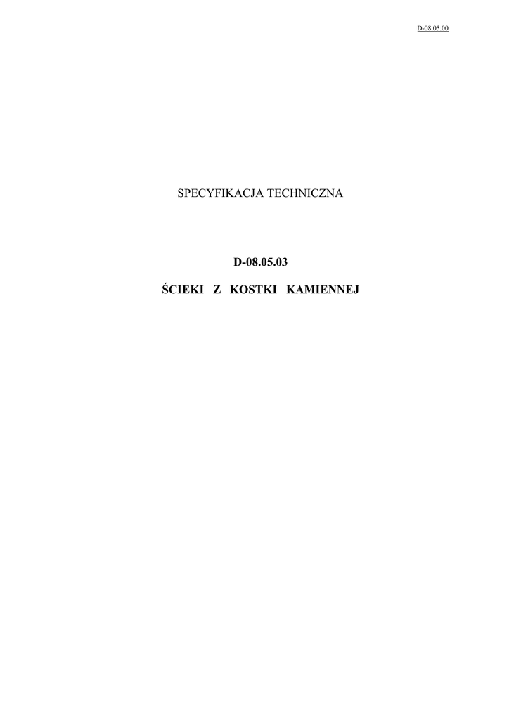 D-08.05.00 SPECYFIKACJA TECHNICZNA D-08.05.03 ŚCIEKI Z KOSTKI KAMIENNEJ D-08.05.00 1. WSTĘP 1.1. Przedmiot ST Przedmiotem niniejszej specyfikacji technicznej (ST) są wymagania dotyczące wykonania i odbioru robót związanych z wykonaniem ścieków z kostki kamiennej. 1.2. Zakres stosowania ST Specyfikacja techniczna została opracowana na podstawie Ogólnych Specyfikacji Technicznych, stanowi podstawę jako dokument przetargowy i kontraktowy przy zlecaniu i realizacji robót drogowych. 1.3. Zakres robót objętych ST Ustalenia zawarte w niniejszej specyfikacji dotyczą zasad prowadzenia robót związanych z wykonaniem: − ścieków ulicznych przykrawężnikowych z kostki kamiennej nieregularnej i rzędowej, − ścieków ulicznych międzyjezdniowych z kostki kamiennej nieregularnej i rzędowej. 1.4. Określenia podstawowe 1.4.1. Ściek przykrawężnikowy - element konstrukcji jezdni służący do odprowadzenia wód opadowych z nawierzchni jezdni i chodników do projektowanych odbiorników (np. kanalizacji deszczowej). 1.4.2. Ściek międzyjezdniowy - element konstrukcji jezdni służący do odprowadzenia wód opadowych z nawierzchni, na których zastosowano przeciwne spadki poprzeczne, np. w rejonie zatok, placów itp. 1.4.3. Pozostałe określenia podstawowe są zgodne z obowiązującymi, odpowiednimi polskimi normami i z definicjami podanymi w ST D-M-00.00.00 „Wymagania ogólne” pkt 1.4. 1.5. Ogólne wymagania dotyczące robót Ogólne wymagania dotyczące robót podano w ST D-M-00.00.00 „Wymagania ogólne” pkt 1.5. 2. MATERIAŁY 2.1. Ogólne wymagania dotyczące materiałów Ogólne wymagania dotyczące materiałów, w ST D-M-00.00.00 „Wymagania ogólne” pkt 2. ich pozyskiwania i składowania, podano 2.2. Kostka kamienna Kostka kamienna nieregularna i rzędowa, stosowana do wykonania ścieków powinna odpowiadać wymaganiom PN-B-11100 [1]. Powinna to być kostka klasy I, gatunku 1. Kształt, wymiary i dopuszczalne odchyłki wymiarowe dla kostki nieregularnej i rzędowej podano w ST D-05.03.01 „Nawierzchnia z kostki kamiennej”. Wymagane cechy fizyczne i wytrzymałościowe dla kostki kamiennej klasy I, są następujące: − wytrzymałość na ściskanie w stanie powietrzno-suchym, nie mniej niż 160 MPa, − ścieralność na tarczy Boehmego, nie więcej niż 0,2 cm, − wytrzymałość na uderzenie (zwięzłość), liczba uderzeń, nie mniej niż 12, − nasiąkliwość wodą, nie więcej niż 0,5%. Kostkę nieregularną można składować w pryzmach. Kostkę rzędową należy ustawiać w stosach. Wysokość stosu lub pryzm nie powinna przekraczać 1 m. 2.3. Inne materiały Wymagania dla: krawężników, betonu na ławę, składników betonu, piasku na podsypkę oraz wody podano w ST D-08.05.02 „Ścieki klinkierowe”. 3. SPRZĘT 3.1. Ogólne wymagania dotyczące sprzętu Ogólne wymagania dotyczące sprzętu podano w ST D-M-00.00.00 „Wymagania ogólne” pkt 3. 3.2. Sprzęt do wykonania ścieku Roboty można wykonywać ręcznie z zastosowaniem następującego sprzętu: − betoniarek do wytwarzania betonu i zapraw, − ubijaków ręcznych i mechanicznych do ubijania kostki. D-08.05.00 4. TRANSPORT 4.1. Ogólne wymagania dotyczące transportu Ogólne wymagania dotyczące transportu podano w ST D-M-00.00.00 „Wymagania ogólne” pkt 4. 4.2. Transport materiałów Wymagania dotyczące transportu krawężników, składników betonu i piasku na podsypkę podano w ST D-08.01.01 „Krawężniki betonowe”, a transportu kostki w ST D-05.03.01 „Nawierzchnia z kostki kamiennej”. 5. WYKONANIE ROBÓT 5.1. Ogólne zasady wykonania robót Ogólne zasady wykonania robót podano w ST D-M-00.00.00 „Wymagania ogólne” pkt 5. 5.2. Roboty przygotowawcze Przed przystąpieniem do wykonania ścieku należy wytyczyć linię krawężnika i oś ścieku zgodnie z dokumentacją projektową. Dla ścieku umieszczonego między jezdniami (nawierzchniami) oś ścieku stanowi oś koryta pod ławę. 5.3. Wykonanie wykopu, ławy i ustawienie krawężników Wykonanie wykopu pod ławę, ławy betonowej dla ścieku przykrawężnikowego i międzyjezdniowego oraz ustawienie krawężników na ławach powinno być zgodne z dokumentacją projektową oraz postanowieniami ST D-08.01.01 „Krawężniki betonowe”. 5.4. Wykonanie ścieku z kostki kamiennej Ogólne wymagania dotyczące układania kostki kamiennej podano w ST D-05.03.01 „Nawierzchnia z kostki kamiennej”. Rodzaj i wymiary ścieku powinny być zgodne z dokumentacją projektową. Jeżeli dokumentacja projektowa nie stanowi inaczej, to najczęściej stosuje się ścieki przykrawężnikowe i międzyjezdniowe z 2 rzędów kostki kamiennej nieregularnej lub rzędowej, obniżonych w stosunku do krawędzi nawierzchni o 1 do 2 cm. Na ławie betonowej należy wykonać podsypkę cementowo-piaskową o grubości zgodnej z dokumentacją projektową i wymaganiami podanymi w ST D-05.03.01 „Nawierzchnia z kostki kamiennej”. Na wykonanej podsypce należy ułożyć ściek z kostki nieregularnej lub rzędowej, z zachowaniem wymaganej w dokumentacji projektowej niwelety ścieku. Szerokość spoin między poszczególnymi kostkami nie powinna przekraczać 12 mm. Ułożoną kostkę należy ubić przy pomocy ubijaków ręcznych lub mechanicznych. Kostki pęknięte należy wymienić na całe. Wypełnienie spoin należy wykonywać zgodnie z warunkami podanymi w ST D-05.03.01 „Nawierzchnia z kostki kamiennej”. 6. KONTROLA JAKOŚCI ROBÓT 6.1. Ogólne zasady kontroli jakości robót Ogólne zasady kontroli jakości robót podano w ST D-M-00.00.00 „Wymagania ogólne” pkt 6. 6.2. Badania przed przystąpieniem do robót Przed przystąpieniem do robót Wykonawca powinien wykonać badania materiałów przeznaczonych do wykonania ścieku z kostki kamiennej i przedstawić wyniki tych badań Inżynierowi do akceptacji. Badania kostki powinny być wykonane w zakresie i z częstotliwością wg ST D-05.03.01 „Nawierzchnia z kostki kamiennej”. Badania