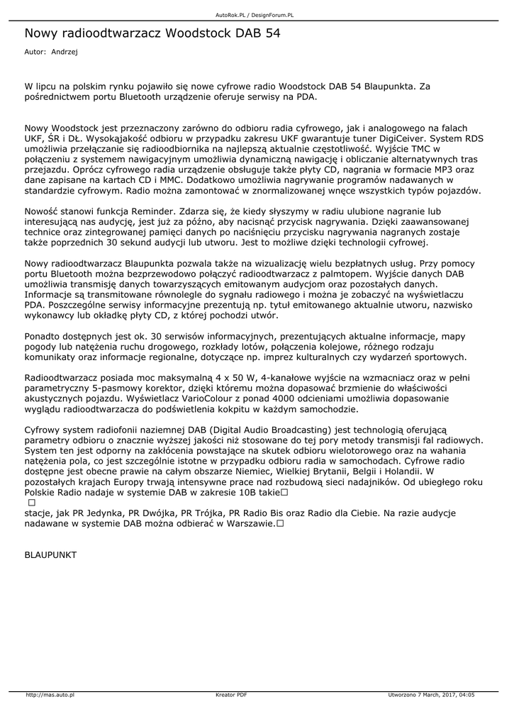 AutoRok.PL / DesignForum.PL Nowy radioodtwarzacz Woodstock DAB 54 Autor: Andrzej W lipcu na polskim rynku pojawiło się nowe cyfrowe radio Woodstock DAB 54 Blaupunkta. Za pośrednictwem portu Bluetooth urządzenie oferuje serwisy na PDA. Nowy Woodstock jest przeznaczony zarówno do odbioru radia cyfrowego, jak i analogowego na falach UKF, ŚR i DŁ. Wysokąjakość odbioru w przypadku zakresu UKF gwarantuje tuner DigiCeiver. System RDS umożliwia przełączanie się radioodbiornika na najlepszą aktualnie częstotliwość. Wyjście TMC w połączeniu z systemem nawigacyjnym umożliwia dynamiczną nawigację i obliczanie alternatywnych tras przejazdu. Oprócz cyfrowego radia urządzenie obsługuje także płyty CD, nagrania w formacie MP3 oraz dane zapisane na kartach CD i MMC. Dodatkowo umożliwia nagrywanie programów nadawanych w standardzie cyfrowym. Radio można zamontować w znormalizowanej wnęce wszystkich typów pojazdów. Nowość stanowi funkcja Reminder. Zdarza się, że kiedy słyszymy w radiu ulubione nagranie lub interesującą nas audycję, jest już za późno, aby nacisnąć przycisk nagrywania. Dzięki zaawansowanej technice oraz zintegrowanej pamięci danych po naciśnięciu przycisku nagrywania nagranych zostaje także poprzednich 30 sekund audycji lub utworu. Jest to możliwe dzięki technologii cyfrowej. Nowy radioodtwarzacz Blaupunkta pozwala także na wizualizację wielu bezpłatnych usług. Przy pomocy portu Bluetooth można bezprzewodowo połączyć radioodtwarzacz z palmtopem. Wyjście danych DAB umożliwia transmisję danych towarzyszących emitowanym audycjom oraz pozostałych danych. Informacje są transmitowane równolegle do sygnału radiowego i można je zobaczyć na wyświetlaczu PDA. Poszczególne serwisy informacyjne prezentują np. tytuł emitowanego aktualnie utworu, nazwisko wykonawcy lub okładkę płyty CD, z której pochodzi utwór. Ponadto dostępnych jest ok. 30 serwisów informacyjnych, prezentujących aktualne informacje, mapy pogody lub natężenia ruchu drogowego, rozkłady lotów, połączenia kolejowe, różnego rodzaju komunikaty oraz informacje regionalne, dotyczące np. imprez kulturalnych czy wydarzeń sportowych. Radioodtwarzacz posiada moc maksymalną 4 x 50 W, 4-kanałowe wyjście na wzmacniacz oraz w pełni parametryczny 5-pasmowy korektor, dzięki któremu można dopasować brzmienie do właściwości akustycznych pojazdu. Wyświetlacz VarioColour z ponad 4000 odcieniami umożliwia dopasowanie wyglądu radioodtwarzacza do podświetlenia kokpitu w każdym samochodzie. Cyfrowy system radiofonii naziemnej DAB (Digital Audio Broadcasting) jest technologią oferującą parametry odbioru o znacznie wyższej jakości niż stosowane do tej pory metody transmisji fal radiowych. System ten jest odporny na zakłócenia powstające na skutek odbioru wielotorowego oraz na wahania natężenia pola, co jest szczególnie istotne w przypadku odbioru radia w samochodach. Cyfrowe radio dostępne jest obecne prawie na całym obszarze Niemiec, Wielkiej Brytanii, Belgii i Holandii. W pozostałych krajach Europy trwają intensywne prace nad rozbudową sieci nadajników. Od ubiegłego roku Polskie Radio nadaje w systemie DAB w zakresie 10B takie stacje, jak PR Jedynka, PR Dwójka, PR Trójka, PR Radio Bis oraz Radio dla Ciebie. Na razie audycje nadawane w systemie DAB można odbierać w Warszawie. BLAUPUNKT http://mas.auto.pl Kreator PDF Utworzono 7 March, 2017, 04:05