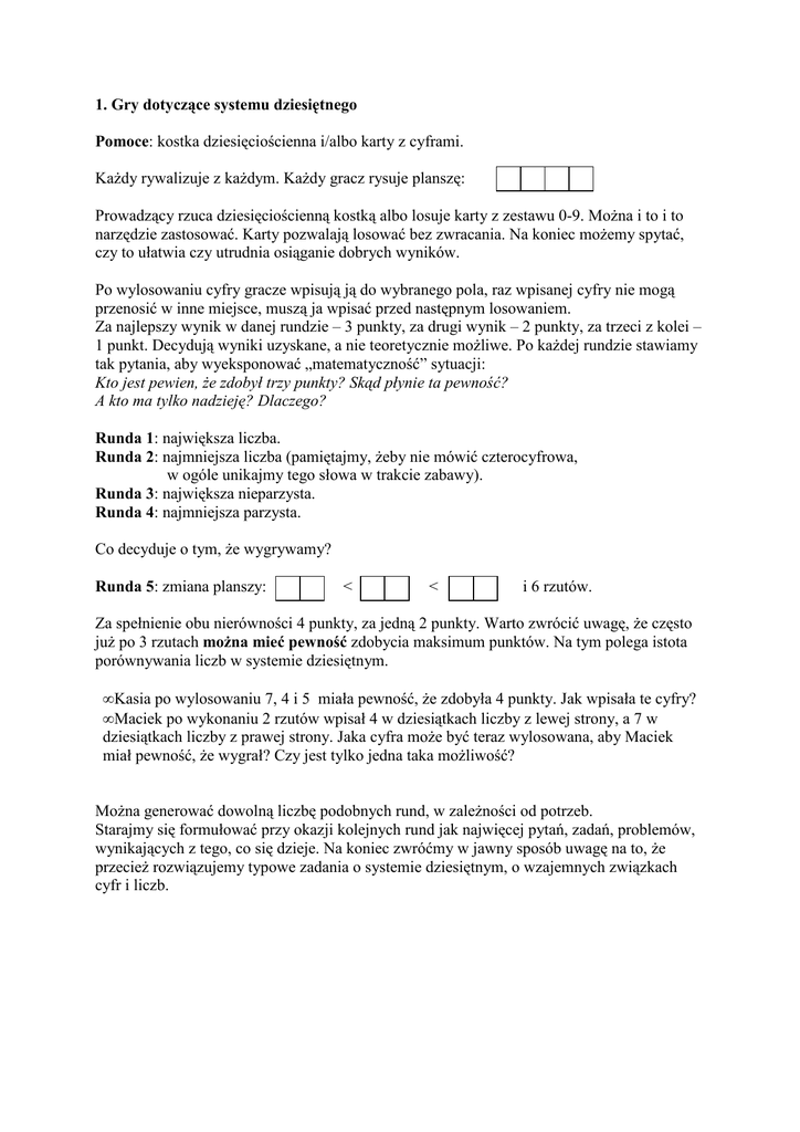 1. Gry dotyczące systemu dziesiętnego Pomoce: kostka