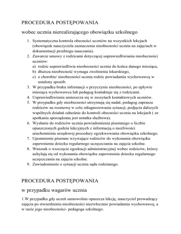 PROCEDURA POSTĘPOWANIA wobec ucznia nierealizującego obowiązku szkolnego 1. Systematyczna kontrola obecności uczniów na wszystkich lekcjach (obowiązek nauczyciela zaznaczenia nieobecności ucznia na zajęciach w dokumentacji przebiegu nauczania). 2. Zawarcie umowy z rodzicami dotyczącej usprawiedliwiania nieobecności uczniów: a) rodzic usprawiedliwia nieobecności ucznia do końca danego miesiąca, b) dłuższa nieobecność wymaga zwolnienia lekarskiego, c) o chorobie/ nieobecności ucznia rodzic powiadamia wychowawcę w ustalony sposób. 3. W przypadku braku informacji o przyczynie nieobecności, po upływie miesiąca wychowawca lub pedagog kontaktuje się z rodzicami. 4. Usprawiedliwienia umieszcza się w zeszytach kontaktowych uczniów. 5. W przypadku gdy nieobecności utrzymują się nadal, pedagog zaprasza rodziców na rozmowę w celu zdiagnozowania sytuacji, podjęcia dalszych wspólnych działań odnośnie do kontroli obecności ucznia na lekcjach ( ze spotkania sporządzana jest notatka służbowa). 6. Wysłanie do rodziców ucznia powiadomienia pisemnego o liczbie opuszczonych godzin lekcyjnych z informacją o możliwości uruchomienia urzędowej procedury egzekwowania obowiązku szkolnego. 7. Upomnienie pisemne wzywające rodziców do wykonania obowiązku zapewnienia dziecku regularnego uczęszczania na zajęcia szkolne. 8. Wniosek o wszczęcie egzekucji administracyjnej wobec rodziców, którzy uchylają się od wykonania obowiązku zapewnienia dziecku regularnego uczęszczania na zajęcia szkolne. 9. Zawiadomienie o sytuacji ucznia sądu rodzinnego. PROCEDURA POSTĘPOWANIA w przypadku wagarów ucznia 1.W przypadku gdy uczeń samowolnie opuszcza lekcję, nauczyciel prowadzący zajęcia po stwierdzeniu nieobecności niezwłocznie powiadamia wychowawcę, a w razie jego nieobecności- pedagoga szkolnego. 2. Wychowawca na bieżąco analizuje dziennik lekcyjny i niezwłocznie powiadamia rodziców (opiekunów prawnych) telefonicznie, poprzez SMS,email, a w razie braku kontaktu z rodzicami ustala z pedagogiem szkolnym o potrzebie poinformowania ich pisemnym zawiadomieniem o opuszczeniu lekcji lub udaje się do nich z wizytą domową. 3.We współpracy z pedagogiem szkolnym wychowawca ustala przyczynę wagarów i miejsce pobytu ucznia w czasie nieobecności w szkole. Następnie wzywa do szkoły rodziców ( opiekunów prawnych) ucznia i zobowiązuje ucznia do zaniechania wagarów lub samowolnego opuszczania szkoły, a rodziców (opiekunów prawnych) do kontrolowania uczęszczania dziecka do szkoły i ustala z nim strategię postępowania. Uczeń i rodzice (opiekunowie prawni) mogą złożyć oświadczenie o zobowiązaniu w formie pisemnej. Wychowawca sporządza notatkę służbową ze spotkania, załączając do niej pisemne oświadczenia. 4. W przypadku dalszych powtarzających się nieusprawiedliwionych nieobecności ucznia, wychowawca informuje pedagoga szkolnego, który w porozumieniu z dyrektorem wykonuje czynności wskazane w pkt 3. 5. Po wykorzystaniu wszystkich dostępnych środków oddziaływań wychowawczych, których zastosowanie nie przynosi oczekiwanych rezultatów w zakresie zaprzestania wagarowania i spełniania obowiązku szkolnego/nauki, dyrektor szkoły powiadamia sąd rodzinny lub policję. PROCEDURA POSTĘPOWANIA W PRZYPADKU BÓJKI UCZNIÓW 1. W przypadku bójki uczniów, w której skutkiem nie jest uraz kwalifikujący zajście do wypadku w szkole, nauczyciel : a) Przeprowadza rozmowę z uczniem, który wszczął bójkę, o jego zachowaniu, b) Omówić z rodzicami bądź prawnymi opiekunami zachowanie dziecka, ustalić strategię współpracy ze szkołą i obserwować jej efekty. 2. Wychowawca ucznia nawiązuje kontakt z pedagogiem szkolnym, który podejmuje pracę wychowawczą z uczniem. 3. Pedagog szkolny : a) Organizuje spotkanie w składzie: wychowawca, rodzic, pedagog, uczeń. b) Informuje rodziców ucznia o możliwości uzyskania pomocy psychologicznej. 4. W ramach uprawnień statutowych szkoła stosuje względem sprawcy zdarzenia środki przewidziane regulaminem szkolnym, np. obniżenie stopnia z zachowania, przeniesienie do równorzędnej klasy, innej szkoły, zawieszenie w prawach ucznia. 5. W przypadku gdy sprawca zdarzenia sprawiał wcześniej problemy i łamał normy społecznego zachowania, a zdarzenie którego się dopuścił nosi cechy postępującej demoralizacji, szkoła powinna przygotować na tę okoliczność wystąpienie do sądu rodzinnego lub policji.