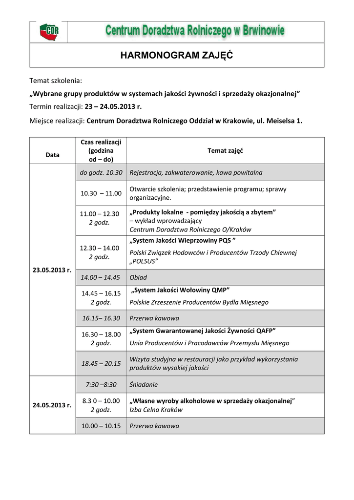 HARMONOGRAM ZAJĘĆ Temat szkolenia: „Wybrane grupy produktów w systemach jakości żywności i sprzedaży okazjonalnej” Termin realizacji: 23 – 24.05.2013 r. Miejsce realizacji: Centrum Doradztwa Rolniczego Oddział w Krakowie, ul. Meiselsa 1. Data Czas realizacji (godzina od – do) Temat zajęć do godz. 10.30 Rejestracja, zakwaterowanie, kawa powitalna 10.30 – 11.00 Otwarcie szkolenia; przedstawienie programu; sprawy organizacyjne. 11.00 – 12.30 2 godz. „Produkty lokalne - pomiędzy jakością a zbytem” – wykład wprowadzający Centrum Doradztwa Rolniczego O/Kraków „System Jakości Wieprzowiny PQS ” 12.30 – 14.00 2 godz. Polski Związek Hodowców i Producentów Trzody Chlewnej „POLSUS” 23.05.2013 r. 14.00 – 14.45 Obiad 14.45 – 16.15 2 godz. „System Jakości Wołowiny QMP” Polskie Zrzeszenie Producentów Bydła Mięsnego 16.15– 16.30 Przerwa kawowa 16.30 – 18.00 2 godz. „System Gwarantowanej Jakości Żywności QAFP” 18.45 – 20.15 7:30 –8:30 24.05.2013 r. Unia Producentów i Pracodawców Przemysłu Mięsnego Wizyta studyjna w restauracji jako przykład wykorzystania produktów wysokiej jakości Śniadanie 8.3 0 – 10.00 2 godz. „Własne wyroby alkoholowe w sprzedaży okazjonalnej” Izba Celna Kraków 10.00 – 10.15 Przerwa kawowa HARMONOGRAM ZAJĘĆ 10.15 –11.45 2 godz. „Żywienie i sprzedaż w gospodarstwach agroturystycznych” 11:45 – 12:00 Przerwa kawowa 12.00 – 14.15 3 godz. „Zagadnienia podatkowe związane z różnymi formami sprzedaży, w tym okazjonalnej oraz dokumentacja sprzedażowa” Wojewódzka Stacja Sanitarno-Epidemiologiczna Kraków Izba Skarbowa Kraków 14.15 – 14.30 Podsumowanie i zakończenie szkolenia 14.30 – 15.00 Obiad