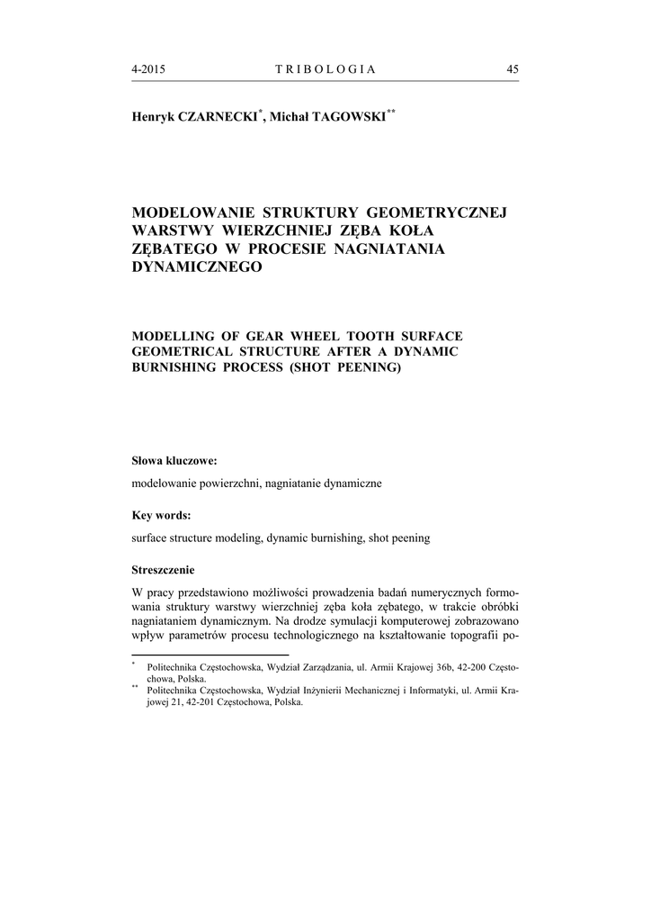 4-2015 TRIBOLOGIA 45 Henryk CZARNECKI *, Michał TAGOWSKI ** MODELOWANIE STRUKTURY GEOMETRYCZNEJ WARSTWY WIERZCHNIEJ ZĘBA KOŁA ZĘBATEGO W PROCESIE NAGNIATANIA DYNAMICZNEGO MODELLING OF GEAR WHEEL TOOTH SURFACE GEOMETRICAL STRUCTURE AFTER A DYNAMIC BURNISHING PROCESS (SHOT PEENING) Słowa kluczowe: modelowanie powierzchni, nagniatanie dynamiczne Key words: surface structure modeling, dynamic burnishing, shot peening Streszczenie W pracy przedstawiono możliwości prowadzenia badań numerycznych formowania struktury warstwy wierzchniej zęba koła zębatego, w trakcie obróbki nagniataniem dynamicznym. Na drodze symulacji komputerowej zobrazowano wpływ parametrów procesu technologicznego na kształtowanie topografii po* ** Politechnika Częstochowska, Wydział Zarządzania, ul. Armii Krajowej 36b, 42-200 Częstochowa, Polska. Politechnika Częstochowska, Wydział Inżynierii Mechanicznej i Informatyki, ul. Armii Krajowej 21, 42-201 Częstochowa, Polska. 46 TRIBOLOGIA 4-2015 wierzchni oraz na wyznaczenie odkształcenia tworzącego nową SGP. Eksperyment został przeprowadzony z użyciem oprogramowania CATIA oraz Abaqus. Wykazano możliwość prowadzenia symulacji procesu nagniatania. WPROWADZENIE Warunki eksploatacyjne maszyn i urządzeń wymagają stosowania niekonwencjonalnych rozwiązań technologicznych mających na celu maksymalne zwiększenie wytrzymałości, bezpieczeństwa pracy i jakości produkowanych wysoko obciążanych części maszyn. W takim kontekście coraz większą wagę przykłada się również do stanu warstwy wierzchniej, szczególnie przy wytwarzaniu elementów maszyn i urządzeń, które podczas pracy podlegają procesom tribologicznym. Zużycie tribologiczne bezpośrednio prowadzi do zmian w warstwie wierzchniej, zarówno pod względem ilościowym, jak i jakościowym. Części maszyn, takie jak koła zębate stosowane do przenoszenia wielkich mocy, są szczególnie narażone na niekorzystne zjawiska wywołujące ich zużywanie. Współpraca kół zębatych, czyli wzajemny kontakt poszczególnych powierzchni ich zębów, wywołuje zmiany mechaniczne, eksploatacyjne oraz fizykochemiczne warstwy wierzchniej w obrębie mikro- oraz makroobszarów powierzchni styku [L. 1, 2, 3]. Biorąc pod uwagę wytrzymałość zmęczeniową części maszyn w aspekcie formowania powierzchni, jest ona ściśle powiązana ze stanem warstwy wierzchniej oraz strukturą geometryczną powierzchni elementów współpracujących. Zatem, rozpatrując zjawiska podczas współpracy dwóch elementów maszyn, należy zwrócić szczególną uwagę na stan i rodzaj wytworzonej technologicznej warstwy wierzchniej. Warstwa wierzchnia jest cienkim obszarem materiału o odmiennej strukturze i innych właściwościach od materiału rdzenia rozpatrywanego elementu. Ograniczona jest powierzchnią rzeczywistą danego przedmiotu i obejmuje część materiału w głąb aż do rdzenia [L. 4, 5]. Należy przez to rozumieć, że warstwa wierzchnia jest to zbiór punktów materialnych zawartych pomiędzy powierzchnią zewnętrzną danego materiału a powierzchnią umowną, która jest granicą wszelkich zmian. Zmiany te zależne są zarówno od rodzaju materiału przy rdzeniu, jego składu chemicznego oraz właściwości fizycznych, jak również od czynników zewnętrznych, czyli rodzaju i parametrów wykonanej obróbki [L. 4]. Przyjmuje się, że najważniejszymi parametrami określającymi właściwości warstwy wierzchniej są: struktura geometryczna, struktura materiałowa, tekstura stref podpowierzchniowych, stan i rozkład naprężeń własnych oraz wielkość i rozległość umocnienia [L. 3, 6]. Poprawę zarówno stanu warstwy wierzchniej, jak i jej struktury geometrycznej uzyskuje się podczas realizacji obróbki wykańczającej danego detalu [L. 7, 8]. Każda operacja odpowiednio wybranego procesu technologicznego powinna zapewnić powstanie wyrobu o określonej, założonej na etapie konstrukcji dokładności wymiarowo-kształtowej oraz o cechach użytko- 4-2015 TRIBOLOGIA 47 wych spełniających wymagania stawiane przez producentów, a przede wszystkim potencjalnych użytkowników. WYTWARZANIE TECHNOLOGICZNEJ WARSTWY WIERZCHNIEJ Technologiczną warstwę wierzchnią (TWW) uzyskuje się w wyniku obróbki części maszyn, które poddawane są określonym operacjom kształtującym ich właściwości eksploatacyjne. Obróbka powierzchniowa jest procesem, który ostatecznie formuje strukturę i skład chemiczny warstwy wierzchniej. Właściwości mechaniczne warstwy wierzchniej mogą być kształtowane z wykorzystaniem różnych mechanizmów w wyniku stosowania procesów powierzchniowych obróbek określonego rodzaju. W zależności od zespołu czynności i środków wykorzystanych do wytworzenia warstwy wierzchniej uzyskujemy różne jej właściwości, które winny być optymalizowane pod kątem eksploatacyjnym, tzn. powinny charakteryzować się optymalną chropowatością powierzchni, korzystnym rozkładem udziału materiałowego, dużym umocnieniem materiału oraz występowaniem naprężeń własnych o charakterze ściskającym. Wyżej wymieniony zakres pożądanych cech i właściwości można osiągnąć poprzez zastosowanie operacji technologicznych polegających na odkształcaniu plastycznym materiału na zimno – obróbkę nagniataniem [L. 9]. Można zaobserwować, że obróbka nagniataniem w coraz większym stopniu jest stosowana w przemyśle (szczególnie w angielskim i niemieckim) i zalecana jest jako obowiązkowa obróbka wykańczająca. Należy przy tym zauważyć, że nadal wyraźny jest brak wiarygodnych interpretacji zjawisk fizycznych występujących na styku warstwa wierzchnia–narzędzie, towarzyszących tego rodzaju procesom [L. 10–13]. Kształtowanie warstwy wierzchniej za pomocą obróbki nagniataniem polega na wywołaniu fizycznych zmian stanu warstwy wierzchniej będących efektem lokalnych odkształceń plastycznych zalegających na niewielkiej głębokości względem obr