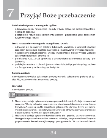7 Przyjąć Boże przebaczenie Cele katechetyczne – wymagania ogólne: – odkrywanie sensu nawrócenia i pokuty w życiu człowieka dotkniętego skłonnością do grzechu; – pogłębienie rozumienia sakramentu pokuty i pojednania jako daru zmartwychwstałego Jezusa. Treści nauczania – wymagania szczegółowe. Uczeń: – odnosząc się do znanych tekstów biblijnych, wyjaśnia, iż człowiek skażony grzechem potrzebuje ciągłego nawrócenia i naprawiania wyrządzonego zła; – na podstawie dotychczasowej wiedzy i wiadomości z lekcji wylicza warunki sakramentu pokuty i omawia je; – po lekturze J 20, 19–23 opowiada o ustanowieniu sakramentu pokuty i pojednania; – po lekcji uzasadnia, iż chrześcijanin – mimo słabości i popełnionych grzechów – z Bożą pomocą może osiągnąć świętość. Pojęcia, postaci: nawrócenie człowieka, sakrament pokuty, warunki sakramentu pokuty, bł. ojciec Pio, ustanowienie sakramentu pokuty. Wartości: nawrócenie, pokuta. propozycja realizacji 1 Propozycja realizacji: 1. Nauczyciel, zadaje pytania dotyczące poprzednich lekcji: Co daje człowiekowi szczęście? Kiedy człowiek uczestniczy w zbawieniu dokonanym przez Jezusa Chrystusa? Jakie są skutki przyjętego sakramentu chrztu? Czym jest sakrament bierzmowania? Jakie dary Ducha Świętego otrzymujemy w sakramencie bierzmowania? Czym jest sprawiedliwość? 2. Nauczyciel zadaje pytanie o doświadczenie zła i grzechu w życiu człowieka. Następnie wprowadza uczniów w temat, mówiąc, że sprawiedliwość wymaga ponoszenia konsekwencji swojego postępowania. W codzienności obok 34 dobra zauważamy również zło, zarówno w innych jak i w nas samych. Często popełniamy grzechy, a te przeszkadzają nam trwać w świętości i wierności Bogu, w łaskach, które zostały nam ofiarowane w sakramentach chrztu i bierzmowania. Chrystus przez swoją śmierć i zmartwychwstanie dał wierzącym największy dar, czyli przebaczenie grzechów i pojednanie z Bogiem. 3. Odczytanie fragmentu z podręcznika, s. 48 (J 20, 19–23). W zeszytach uczniowie zapisują notatkę: W dzień zmartwychwstania Pan Jezus przekazał apostołom dar przebaczania grzechów. Odpuszczenie grzechów jest pierwszym skutkiem zbawienia i zadośćuczynienia za grzechy wszystkich ludzi, skutkiem tego, co dokonało się na krzyżu, przez mękę i śmierć Jezusa Chrystusa. „Weźmijcie Ducha Świętego! Którym odpuścicie grzechy są i odpuszczone, a którym zatrzymacie są im zatrzymane!”(J 20, 23). Tymi słowami Jezus ustanowił sakrament pokuty i pojednania. 4. Uczniowie czytają teksty z podręcznika, s. 45, ramki Opinie i Przypomnij sobie. Następnie dyskutują o postawie człowieka względem Boga na podst. Rdz 3, 1–24 i Łk 5, 1–11. Nauczyciel prosi uczniów o wytłumaczenie, czym jest dla nich nawrócenie i jak je rozumieją. Następnie uczniowie czytają fragment z podręcznika o sakramencie pokuty i pojednania ze s. 46–47. Nauczyciel dyktuje notatkę: Spowiedź, czyli sakrament pokuty i pojednania, gładzi grzechy, które człowiek popełnił po chrzcie świętym. Na nowo jednoczy człowieka z Bogiem i Kościołem, umacnia i uświęca wierzących, daje doświadczyć miłosiernej miłości Boga. 5. Nauczyciel zadaje pytanie: Czy znacie kogoś, kto nie grzeszy? Co to znaczy przebaczyć? Dlaczego powinniśmy przebaczać? Czy przebaczyć, znaczy zapomnieć? (Czy chodzi raczej o brak urazy w sercu?) Refleksja na przykładzie postawy św. Piotra – ile razy mamy przebaczać, czy aż siedem razy? Nie siedem, a siedemdziesiąt siedem razy. Kiedy każdy z nas doświadcza przebaczenia? Kto przebacza zawsze, ilekroć go o to poprosimy? Kto daje nam przykład i siłę do wybaczania? 6. Zapis do zeszytu: Warunki sakramentu pokuty: – rachunek sumienia, – żal za grzechy, – postanowienie poprawy, – szczera spowiedź, – zadośćuczynienie Bogu i bliźniemu. Jeżeli czas na to pozwala, należy omówić warunki sakramentu pokuty. 35 propozycja na lekcji propozycja pracypracy na lekcji 3 inna 12Inna Lekcję warto poprzedzić przeprowadzeniem anonimowej ankiety (może warto, jeśli kontakt nauczyciela z klasą jest lepszy, pozwolić na podpisanie ankiety przez uczniów. Gdyby jednak jakiś uczeń chciał porozmawiać z nauczycielem na temat swoich problemów w cztery oczy, nie można treści rozmowy ujawniać reszcie klasy. Ci, którzy nie chcą się podpisać ankiety, uzupełniają ją anonimowo). Nauczyciel może zatem zająć się w trakcie lekcji odpowiadaniem na pytania i problemy uczniów. Warto, by w omawianie problemów sakramentu pokuty włączył własne doświadczenie związane z przyjmowaniem (udzielaniem) sakramentu6. Życiorys bł. ojca Pio7, uzupełniony przez fotogramy lub film, ma być zachętą dla uczniów, by modlili się w trudnościach związanych ze spowiedzią, kierując swoje prośby za wstawiennictwem tego szczególnego patrona sakramentu pokuty. W pracy nad tym tematem można zastosować metodę wyjaśniającą symbole, osoby i pojęcia związane z sakramentem pokuty: Kościół, konfesjonał, Jezus, kapłan, rodzice, katecheta, kolega, stuła, kolor fioletowy, ręka kapłana. List rozpoczynający jednostkę w podręczniku zwraca uwagę na doświadczanie przez młodzież słabości i na ulgę, jaką przynosi sakrament pokuty. Następnie przypomina trzy jednostki z kl. I gimnazjum, by podać podstawowe wiadomości o sakramencie pokuty – sakramencie nawrócenia oraz o warunkach sakramentu pokuty (ponieważ jest to przypomnienie, rozwinięcie tematu następuje w poleceniu 3 pracy domowej). Nauczyciel prezentuje biogram bł. ojca Pio, „więźnia konfesjonału” oraz cytuje opis ustanowienia sakramentu pokuty, wieczorem w dniu zmartwychwstania. Do tego opisu nawiązują polecenia 1 i 2 pracy domowej. Modlitwa: Aktnadziei. Podręcznik, s. 48, zadanie 3. Ciekawe uwagi na temat związku między pogłębianiem duchowości a świadectwem dawanym przez nauczyciela religii można znaleź