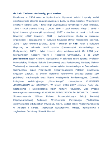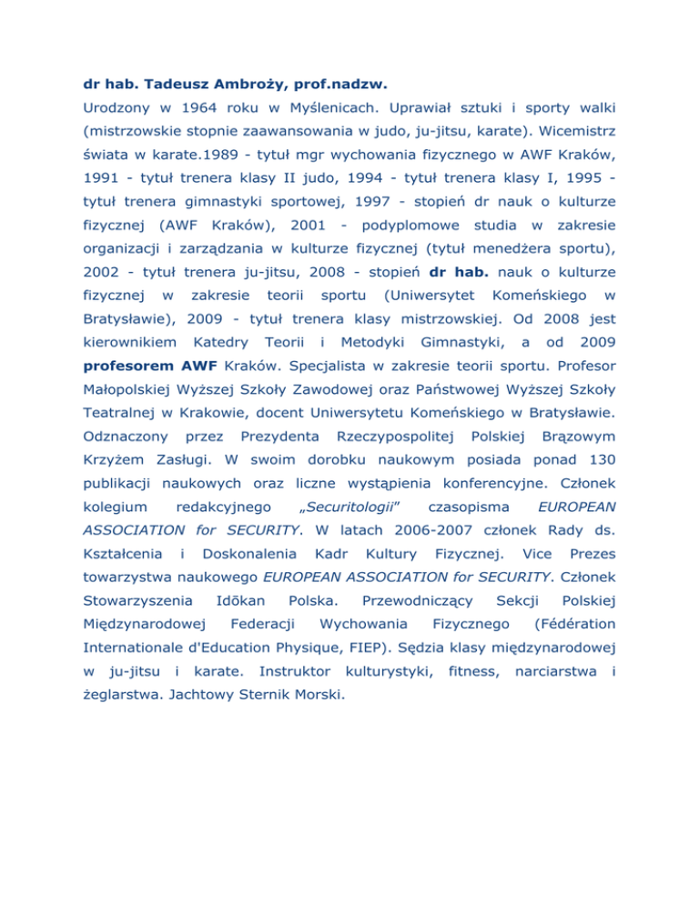 dr hab. Tadeusz Ambroży, prof.nadzw. Urodzony w 1964 roku w Myślenicach. Uprawiał sztuki i sporty walki (mistrzowskie stopnie zaawansowania w judo, ju-jitsu, karate). Wicemistrz świata w karate.1989 - tytuł mgr wychowania fizycznego w AWF Kraków, 1991 - tytuł trenera klasy II judo, 1994 - tytuł trenera klasy I, 1995 tytuł trenera gimnastyki sportowej, 1997 - stopień dr nauk o kulturze fizycznej (AWF Kraków), 2001 - podyplomowe studia w zakresie organizacji i zarządzania w kulturze fizycznej (tytuł menedżera sportu), 2002 - tytuł trenera ju-jitsu, 2008 - stopień dr hab. nauk o kulturze fizycznej w zakresie teorii sportu (Uniwersytet Komeńskiego w Bratysławie), 2009 - tytuł trenera klasy mistrzowskiej. Od 2008 jest kierownikiem Katedry Teorii i Metodyki Gimnastyki, a od 2009 profesorem AWF Kraków. Specjalista w zakresie teorii sportu. Profesor Małopolskiej Wyższej Szkoły Zawodowej oraz Państwowej Wyższej Szkoły Teatralnej w Krakowie, docent Uniwersytetu Komeńskiego w Bratysławie. Odznaczony przez Prezydenta Rzeczypospolitej Polskiej Brązowym Krzyżem Zasługi. W swoim dorobku naukowym posiada ponad 130 publikacji naukowych oraz liczne wystąpienia konferencyjne. Członek kolegium redakcyjnego „Securitologii” czasopisma EUROPEAN ASSOCIATION for SECURITY. W latach 2006-2007 członek Rady ds. Kształcenia i Doskonalenia Kadr Kultury Fizycznej. Vice Prezes towarzystwa naukowego EUROPEAN ASSOCIATION for SECURITY. Członek Stowarzyszenia Idōkan Międzynarodowej Polska. Federacji Przewodniczący Wychowania Sekcji Fizycznego Polskiej (Fédération Internationale d'Education Physique, FIEP). Sędzia klasy międzynarodowej w ju-jitsu i karate. Instruktor kulturystyki, żeglarstwa. Jachtowy Sternik Morski. fitness, narciarstwa i