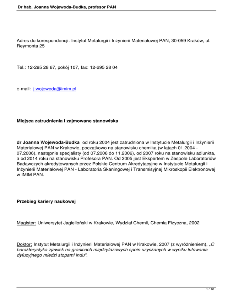 Dr hab. Joanna Wojewoda-Budka, profesor PAN Adres do korespondencji: Instytut Metalurgii i Inżynierii Materiałowej PAN, 30-059 Kraków, ul. Reymonta 25 Tel.: 12-295 28 67, pokój 107, fax: 12-295 28 04 e-mail: [email protected] Miejsca zatrudnienia i zajmowane stanowiska dr Joanna Wojewoda-Budka od roku 2004 jest zatrudniona w Instytucie Metalurgii i Inżynierii Materiałowej PAN w Krakowie, początkowo na stanowisku chemika (w latach 01.2004 07.2006), następnie specjalisty (od 07.2006 do 11.2006), od 2007 roku na stanowisku adiunkta, a od 2014 roku na stanowisku Profesora PAN. Od 2005 jest Ekspertem w Zespole Laboratoriów Badawczych akredytowanych przez Polskie Centrum Akredytacyjne w Instytucie Metalurgii i Inżynierii Materiałowej PAN - Laboratoria Skaningowej i Transmisyjnej Mikroskopii Elektronowej w IMIM PAN. Przebieg kariery naukowej Magister: Uniwersytet Jagielloński w Krakowie, Wydział Chemii, Chemia Fizyczna, 2002 Doktor: Instytut Metalurgii i Inżynierii Materiałowej PAN w Krakowie, 2007 (z wyróżnieniem), „C harakterystyka zjawisk na granicach międzyfazowych spoin uzyskanych w wyniku lutowania dyfuzyjnego miedzi stopami indu". 1 / 12 Dr hab. Joanna Wojewoda-Budka, profesor PAN Doktor habilitowany: Instytut Metalurgii i Inżynierii Materiałowej PAN w Krakowie, 2014, „Anali za mikrostrukturalna i termodynamiczna wysokotemperaturowego oddziaływania aluminium z podłożami tlenkowymi (Y2O3, NiO, ZnO, SiO2), będąca punktem wyjścia do uzyskania kompozytów metalowo-ceramicznych o wzajemnie przenikających się sieciach" Dorobek naukowy Liczba publikacji: 54, Liczba cytowań: 106, Hirsch factor: 5 Najważniejsze publikacje w okresie ostatnich 5 lat 1. Wojewoda-Budka J., Sobczak N., Morgiel J., Nowak R.: „TEM studies of the temperature and crystal orientation influence on the microstructure and phase composition of the reaction products in Al/ZnO system ", Solid State Phenomena 172-174, (2011), 1267-1272 2. Wojewoda-Budka J., Zięba P.: „Shear strength of Cu/In-48Sn/Cu diffusion soldered interconnections ", Science and Technology of Welding and Joining 16(6), (2011), 541-545 3. Wierzbicka-Miernik A., Wojewoda-Budka J., Lityńska-Dobrzyńska L., Kodentsov A., Zięba P.: „ Morphology and chemical composition of Cu/Sn/Cu and Cu(5at%Ni)/Sn/Cu(5at%Ni) interconnections ", Science and Technology of Welding and Joining, 17(1), (2012), 32-35. 2 / 12 Dr hab. Joanna Wojewoda-Budka, profesor PAN 4. Wojewoda-Budka J., Sobczak N., Lityńska-Dobrzyńksa L., B. Onderka, Nowak R.: „TEM characterization of the reaction products formed in Al-Cu/SiO2 couples due to high temperature interaction ", Journal of Materials Science, 47(24) (2012), 8464-8471. 5. Wojewoda-Budka J., Huber Z., Lityńska-Dobrzyńska L., Sobczak N., Zięba P.: „Microstructure and chemistry of the SAC/ENIG interconnections ", Materials Chemistry and Physics 139 (2013), 276-280. 6. Wojewoda-Budka J., Sobczak N., Stan K., Nowak R.: „Microstructural characterization of the reaction product region formed due to the high temperature interaction of ZnO(0001) single crystal with liquid aluminum ", Archives of Metallurgy and Materials, 58(2) (2013), 349-353. 7. Wierzbicka-Miernik A., Miernik K., Wojewoda-Budka J., Szyszkiewicz K., Filipek R., Lityńska-Dobrzyńska L., Kodentsov A., Zieba P. „ Growth kinetics of the intermetallic phase in diffusion-soldered (Cu-5at.%Ni)/Sn/(Cu-5at.%Ni) interconnections ", Materials Chemistry and Physics 142 (2013), 682-685. 8. Wojewoda-Budka J., Huber Z., Litynska-Dobrzynska L., Sypien A., Zieba P.: „Microstructure and chemistry of PbSn solder/ENIG interconnections ", Inżynieria Materiałowa 2(198) (2014), 222-224. 9. Wojewoda-Budka J., Stan K., Onderka B., Nowak R., Sobczak N.: „Microstructure, chemistry and thermodynamics of Al/NiOSC couples obtained at 1000 °C ", Journal of Alloys and Compounds 615 (2014), 178-182. 3 / 12 Dr hab. Joanna Wojewoda-Budka, profesor PAN 10. Wierzbicka-Miernik A., Miernik K., Wojewoda-Budka J., Litynska-Dobrzynska L., Garzel G. Mic rostructure and chemical characterization of the intermetallic phases in Cu/(Sn,Ni) diffusion couples with various Ni additions , Intermetallics 59 (2015), 23-31. 11. Huber Z., Wojewoda-Budka J., Wierzbicka-Miernik A., Sypien A., Szczerba M., Zieba P., Influence of phosphorous content on microstructure development at the NiP plating/SAC interface, Electronic Materials Letters, Electronic Materials Letters, 12(1) (2016) 178-185. 12. Wojewoda-Budka J., Stan-Glowinska K., Nowak R., Sobczak N. High temperature reactivity and wetting characteristics of Al/ZnO system related to the zinc oxide single crystal orientation, Journal of Materials Science, Journal of Materials Science 51 (2016) 1692-1700. 13. Fronczek D. M., Wojewoda-Budka J., Chulist R., Sypien A., Korneva A., Szulc Z., Schell N., Zieba P. Structural properties of Ti/Al clads manufactured by explosive welding and annealing, Materials and Design 91 (2016) 80-89. 14. Fronczek D. M., Chulist R., Litynska-Dobrzynska L., Szulc Z., Zieba P.,Wojewoda-Budka J. Microstructure Changes and Phase Growth Occurring at the Interface of the Al/Ti Explosively Welded and Annealed Joints, Journal of Materials Engineering and Performance, 25 (2016) 3211-3217. 15. Wojewoda-Budka J., Wierzbicka-Miernik A., Litynska-Dobrzynska L., SzczerbaM., Mordarski G., Mosialek M. Microstructure characteristics and phase transformation after heat treatment of the Ni-P and Ni-Re-P coatings electroless deposited, Electrochimica Acta 209 (2016) 183-191. 16. 4 / 12 Dr hab. Joanna Wojewoda-Budka, profesor PAN Wierzbicka-Miernik A., Wojewoda-Budka J., Miernik K., Litynska-Dobrzynska L., Schell N. Intermetallic phases' characteristics appearing in Cu/(Sn,Ni) diffusion couples annealed at 220 °C, Journal of Alloys and Compounds, 693 (2017) 1102-1108. Projekty badawcze MNiSW (NCN) Kierownik: Projekt własny badawczy: Przemiany strukturalne podczas wytwarzania kompozytów metalowo-ceramicznych Al-Al2O3