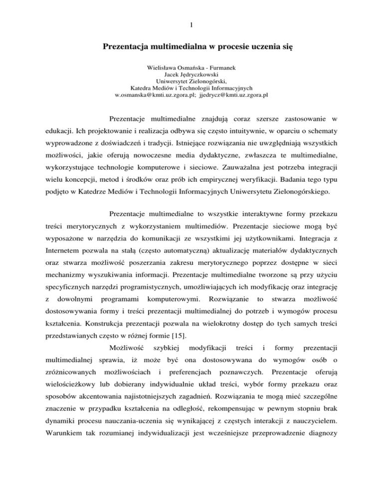 1 Prezentacja multimedialna w procesie uczenia się Wielisława Osmańska - Furmanek Jacek Jędryczkowski Uniwersytet Zielonogórski, Katedra Mediów i Technologii Informacyjnych [email protected]; [email protected] Prezentacje multimedialne znajdują coraz szersze zastosowanie w edukacji. Ich projektowanie i realizacja odbywa się często intuitywnie, w oparciu o schematy wyprowadzone z doświadczeń i tradycji. Istniejące rozwiązania nie uwzględniają wszystkich możliwości, jakie oferują nowoczesne media dydaktyczne, zwłaszcza te multimedialne, wykorzystujące technologie komputerowe i sieciowe. Zauważalna jest potrzeba integracji wielu koncepcji, metod i środków oraz prób ich empirycznej weryfikacji. Badania tego typu podjęto w Katedrze Mediów i Technologii Informacyjnych Uniwersytetu Zielonogórskiego. Prezentacje multimedialne to wszystkie interaktywne formy przekazu treści merytorycznych z wykorzystaniem multimediów. Prezentacje sieciowe mogą być wyposażone w narzędzia do komunikacji ze wszystkimi jej użytkownikami. Integracja z Internetem pozwala na stałą (często automatyczną) aktualizację materiałów dydaktycznych oraz stwarza możliwość poszerzania zakresu merytorycznego poprzez dostępne w sieci mechanizmy wyszukiwania informacji. Prezentacje multimedialne tworzone są przy użyciu specyficznych narzędzi programistycznych, umożliwiających ich modyfikację oraz integrację z dowolnymi programami komputerowymi. Rozwiązanie to stwarza możliwość dostosowywania formy i treści prezentacji multimedialnej do potrzeb i wymogów procesu kształcenia. Konstrukcja prezentacji pozwala na wielokrotny dostęp do tych samych treści przedstawianych często w różnej formie [15]. Możliwość szybkiej modyfikacji treści i formy prezentacji multimedialnej sprawia, iż może być ona dostosowywana do wymogów osób o zróżnicowanych możliwościach i preferencjach poznawczych. Prezentacje oferują wielościeżkowy lub dobierany indywidualnie układ treści, wybór formy przekazu oraz sposobów akcentowania najistotniejszych zagadnień. Rozwiązania te mogą mieć szczególne znaczenie w przypadku kształcenia na odległość, rekompensując w pewnym stopniu brak dynamiki procesu nauczania-uczenia się wynikającej z częstych interakcji z nauczycielem. Warunkiem tak rozumianej indywidualizacji jest wcześniejsze przeprowadzenie diagnozy 2 możliwości poznawczych, związanych z nimi preferencji oraz przygotowania merytorycznego. Przez możliwości poznawcze rozumiany jest tu najwyżej rozwinięty sposób funkcjonowania w zakresie czynności poznawczych i intelektualnych znajdujący się w repertuarze jednostki. [10]. Możliwości poznawcze wpływają bezpośrednio na indywidualne preferencje poznawcze. Spotykane często w literaturze rozróżnienie pomiędzy zdolnościami, a stylami poznawczymi dotyczą w istocie różnic między możliwościami, a preferencjami poznawczymi w danym zakresie. Możliwości poznawcze decydują przede wszystkim o aktualnym poziomie ostatecznego wyniku danej operacji poznawczej, preferencje zaś o sposobie jej wykonania. A zatem możliwości stanowią o tym, że człowiek w ogóle dostrzeże, przetworzy czy oceni informacje, preferencje natomiast o tym, jak dostrzeże, przetworzy czy oceni informacje [19]. Możliwości poznawcze wynikają ze sposobu funkcjonowania poszczególnych zmysłów. Świadczyć może o tym fakt, iż rozwój poznawczy zależy od zdolności interioryzowania postrzeganych zdarzeń i magazynowania ich w formie odzwierciedlającej to, co zachodzi w otoczeniu [1]. Proces ten wiąże się z kształtowaniem indywidualnych systemów reprezentacji rzeczywistości. Jerome Bruner wyróżnia trzy podstawowe typy reprezentacji: czynnościową, obrazową oraz symboliczną (przedstawienia słowne i językowe).[1]. Człowiek bez przerwy używa wszystkich swoich zmysłów, ale w zależności od wykonywanej operacji najsilniej koncentruje się tylko na jednym. Podobne zjawisko występuje w procesie myślenia, gdzie faworyzowany jest najczęściej jeden lub ewentualnie dwa systemy reprezentacji [12]. Osoby bez dysfunkcji poszczególnych zmysłów potrafią aktywnie wykorzystywać wszystkie systemy [16]. Według zwolenników teorii Piageta, dzieci w wieku 11-12 lat dzieci mogą znajdować się jeszcze w stadium operacji konkretnych przejawiających się między innymi zdolnością do manipulowania reprezentacjami. Wiek ten jest dla dzieci przełomowy, albowiem w tym okresie następuje przejście do stadium operacji formalnych wiążących się z tworzeniem systematycznych reprezentacji sytuacji z jakimi się stykają [6,13,16]. W tym samym okresie kształtują się preferencje skierowane w kierunku określonych systemów reprezentacji [12]. Koncepcja układu podstawowych bloków prezentacji multimedialnej [14] wywodzi się z wykorzystywanego w nauczaniu programowanym schematu programu blokowego [8]. W wyniku rozwoju technologii informacyjno - komunikacyjnych strukturę tę można było zintegrować z zasobami sieci globalnej, co wzbogaciło ją o mechanizmy do 3 komunikacji pomiędzy wszystkimi użytkownikami sieci. Dostępna stała się możliwość symulacji procesów i zjawisk, ewaluacja z wykorzystaniem zadań otwartych oraz interaktywność. Integracja wymienionych rozwiązań sprawia, iż nowoczesnej prezentacji multimedialnej nie można nadal zaliczać do metod i środków nauczania programowanego. Zmiany dotyczą także podstawowych funkcji bloku diagnostycznego. Mając na uwadze uniwersalny charakter proponowanych rozwiązań, a w szczególności możliwość wykorzystywania na dowolnym szczeblu kształcenia, uwzględniono założenia piagetowskiej teorii rozwoju. Prowadzona diagnoza ma na celu dopasowanie odpowiedniego stopnia trudności w bloku merytorycznym do indywidualnych strategii poznawczych, charakteryzujących uczniów w określonym stadium rozwoju [6,13,16]. Rozwiązanie powyższe wzbogacono także o propo
