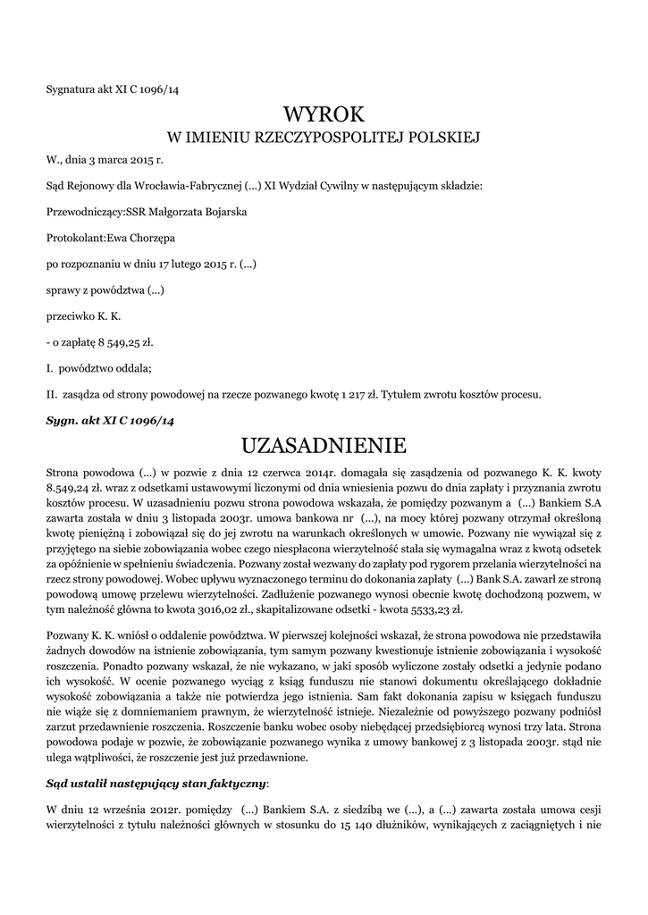 Sygnatura akt XI C 1096/14 WYROK W IMIENIU RZECZYPOSPOLITEJ POLSKIEJ W., dnia 3 marca 2015 r. Sąd Rejonowy dla Wrocławia-Fabrycznej (...) XI Wydział Cywilny w następującym składzie: Przewodniczący:SSR Małgorzata Bojarska Protokolant:Ewa Chorzępa po rozpoznaniu w dniu 17 lutego 2015 r. (...) sprawy z powództwa (...) przeciwko K. K. - o zapłatę 8 549,25 zł. I. powództwo oddala; II. zasądza od strony powodowej na rzecze pozwanego kwotę 1 217 zł. Tytułem zwrotu kosztów procesu. Sygn. akt XI C 1096/14 UZASADNIENIE Strona powodowa (...) w pozwie z dnia 12 czerwca 2014r. domagała się zasądzenia od pozwanego K. K. kwoty 8.549,24 zł. wraz z odsetkami ustawowymi liczonymi od dnia wniesienia pozwu do dnia zapłaty i przyznania zwrotu kosztów procesu. W uzasadnieniu pozwu strona powodowa wskazała, że pomiędzy pozwanym a (...) Bankiem S.A zawarta została w dniu 3 listopada 2003r. umowa bankowa nr (...), na mocy której pozwany otrzymał określoną kwotę pieniężną i zobowiązał się do jej zwrotu na warunkach określonych w umowie. Pozwany nie wywiązał się z przyjętego na siebie zobowiązania wobec czego niespłacona wierzytelność stała się wymagalna wraz z kwotą odsetek za opóźnienie w spełnieniu świadczenia. Pozwany został wezwany do zapłaty pod rygorem przelania wierzytelności na rzecz strony powodowej. Wobec upływu wyznaczonego terminu do dokonania zapłaty (...) Bank S.A. zawarł ze stroną powodową umowę przelewu wierzytelności. Zadłużenie pozwanego wynosi obecnie kwotę dochodzoną pozwem, w tym należność główna to kwota 3016,02 zł., skapitalizowane odsetki - kwota 5533,23 zł. Pozwany K. K. wniósł o oddalenie powództwa. W pierwszej kolejności wskazał, że strona powodowa nie przedstawiła żadnych dowodów na istnienie zobowiązania, tym samym pozwany kwestionuje istnienie zobowiązania i wysokość roszczenia. Ponadto pozwany wskazał, że nie wykazano, w jaki sposób wyliczone zostały odsetki a jedynie podano ich wysokość. W ocenie pozwanego wyciąg z ksiąg funduszu nie stanowi dokumentu określającego dokładnie wysokość zobowiązania a także nie potwierdza jego istnienia. Sam fakt dokonania zapisu w księgach funduszu nie wiąże się z domniemaniem prawnym, że wierzytelność istnieje. Niezależnie od powyższego pozwany podniósł zarzut przedawnienie roszczenia. Roszczenie banku wobec osoby niebędącej przedsiębiorcą wynosi trzy lata. Strona powodowa podaje w pozwie, że zobowiązanie pozwanego wynika z umowy bankowej z 3 listopada 2003r. stąd nie ulega wątpliwości, że roszczenie jest już przedawnione. Sąd ustalił następujący stan faktyczny: W dniu 12 września 2012r. pomiędzy (...) Bankiem S.A. z siedzibą we (...), a (...) zawarta została umowa cesji wierzytelności z tytułu należności głównych w stosunku do 15 140 dłużników, wynikających z zaciągniętych i nie spłaconych pożyczek i kredytów, zgodnie z treścią Załącznika nr 1 do umowy. Strony tej umowy zastrzegły, że w związku z zawarciem umowy cesji Cedent przekaże Cesjonariuszowi w ciągu 30 dni od zapłaty umówionej ceny, kopie umów zawartych pomiędzy Cedentem a dłużnikami. dowód: - umowa przelewu wierzytelności, k. 7-8; Sporządzony został druk o nazwie „wyciąg z elektronicznego załącznika do umowy cesji”, gdzie wskazano m.in. imię i nazwisko pozwanego, jego adres zamieszkania, numer umowy, przedmiot umowy, datę umowy, kwotę zadłużenia: kapitał, odsetki umowne, odsetki , koszty. dowód: - druk „wyciąg elektronicznego załącznika do umowy cesji” , k. 9; W dniu 6 czerwca 2014r. strona powodowa (...) na podstawie art. 194 ustawy z dnia 27.05.2004r. o funduszach inwestycyjnych wystawiła „wyciąg z ksiąg rachunkowych funduszu sekurytyzacyjnego i ewidencji analitycznej”, w którym oświadczyła, że w dniu 12 września 2012r. nabyła od (...) Banku S.A. z siedzibą (...) wierzytelność wobec dłużnika K. K., wynikającą z umowy o kredyt nr (...) z dnia 3 listopada 2003r., zaś wysokość zobowiązania na dzień wystawienia wyciągu wyniosła 8549,25zł, w tym należność główna w kwocie 3.016,02 zł i odsetki w kwocie 5533,23 zł. dowód: - „wyciąg z ksiąg rachunkowych funduszu sekurytyzacyjnego i ewidencji analitycznej nr S/225/79/ (...) z dnia 6 czerwca 2014r.”, k.6; W dniu 21 maja 2014r. sporządzony został przez (...) S.A. dokument kierowany do pozwanego, w którego treści zamieszczono przypomnienie o długu posiadanym przez K. K. z tytułu umowy nr (...) z dnia 3 listopada 2003r. dowód: - dokument z dnia 21 maja 2014r. k.10; Sąd zważył co następuje: Powództwo nie zasługiwało na uwzględnienie. Strona powodowa domagała się od pozwanego zapłaty należności wynikającej z umowy kredytu gotówkowego, powołując się na to, że dochodzona wierzytelność została nabyta przez stronę powodową na podstawie umowy cesji wierzytelności zawartej z Bankiem (...) S.A z siedzibą (...) w dniu 12 września 2012r. Na dowód nabycia wierzytelności przedłożyła umowę cesji wierzytelności, wyciąg z elektronicznego załącznika do umowy cesji wierzytelności oraz wyciąg z ksiąg rachunkowych funduszu sekurytyzacyjnego i ewidencji analitycznej. Pozwany zakwestionował moc dowodową tych dokumentów i zaprzeczył, aby istniała wierzytelność opisana w wymienionych dokumentach. W myśl art. 509 § 1 k.c. wierzyciel może bez zgody dłużnika przenieść wierzytelność na osobę trzecią (przelew), chyba że sprzeciwiałoby się to ustawie, zastrzeżeniu umownemu albo właściwości zobowiązania. Wraz z wierzytelnością przechodzą na nabywcę wszelkie związane z nią prawa, w szczególności roszczenie o zaległe odsetki (art. 509 § 2 k.c.). Na skutek przelewu, wierzytelność cedenta (dotychczasowego wierzyciela) przechodzi na cesjonariusza (nabywcę wierzytelności) w takim stanie, w jakim dotychczas istniała. Zasadniczo cesja nie wpływa na kształt wierzytelności,