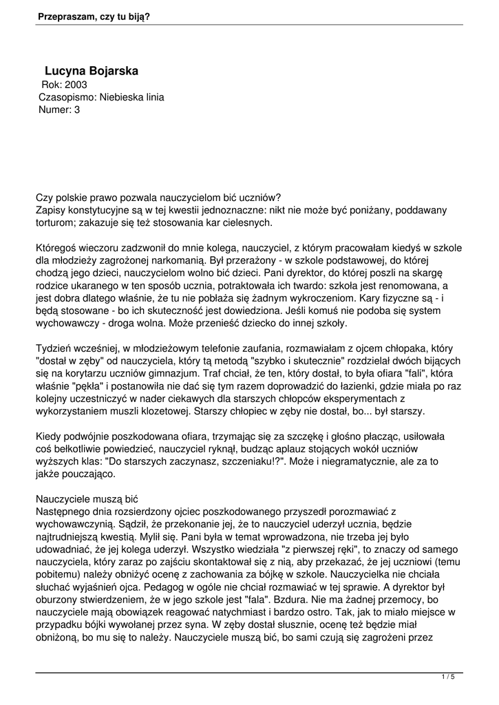 Przepraszam, czy tu biją? Lucyna Bojarska Rok: 2003 Czasopismo: Niebieska linia Numer: 3 Czy polskie prawo pozwala nauczycielom bić uczniów? Zapisy konstytucyjne są w tej kwestii jednoznaczne: nikt nie może być poniżany, poddawany torturom; zakazuje się też stosowania kar cielesnych. Któregoś wieczoru zadzwonił do mnie kolega, nauczyciel, z którym pracowałam kiedyś w szkole dla młodzieży zagrożonej narkomanią. Był przerażony - w szkole podstawowej, do której chodzą jego dzieci, nauczycielom wolno bić dzieci. Pani dyrektor, do której poszli na skargę rodzice ukaranego w ten sposób ucznia, potraktowała ich twardo: szkoła jest renomowana, a jest dobra dlatego właśnie, że tu nie pobłaża się żadnym wykroczeniom. Kary fizyczne są - i będą stosowane - bo ich skuteczność jest dowiedziona. Jeśli komuś nie podoba się system wychowawczy - droga wolna. Może przenieść dziecko do innej szkoły. Tydzień wcześniej, w młodzieżowym telefonie zaufania, rozmawiałam z ojcem chłopaka, który "dostał w zęby" od nauczyciela, który tą metodą "szybko i skutecznie" rozdzielał dwóch bijących się na korytarzu uczniów gimnazjum. Traf chciał, że ten, który dostał, to była ofiara "fali", która właśnie "pękła" i postanowiła nie dać się tym razem doprowadzić do łazienki, gdzie miała po raz kolejny uczestniczyć w nader ciekawych dla starszych chłopców eksperymentach z wykorzystaniem muszli klozetowej. Starszy chłopiec w zęby nie dostał, bo... był starszy. Kiedy podwójnie poszkodowana ofiara, trzymając się za szczękę i głośno płacząc, usiłowała coś bełkotliwie powiedzieć, nauczyciel ryknął, budząc aplauz stojących wokół uczniów wyższych klas: "Do starszych zaczynasz, szczeniaku!?". Może i niegramatycznie, ale za to jakże pouczająco. Nauczyciele muszą bić Następnego dnia rozsierdzony ojciec poszkodowanego przyszedł porozmawiać z wychowawczynią. Sądził, że przekonanie jej, że to nauczyciel uderzył ucznia, będzie najtrudniejszą kwestią. Mylił się. Pani była w temat wprowadzona, nie trzeba jej było udowadniać, że jej kolega uderzył. Wszystko wiedziała "z pierwszej ręki", to znaczy od samego nauczyciela, który zaraz po zajściu skontaktował się z nią, aby przekazać, że jej uczniowi (temu pobitemu) należy obniżyć ocenę z zachowania za bójkę w szkole. Nauczycielka nie chciała słuchać wyjaśnień ojca. Pedagog w ogóle nie chciał rozmawiać w tej sprawie. A dyrektor był oburzony stwierdzeniem, że w jego szkole jest "fala". Bzdura. Nie ma żadnej przemocy, bo nauczyciele mają obowiązek reagować natychmiast i bardzo ostro. Tak, jak to miało miejsce w przypadku bójki wywołanej przez syna. W zęby dostał słusznie, ocenę też będzie miał obniżoną, bo mu się to należy. Nauczyciele muszą bić, bo sami czują się zagrożeni przez 1/5 Przepraszam, czy tu biją? uczniów. Bandytyzmu się nie toleruje. Tradycja bicia Miesiąc przed tą rozmową przypadkiem usłyszałam w autobusie fragment rozmowy dwóch kobiet: w szkole, do której chodzą dzieci jednej z nich, zapowiedziano na wywiadówkach, że w związku z demoralizacją uczniów, nauczyciele będą stosowali kary fizyczne. Tak postanowiła rada pedagogiczna. Słuchając tego, przypomniałam sobie wakacyjną rozmowę z pewnym młodym studentem. Jego znacznie młodszy brat chodził do szkoły podstawowej, w której również poinformowano rodziców, że "będzie się biło". Rodzice natychmiast podzielili się na dwa obozy: jedni zareagowali entuzjastycznie, drudzy twierdzili, że bić w ogóle nie należy. Dyskusja była ostra, obie strony wysuwały rozmaite argumenty. Mama mojego rozmówcy na początku nie zajęła stanowiska, uważnie wsłuchiwała się w argumenty obu stron. Już się zaczęła przychylać do poglądów stronnictwa "twardej ręki", kiedy dotarło do niej, że najwięcej ma w nim do powiedzenia były policjant, wyrzucony z pracy za pobicie po pijanemu zatrzymanego. W dodatku wszyscy wiedzą, że od lat stosuje przemoc wobec własnej rodziny. Policjant przytoczył stary jak świat argument: "Mnie nauczyciele lali i wyrosłem na porządnego człowieka". To zmroziło wahającą się mamę. Rodzina debatowała przy różnych okazjach, ale nie udało jej się wypracować jednoznacznego stanowiska. Postawa rodziców Wygląda na to, że niezdecydowanych rodziców jest najwięcej. To najczęściej ci, którzy w domu biją dzieci "umiarkowanie" (cokolwiek by to miało znaczyć) i tylko wtedy, kiedy "sytuacja bezwzględnie tego wymaga". Są jednak między niezdecydowanymi i tacy, którzy co prawda sami nie stosują wobec swoich dzieci przemocy, jednak uważają, że oprócz grzecznych dzieci, do szkoły chodzi tzw. margines, do którego nie przemawiają żadne zwyczajne metody wychowawcze, więc być może danie nauczycielom prawa do "przemawiania do nich w języku, który są w stanie zrozumieć", czyli języku siły, poprawi sytuację w szkole. Jednak wahają się, bo "być może", ale nie "na pewno"... Krzysztof Brzeziński z Biura Rzecznika Praw Dziecka, opowiada o jeszcze jednym typie postaw rodziców. Jego zdaniem - najgorszym. Bywa, że rodzice tzw. trudnych uczniów wzywani do szkoły, wysłuchują nauczyciela, a potem skracają rozmowę "odbijając piłeczkę" z powrotem na stronę szkoły. Przez chwilę narzekają na złe zachowanie swojego dziecka, a potem stwierdzają: "Pan mu przyłoży - ja pozwalam!". I teraz niech się martwi nauczyciel. Niech sobie radzi. Tylko konkrety Alicja Gryczyńska, pedagog szkolny z warszawskiej Pragi, zna takie przypadki z własnej praktyki. I uważa, że wbrew pozorom praca z takim rodzicem jest całkiem łatwa. Jedną trudność bowiem już mamy pokonaną: jest jasne, że rodzic stosuje w domu kary fizyczne. Kiedy pytamy ich o to wprost, nie chcą się przyznać, zaprzeczają. Z takimi rodzicami rozmawiamy o konkretach. "Pan stosuje taką metodę, bo niektórzy mówią