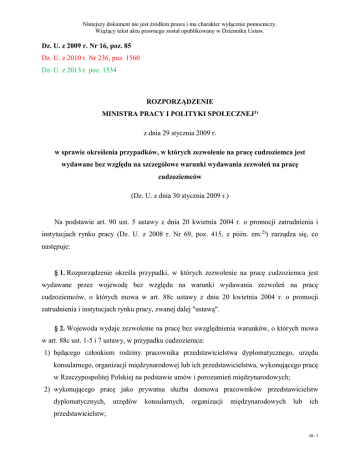 Niniejszy dokument nie jest źródłem prawa i ma charakter wyłącznie pomocniczy. Wiążący tekst aktu prawnego został opublikowany w Dzienniku Ustaw. Dz. U. z 2009 r. Nr 16, poz. 85 Dz. U. z 2010 r. Nr 236, poz. 1560 Dz. U. z 2013 r. poz. 1534 ROZPORZĄDZENIE MINISTRA PRACY I POLITYKI SPOŁECZNEJ1) z dnia 29 stycznia 2009 r. w sprawie określenia przypadków, w których zezwolenie na pracę cudzoziemca jest wydawane bez względu na szczegółowe warunki wydawania zezwoleń na pracę cudzoziemców (Dz. U. z dnia 30 stycznia 2009 r.) Na podstawie art. 90 ust. 5 ustawy z dnia 20 kwietnia 2004 r. o promocji zatrudnienia i instytucjach rynku pracy (Dz. U. z 2008 r. Nr 69, poz. 415, z późn. zm.2)) zarządza się, co następuje: § 1. Rozporządzenie określa przypadki, w których zezwolenie na pracę cudzoziemca jest wydawane przez wojewodę bez względu na warunki wydawania zezwoleń na pracę cudzoziemców, o których mowa w art. 88c ustawy z dnia 20 kwietnia 2004 r. o promocji zatrudnienia i instytucjach rynku pracy, zwanej dalej "ustawą". § 2. Wojewoda wydaje zezwolenie na pracę bez uwzględnienia warunków, o których mowa w art. 88c ust. 1-5 i 7 ustawy, w przypadku cudzoziemca: 1) będącego członkiem rodziny pracownika przedstawicielstwa dyplomatycznego, urzędu konsularnego, organizacji międzynarodowej lub ich przedstawicielstwa, wykonującego pracę w Rzeczypospolitej Polskiej na podstawie umów i porozumień międzynarodowych; 2) wykonującego pracę jako prywatna służba domowa pracowników przedstawicielstw dyplomatycznych, urzędów konsularnych, organizacji międzynarodowych lub ich przedstawicielstw; str. 1 Niniejszy dokument nie jest źródłem prawa i ma charakter wyłącznie pomocniczy. Wiążący tekst aktu prawnego został opublikowany w Dzienniku Ustaw. 3) uprawnionego na zasadach określonych w aktach prawnych wydanych przez organy powołane na mocy Układu ustanawiającego stowarzyszenie między Europejską Wspólnotą Gospodarczą a Turcją, podpisanego w Ankarze dnia 12 września 1963 r. (Dz. Urz. WE L 217 z 29.12.1964, str. 3687; Dz. Urz. UE Polskie wydanie specjalne, rozdz. 11, t. 11, str. 10). § 3. Wojewoda wydaje zezwolenie na pracę bez konieczności uzyskania informacji, o której mowa w art. 88c ust. 1 pkt 2 ustawy, w przypadku: 1) cudzoziemca upoważnionego do reprezentowania przedsiębiorcy zagranicznego w jego oddziale lub przedstawicielstwie znajdującym się na terytorium Rzeczypospolitej Polskiej; 2) obywatela Republiki Białoruś, Republiki Gruzji, Republiki Mołdowy, Federacji Rosyjskiej lub Ukrainy, wykonującego prace pielęgnacyjno-opiekuńcze lub jako pomoc domowa na rzecz osób fizycznych w gospodarstwie domowym; 2) obywatela Republiki Armenii, Republiki Białorusi, Republiki Gruzji, Republiki Mołdowy, Federacji Rosyjskiej lub Ukrainy, wykonującego prace pielęgnacyjno-opiekuńcze lub jako pomoc domowa na rzecz osób fizycznych w gospodarstwie domowym;1 3) obywatela Republiki Białoruś, Republiki Gruzji, Republiki Mołdowy, Federacji Rosyjskiej lub Ukrainy, który w okresie bezpośrednio poprzedzającym złożenie wniosku o wydanie zezwolenia na pracę wykonywał przez okres nie krótszy niż 3 miesiące pracę dla tego samego podmiotu na podstawie oświadczenia o zamiarze powierzenia wykonywania pracy, zarejestrowanego w powiatowym urzędzie pracy właściwym ze względu na siedzibę lub miejsce zamieszkania składającego oświadczenie - pod warunkiem przedstawienia zarejestrowanego oświadczenia i zaświadczenia o zatrudnieniu lub umowy oraz kopii dokumentów potwierdzających opłacanie składek na ubezpieczenie społeczne, jeżeli były wymagane w związku z wykonywaniem pracy; 3) obywatela Republiki Armenii, Republiki Białorusi, Republiki Gruzji, Republiki Mołdowy, Federacji Rosyjskiej lub Ukrainy, który w okresie bezpośrednio poprzedzającym złożenie wniosku o wydanie zezwolenia na pracę wykonywał przez okres nie krótszy niż 3 miesiące pracę dla tego samego podmiotu i na tym samym stanowisku na podstawie umowy zawartej w formie pisemnej, jeżeli przed podjęciem przez cudzoziemca pracy powiatowy urząd pracy, W brzmieniu nadanym przez rozporządzenie Ministra Pracy i Polityki Społecznej z dnia 28 listopada 2013 r. zmieniającego rozporządzenie w sprawie określenia przypadków, w których zezwolenie na pracę cudzoziemca jest wydawane bez względu na szczegółowe warunki wydawania zezwoleń na pracę cudzoziemców (Dz. U. poz. 1534), które weszło w życie w dniu 1.01.2014 r. 1 str. 2 Niniejszy dokument nie jest źródłem prawa i ma charakter wyłącznie pomocniczy. Wiążący tekst aktu prawnego został opublikowany w Dzienniku Ustaw. właściwy ze względu na miejsce pobytu stałego lub siedzibę podmiotu powierzającego wykonywanie pracy, zarejestrował pisemne oświadczenie tego podmiotu o zamiarze powierzenia wykonywania pracy temu cudzoziemcowi – pod warunkiem przedstawienia zarejestrowanego oświadczenia i umowy oraz dokumentów potwierdzających opłacanie składek na ubezpieczenie społeczne, jeżeli były wymagane w związku z wykonywaniem pracy;2 4) cudzoziemca - trenera sportowego lub sportowca, wykonującego pracę na rzecz klubów sportowych i innych podmiotów, których działalność statutowa obejmuje upowszechnianie kultury fizycznej i sportu; 5) lekarza i lekarza dentysty, odbywającego szkolenie lub realizującego program specjalizacji, na podstawie przepisów w sprawie specjalizacji lekarzy i lekarzy dentystów. § 4. (uchylony). § 5. Traci moc rozporządzenie Ministra Pracy i Polityki Społecznej z dnia 21 lipca 2006 r. w sprawie określenia przypadków, w których przyrzeczenie i zezwolenie na pracę cudzoziemca wydawane jest bez względu na sytuację na lokalnym rynku pracy i kryteria wydawania przyrzeczeń i zezwoleń na pracę cudzoziemców (Dz. U. Nr 141, poz. 1004). § 6. Rozporządzenie wchodzi w życie z dniem 1 lutego 2009 r. ______ 1) Minister Pracy i Polityki Społecznej ki