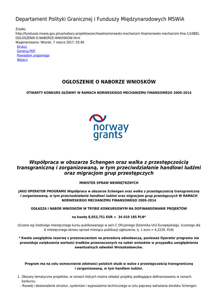 Departament Polityki Granicznej i Funduszy Międzynarodowych MSWiA Źródło: http://fundusze.mswia.gov.pl/ue/nabory-projektow/archiwalne/norweski-mechanizm-fina/norweski-mechanizm-fina-1/10881, OGLOSZENIE-O-NABORZE-WNIOSKOW.html Wygenerowano: Wtorek, 7 marca 2017, 03:40 Drukuj Generuj PDF Powiadom znajomego Wstecz OGŁOSZENIE O NABORZE WNIOSKÓW OTWARTY KONKURS GŁÓWNY W RAMACH NORWESKIEGO MECHANIZMU FINANSOWEGO 2009–2014 Współpraca w obszarze Schengen oraz walka z przestępczością transgraniczną i zorganizowaną, w tym przeciwdziałanie handlowi ludźmi oraz migracjom grup przestępczych MINISTER SPRAW WEWNĘTRZNYCH JAKO OPERATOR PROGRAMU Współpraca w obszarze Schengen oraz walka z przestępczością transgraniczną i zorganizowaną, w tym przeciwdziałanie handlowi ludźmi oraz migracjom grup przestępczych W RAMACH NORWESKIEGO MECHANIZMU FINANSOWEGO 2009–2014 OGŁASZA I NABÓR WNIOSKÓW W TRYBIE KONKURSOWYM NA DOFINANSOWANIE PROJEKTÓW na kwotę 8,053,751 EUR = 34 010 185 PLN* (liczone wg średniego miesięcznego kursu publikowanego w serii C Oficjalnego Dziennika Unii Europejskiego, liczonego dla 6 miesięcznego okresu sprzed miesiąca publikacji ogłoszenia, tj. 1 euro = 4,2229. PLN) * Kwota uwzględnia rezerwę z przeznaczeniem na procedurę odwoławczą, ponieważ Operator programu nie przewiduje zwiększenia wartości środków przeznaczonych na nabór wniosków w przypadku uwzględnienia ewentualnych odwołań Wnioskodawców. Program ma na celu wzmocnienie zdolności polskich służb w walce z przestępczością transgraniczną i zorganizowaną, w tym handlem ludźmi. 1. Obszary tematyczne projektów, w ramach których można składać projekty podlegające dofinansowaniu w ramach konkursu Rozwój i doskonalenie struktur, systemów i wyposażenia technicznego w celu poprawy wdrażania dorobku Schengen ❍ Zwiększone zdolności służb w zapobieganiu i zwalczaniu przestępczości transgranicznej i zorganizowanej, w tym handlu ludźmi i migracji grup przestępczych Wzmocniona współpraca między władzami a właściwymi podmiotami zainteresowanymi, w tym organizacjami pozarządowymi, przy udzielaniu pomocy ofiarom handlu ludźmi 2. Typy działań kwalifikowanych w projektach podlegających dofinansowaniu w ramach konkursu Szkolenia Organizacja konferencji, wizyt studyjnych, seminariów, itp. Rozwój struktur i systemów 3. Rodzaje podmiotów, które mogą ubiegać się o dofinansowanie: Instytucje z sektora finansów publicznych, takie jak jednostki podległe Ministerstwu Spraw Wewnętrznych oraz Ministerstwu Finansów (w tym Policja, Straż Graniczna, Służba Celna) Organizacje pozarządowe* i organizacje międzynarodowe zaangażowane w sprawy związane z zapobieganiem, dochodzeniem i ściganiem przestępczości, bezpieczeństwem publicznym lub przeciwdziałaniem handlowi ludźmi i pomocy ofiarom handlu ludźmi * organizacja pozarządowa: wolontariacka organizacja non–profit ustanowiona jako osoba prawna o celach niekomercyjnych, niezależna od władz lokalnych, regionalnych i centralnych, podmiotów publicznych, partii politycznych i podmiotów gospodarczych. Instytucje religijne i partie polityczne nie są uznawane za organizacje pozarządowe. 4. Projekty partnerskieOperator Programu zachęca wnioskodawców do składania wniosków wspólnie z partnerem pochodzącym z Państw Darczyńców (Norwegia), którego udział na etapie aplikowania potwierdzony jest Listem Intencyjnym (lub umową partnerską) stanowiącym jeden z załączników do wniosku.Promotor projektu (Wnioskodawca) pochodzi zawsze z Polski i jest odpowiedzialny za złożenie wniosku o dofinansowanie.Za realizację projektu Partnerskiego Operator Programu przyznaje dodatkowe 5 pkt podczas oceny merytorycznej wniosku aplikacyjnego. Partnerstwo nie jest wymagane. 5. Fundusz Współpracy DwustronnejJednym z narzędzi zacieśniania współpracy partnerstwa jest tzw. Fundusz Współpracy Dwustronnej (FWD). Operator Programu rezerwuje część kwoty z budżetu Programu w wysokości 176 471 EUR, tj. 745 219 PLN na potrzeby FWD na poziomie Programu podczas jego wdrażania.W ramach całkowitego budżetu FWD do wykorzystania przez Beneficjentów końcowych udostępniona będzie kwota w wysokości 158 824 EUR, tj. 670 697 PLN Kwota ta zostanie udostępniona dla nawiązywania kontaktów, wymiany, dzielenia się i transferu wiedzy, technologii, doświadczenia i najlepszych praktyk pomiędzy Beneficjentami projektów a podmiotami w Norwegii.Kwota w wysokości 17 647 EUR, tj. 74 521 PLN, zostanie przeznaczona na działania inicjowane przez Operatora Programu zgodnie z aneksem II do umowy w sprawie programu. W przypadku nie wykorzystania w naborze przez Beneficjentów końcowych całej kwoty przeznaczonej na realizację FWD, pozostałe środki zostaną przeznaczone na działania inicjowane przez Operatora Programu.Operator Programu nie przewiduje odrębnego naboru wniosków na działania finansowane ze środków FWD. Formularz wniosku aplikacyjnego zawiera pozycje do uzupełnienia przez Wnioskodawców ubiegających się o środki FWD.Katalog działań kwalifikowalnych do dofinansowania w ramach FWD powinien korespondować z art. 7.7 punkt 1 Regulacji ws. wdrażania Norweskiego Mechanizmu Finansowego (NMF) 2009–2014: 1. Opłaty i koszty podróży związane z udziałem w konferencjach, seminariach, kursach, spotkaniach i warsztatach; 2. Koszty podróży w ramach wizyt studyjnych; 3. Koszty podróży i wynagrodzenia za wizyty ekspertów; 4. Koszty konferencji, seminariów, kursów, spotkań i warsztatów; 5. Działania informacyjno – promocyjne; 6. Opłaty za doradztwo zewnętrzne. [Koszty podróży zgodnie z ust. 1, obejmują diety zgodnie z art. 7.3, ust. 1 b) Regulacji]Maksymalna wartość dofinansowania działań realizowanych z FWD wynosi 10 000 EUR, tj. 42 229 PLN dla pojedynczego projektu z maksymalnym poziomem dofinansowania z NMF wynoszącym 85% kwalifikowalnych kosztów projektu.Negatywna ocena działań