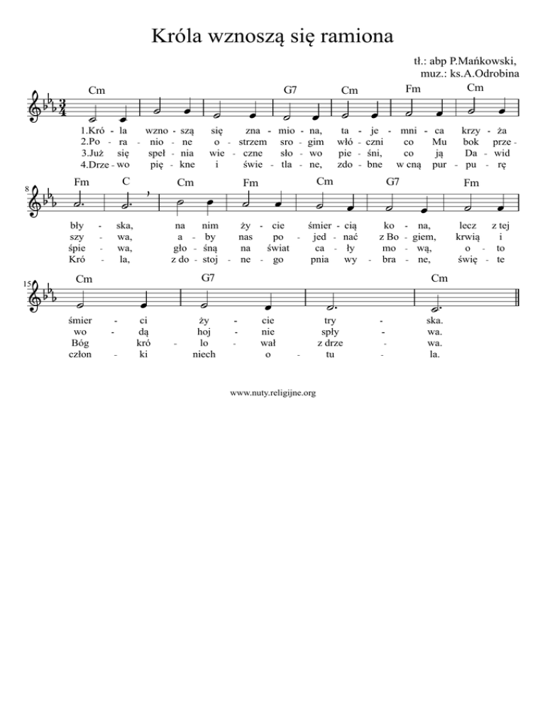 Króla wznoszą się ramiona G7 Cm Cm 43 1.Kró 2.Po 3.Już 4.Drze 8 tł.: abp P.Mańkowski, muz.: ks.A.Odrobina Cm Fm Fm bły szy śpie Kró wzno szą nio ne speł nia pię kne C Cm ska, wa, wa, la, na a gło z do śmier wo Bóg człon się o wie i zna mio strzem sro czne sło świe tla na, gim wo ne, Cm Fm nim by śną stoj ży nas na ne ta włó pie zdo cie po świat go śmier jed ca pnia G7 Cm 15 la ra się wo je czni śni, bne mni ca co Mu co ją w cną pur G7 cią nać ły wy ko z Bo mo bra ci dą kró ki ży hoj lo niech cie nie wał o www.nuty.religijne.org ża prze wid rę Fm na, giem, wą, ne, Cm krzy bok Da pu try spły z drze tu ska. wa. wa. la. lecz krwią o świę z tej i to te
