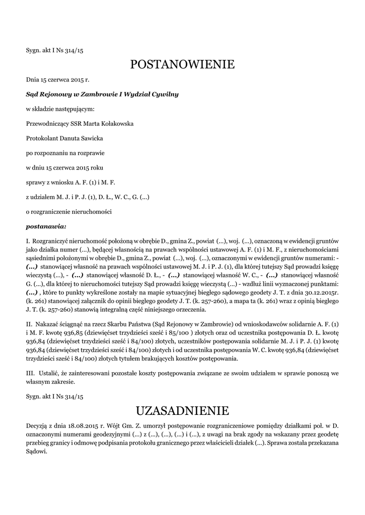 Sygn. akt I Ns 314/15 POSTANOWIENIE Dnia 15 czerwca 2015 r. Sąd Rejonowy w Zambrowie I Wydział Cywilny w składzie następującym: Przewodniczący SSR Marta Kołakowska Protokolant Danuta Sawicka po rozpoznaniu na rozprawie w dniu 15 czerwca 2015 roku sprawy z wniosku A. F. (1) i M. F. z udziałem M. J. i P. J. (1), D. Ł., W. C., G. (...) o rozgraniczenie nieruchomości postanawia: I. Rozgraniczyć nieruchomość położoną w obrębie D., gmina Z., powiat (...), woj. (...), oznaczoną w ewidencji gruntów jako działka numer (...), będącej własnością na prawach wspólności ustawowej A. F. (1) i M. F., z nieruchomościami sąsiednimi położonymi w obrębie D., gmina Z., powiat (...), woj. (...), oznaczonymi w ewidencji gruntów numerami: (...) stanowiącej własność na prawach wspólności ustawowej M. J. i P. J. (1), dla której tutejszy Sąd prowadzi księgę wieczystą (...), - (...) stanowiącej własność D. Ł., - (...) stanowiącej własność W. C., - (...) stanowiącej własność G. (...), dla której to nieruchomości tutejszy Sąd prowadzi księgę wieczystą (...) - wzdłuż linii wyznaczonej punktami: (...) , które to punkty wykreślone zostały na mapie sytuacyjnej biegłego sądowego geodety J. T. z dnia 30.12.2015r. (k. 261) stanowiącej załącznik do opinii biegłego geodety J. T. (k. 257-260), a mapa ta (k. 261) wraz z opinią biegłego J. T. (k. 257-260) stanowią integralną część niniejszego orzeczenia. II. Nakazać ściągnąć na rzecz Skarbu Państwa (Sąd Rejonowy w Zambrowie) od wnioskodawców solidarnie A. F. (1) i M. F. kwotę 936,85 (dziewięćset trzydzieści sześć i 85/100 ) złotych oraz od uczestnika postępowania D. Ł. kwotę 936,84 (dziewięćset trzydzieści sześć i 84/100) złotych, uczestników postępowania solidarnie M. J. i P. J. (1) kwotę 936,84 (dziewięćset trzydzieści sześć i 84/100) złotych i od uczestnika postępowania W. C. kwotę 936,84 (dziewięćset trzydzieści sześć i 84/100) złotych tytułem brakujących kosztów postępowania. III. Ustalić, że zainteresowani pozostałe koszty postępowania związane ze swoim udziałem w sprawie ponoszą we własnym zakresie. Sygn. akt I Ns 314/15 UZASADNIENIE Decyzją z dnia 18.08.2015 r. Wójt Gm. Z. umorzył postępowanie rozgraniczeniowe pomiędzy działkami poł. w D. oznaczonymi numerami geodezyjnymi (...) z (...), (...), (...) i (...), z uwagi na brak zgody na wskazany przez geodetę przebieg granicy i odmowę podpisania protokołu granicznego przez właścicieli działek (...). Sprawa została przekazana Sądowi. A. i M. małż. F. wnosili o rozgraniczenie działki oznaczonej numerem geodez. (...) poł. w D., stanowiącej ich własność z działkami położonymi w tej miejscowości, oznaczonymi numerami geodez. (...) stanowiącej własność M. i P. J. (1), (...) stanowiącej własność D. Ł., (...) stanowiącej własność W. C. i działki (...)- będącej własnością G. (...), według granicy wynikającej z osnowy geodezyjnej z 1926 r. Uczestnicy M. i P. J. (2) nie wyrazili zgody na wytoczony przebieg granicy, dokonany przez geodetę w toku postępowania administracyjnego i wnieśli o rozgraniczenie ich działki wg przebiegu posadowionego przez nich ogrodzenia. Uczestniczka D. Ł. zgadzała się na przebieg granicy oznaczony w postępowaniu administracyjnym, jednak odmówiła podpisania protokołu granicznego. Uczestnik W. C. w postępowaniu administracyjnym nie wyraził zgody na wytyczony przebieg granicy, dokonany przez geodetę i odmówił podpisania protokołu. Na etapie postępowania sądowego wskazywał na przebieg granicy wg wskazanej w postępowaniu administracyjnym. G. (...) wskazywała na przebieg granicy wg wskazanej w postępowaniu administracyjnym. Sąd ustalił i zważył co następuje: Na wniosek A. F. (1) Urząd G. (...) wszczął postępowanie rozgraniczeniowe, dotyczące ustalenia granicy działki nr (...) z działkami (...) poł. w D.. Czynności na gruncie celem wytyczenie przebiegu granicy przeprowadził geodeta S. O.. Przy ustalaniu punktów granicznych geodeta brał pod uwagę: plan scaleniowy z 1932 r., operat z pomiaru uzupełniajacego gruntów z 1960 r., operat z podziału działki nr (...) z 1989 r., operat z podziału działki nr (...) z 2006 r., operat z rozgraniczenia działek nr (...) z 2013 r., operat z modernizacji ewidencji gruntów z 2008 r. Właścicielami działki (...) są A. i M. małż. F.. Działkę (poprzednio nr (...)) nabyli na podstawie umowy przekazania własności i posiadania gospodarstwa z dn. 13.04.1981 r. Działka (...) stanowi własność M. i P. J. (1). Działka (...) stanowi własność D. Ł., a działka (...) jest własnością W. C.. Działka (...) stanowi drogę, będącą własnością G. (...). Powyższy stan faktyczny Sąd ustalił w oparciu o: opinię biegłego geodety J. T. (k. 257-265), dokumentację administracyjnego postępowania rozgraniczeniowego (k. 3-198), oględziny (k. 235-237), kopię umowy przekazania z 1981r. (k. 386-388). Stosownie do art. 153 kc. jeżeli granice gruntów stały się sporne, a stanu prawnego nie można stwierdzić, ustala się granice wg ostatniego spokojnego stanu posiadania. Gdyby również takiego stanu nie można było stwierdzić sąd ustala granice z uwzględnieniem wszelkich okoliczności. Wymienione wyżej kryteria, a mianowicie „stan prawny” „ostatni stan spokojnego posiadania” i wszelkie okoliczności wyłączają się wzajemnie - dopóki więc możliwe jest ustalenie granic na podstawie pierwszego kryterium niedopuszczalne jest sięganie po dalsze. Niedopuszczalne jest dokonanie rozgraniczenia w oparciu o względy celowości, a z pominięciem stanu prawnego przedmiotu rozgraniczenia (zob. postanowienie Sądu Najwyższego z dnia 22 kwietnia 1974 r., sygn. akt III CRN 41/74, publ. OSP 1975/4/96 – LEX nr 1102429). W sprawie Sąd dokonał rozgraniczenia działek (...) z działkami (...) w oparciu o stan prawny. Stan prawny jest tu ustaleniem pr