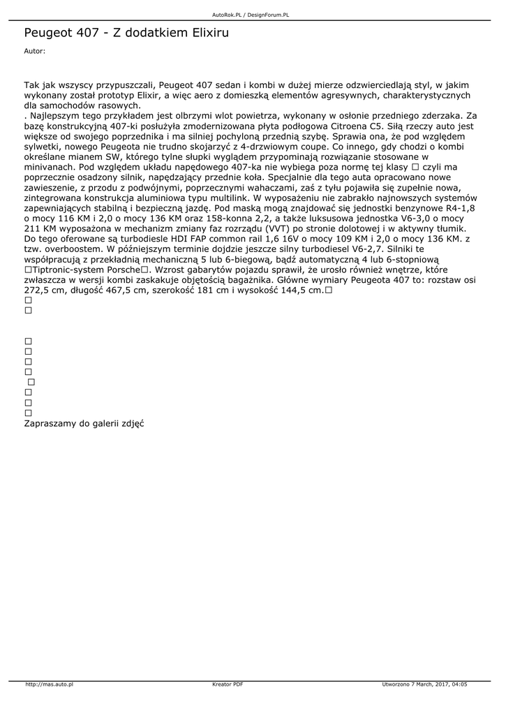 AutoRok.PL / DesignForum.PL Peugeot 407 - Z dodatkiem Elixiru Autor: Tak jak wszyscy przypuszczali, Peugeot 407 sedan i kombi w dużej mierze odzwierciedlają styl, w jakim wykonany został prototyp Elixir, a więc aero z domieszką elementów agresywnych, charakterystycznych dla samochodów rasowych. . Najlepszym tego przykładem jest olbrzymi wlot powietrza, wykonany w osłonie przedniego zderzaka. Za bazę konstrukcyjną 407-ki posłużyła zmodernizowana płyta podłogowa Citroena C5. Siłą rzeczy auto jest większe od swojego poprzednika i ma silniej pochyloną przednią szybę. Sprawia ona, że pod względem sylwetki, nowego Peugeota nie trudno skojarzyć z 4-drzwiowym coupe. Co innego, gdy chodzi o kombi określane mianem SW, którego tylne słupki wyglądem przypominają rozwiązanie stosowane w minivanach. Pod względem układu napędowego 407-ka nie wybiega poza normę tej klasy czyli ma poprzecznie osadzony silnik, napędzający przednie koła. Specjalnie dla tego auta opracowano nowe zawieszenie, z przodu z podwójnymi, poprzecznymi wahaczami, zaś z tyłu pojawiła się zupełnie nowa, zintegrowana konstrukcja aluminiowa typu multilink. W wyposażeniu nie zabrakło najnowszych systemów zapewniających stabilną i bezpieczną jazdę. Pod maską mogą znajdować się jednostki benzynowe R4-1,8 o mocy 116 KM i 2,0 o mocy 136 KM oraz 158-konna 2,2, a także luksusowa jednostka V6-3,0 o mocy 211 KM wyposażona w mechanizm zmiany faz rozrządu (VVT) po stronie dolotowej i w aktywny tłumik. Do tego oferowane są turbodiesle HDI FAP common rail 1,6 16V o mocy 109 KM i 2,0 o mocy 136 KM. z tzw. overboostem. W późniejszym terminie dojdzie jeszcze silny turbodiesel V6-2,7. Silniki te współpracują z przekładnią mechaniczną 5 lub 6-biegową, bądź automatyczną 4 lub 6-stopniową Tiptronic-system Porsche. Wzrost gabarytów pojazdu sprawił, że urosło również wnętrze, które zwłaszcza w wersji kombi zaskakuje objętością bagażnika. Główne wymiary Peugeota 407 to: rozstaw osi 272,5 cm, długość 467,5 cm, szerokość 181 cm i wysokość 144,5 cm. Zapraszamy do galerii zdjęć http://mas.auto.pl Kreator PDF Utworzono 7 March, 2017, 04:05