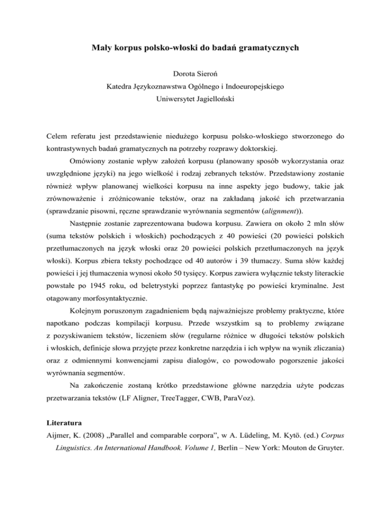 Mały korpus polsko-włoski do badań gramatycznych Dorota Sieroń Katedra Językoznawstwa Ogólnego i Indoeuropejskiego Uniwersytet Jagielloński Celem referatu jest przedstawienie niedużego korpusu polsko-włoskiego stworzonego do kontrastywnych badań gramatycznych na potrzeby rozprawy doktorskiej. Omówiony zostanie wpływ założeń korpusu (planowany sposób wykorzystania oraz uwzględnione języki) na jego wielkość i rodzaj zebranych tekstów. Przedstawiony zostanie również wpływ planowanej wielkości korpusu na inne aspekty jego budowy, takie jak zrównoważenie i zróżnicowanie tekstów, oraz na zakładaną jakość ich przetwarzania (sprawdzanie pisowni, ręczne sprawdzanie wyrównania segmentów (alignment)). Następnie zostanie zaprezentowana budowa korpusu. Zawiera on około 2 mln słów (suma tekstów polskich i włoskich) pochodzących z 40 powieści (20 powieści polskich przetłumaczonych na język włoski oraz 20 powieści polskich przetłumaczonych na język włoski). Korpus zbiera teksty pochodzące od 40 autorów i 39 tłumaczy. Suma słów każdej powieści i jej tłumaczenia wynosi około 50 tysięcy. Korpus zawiera wyłącznie teksty literackie powstałe po 1945 roku, od beletrystyki poprzez fantastykę po powieści kryminalne. Jest otagowany morfosyntaktycznie. Kolejnym poruszonym zagadnieniem będą najważniejsze problemy praktyczne, które napotkano podczas kompilacji korpusu. Przede wszystkim są to problemy związane z pozyskiwaniem tekstów, liczeniem słów (regularne różnice w długości tekstów polskich i włoskich, definicje słowa przyjęte przez konkretne narzędzia i ich wpływ na wynik zliczania) oraz z odmiennymi konwencjami zapisu dialogów, co powodowało pogorszenie jakości wyrównania segmentów. Na zakończenie zostaną krótko przedstawione główne narzędzia użyte podczas przetwarzania tekstów (LF Aligner, TreeTagger, CWB, ParaVoz). Literatura Aijmer, K. (2008) „Parallel and comparable corpora”, w A. Lüdeling, M. Kytö. (ed.) Corpus Linguistics. An International Handbook. Volume 1, Berlin – New York: Mouton de Gruyter. Biber, D. (1993) „Representativeness in Corpus Design”, Literary and Linguistic Computing, vol. 8(4) , str. 243-257. Górski, R., Łaziński, M. (2012) „Reprezentatywność i zrównoważenie korpusu”, w A. Przepiórkowski, M. Bańko, R. Górski, B. Lewandowska-Tomaszczyk. (ed.) Narodowy Korpus Języka Polskiego, Warszawa: Wydawnictwo Naukowe PWN. Koester, A. (2010) „Building small specialised corpora”, w A. O'Keeffe, M. McCarthy. (ed.) The Routledge Handbook of Corpus Linguistics, London & New York: Routledge. Sinclair, J. (2005) „Corpus and Text – Basic Principles”, w M. Wynne (ed.) Developing Linguistic Corpora: a Guide to Good Practice, Oxford: Oxbow Books.