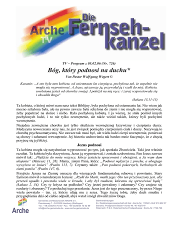 TV – Program z 05.02.06 (Nr. 726) Bóg, który podnosi na duchu* Von Pastor Wolf gang Wegert © Kazanie: „A oto była tam kobieta, od osiemnastu lat cierpiąca, pochylona tak, Ŝe zupełnie nie mogła się wyprostować. A Jezus, ujrzawszy ją, przywołał ją i rzekł do niej: Kobieto, uwolniona jesteś od choroby swojej. I połoŜył na nią ręce: i zaraz wyprostowała się i chwaliła Boga" (Łukasz 13,11-13) Ta kobieta, o której mówi nam nasz tekst Biblijny, była pochylona od osiemnastu lat. Nie wiem jak mocno schylona była, ale na pewno zawsze była schylona do ziemi i nie mogła się wyprostować, Ŝeby popatrzeć na słońce i niebo. Była pochyloną kobietą. I ja wierzę, Ŝe stała pośród innych pochylonych ludzi, i to nie tylko zewnętrznie, ale takŜe wśród takich, którzy byli pochyleni wewnętrznie. Niejedna zewnętrzna choroba jest tylko skutkiem wewnętrznej krzywizny i cierpienia duszy. Medycyna nowoczesna uczy nas, Ŝe jest związek pomiędzy cierpieniem ciała i duszy. Nazywają to chorobą psychosomatyczną. Nie zawsze tak musi być, ale wielu ludzi cierpi zewnętrznie, poniewaŜ są chorzy i załamani wewnętrznie. Jej historia uzdrowienia tak bardzo mnie fascynuje, Ŝe z chęcią przyjrzę się jej bliŜej. Jezus podnosi Ta kobieta mogła się natychmiast wyprostować po tym, jak spotkała Zbawiciela. Taki jest właśnie rezultat. Ta kobieta była skrzywiona, Jezus ją wyprostował, i została uzdrowiona. Pan Jezus zawsze mówił tak: „Pójdźcie do mnie wszyscy, którzy jesteście spracowani i obciąŜeni, a Ja wam dam ukojenie” (Mateusz 11, 28). Mamy, zatem Pana, który: „Podnosi nędzarza z prochu, a ubogiego wywyŜsza ze śmieci” (Psalm 113, 7). Czytamy takŜe: „Pan podnosi pokornych, bezboŜnych do ziemi poniŜa” (Psalm 147, 6). Przyjście Jezusa na Ziemię oznacza dla wierzących fundamentalną odnowę i powstanie. Stary Symeon mówił o narodzonym Jezusie: „Rzekł do Marii, matki jego: Oto ten przeznaczony jest, aby przezeń upadło i powstało wielu w Izraelu, i aby był znakiem, któremu się sprzeciwiać będą” (Łukasz 2, 34). Czy ty leŜysz na podłodze? Czy jesteś powalony i załamany? Czy czujesz się rozdarty i zburzony? To posłuchaj tego przesłania: Jezus jest do tego przeznaczony, by przez Niego wielu powstało – tzn. ci, którzy ufają mu z serca. Tego Ŝyczę tobie, Ŝeby duch smutku i przygnębienia dziś od ciebie odpadł, abyś wstał i mógł chwalił znów Boga. Arche Gemeinde und Missionswerk ARCHE e.V. Doerriesweg 7 • D-22525 Hamburg (Stellingen) Tel.: +49 (0)40/54 70 50 • Fax: +49 (0)40/54 70 52 99 [email protected] • www.arche-gemeinde.de Bankverbindungen Ev. Darlehensgenossenschaft eG Kiel • Konto-Nr. 113522 • BLZ 210 602 37 Schweiz: Postgiroamt Basel • Konto-Nr. 40-10270-9 Österreich: P.S.K. Österreichische Postsparkasse • Konto-Nr. 7726.796 Strona 2 - TV-Program 726 / „Bóg, który podnosi na duchu“ Jezus widział tą kobietę Interesujące jest to, jak ta historia się rozegrała. MoŜna sobie dobrze wyobrazić, Ŝe ta kobieta w Synagodze nie była za dobrze widoczna. Była kaleką i poszła na naboŜeństwo, ale z pewnością nie doszła do samego przodu. I z pewnością teŜ była zasłonięta przez ludzi stojących w rzędach przed nią. A jednak czytamy, Ŝe Jezus ją widział. MoŜe nikt nie wie, Ŝe jesteś przygnębiony i moŜe teŜ nisko pochylony. Jesteś jednym z pośród wielu. Kto to moŜe rozpoznać, jak to jest u ciebie? śaden człowiek tego nie moŜe ale Jezus tak. To znaczy: „On widział ją“ (Łukasz 13, 12). Kto wie, jak wielu smutnych i nędznych ludzi słyszy to kazanie? Nikt ich nie moŜe odkryć, ale Jezus ich widzi. On widzi teŜ ciebie, i to, co ciebie porusza, On widzi jak jesteś wykończony i jak leŜysz na ziemi. Jezus tą kobietę zawołał Jezus nie tylko tą kobietę widział, ale takŜe ją zawołał. Raz teŜ zawołał Zacheusza: „Zacheuszu zejdź śpiesznie, gdyŜ dziś muszę się zatrzymać w twoim domu” (Łukasz 19, 5). W podobny sposób wezwanie doszło do tej pochylonej kobiety. Pan dzisiaj teŜ woła jeszcze: „Pójdźcie do mnie wszyscy, którzy jesteście spracowani i obciąŜeni, a ja wam dam ukojenie” (Mateusz 11, 28). Chętnie teŜ chciałbym wiedzieć, jak ta kobieta miała na imię, poniewaŜ to wezwanie Jezusa nie było z pewnością anonimowe, jak np.: „Hallo, ta pani tam, tak pochylona. Proszę, niech pani przyjdzie do przodu!” Nie, Jezus na pewno zawołał ją po imieniu. Biblia juŜ w Starym Testamencie mówi: „Nazwałem cię twoim imieniem – moim jesteś!” (Izajasz 43, 1). To musiał być szok dla tej chorej. Myślała przecieŜ, Ŝe Jezus na pewno jej nie będzie widział takiej pochylonej. I nagle usłyszała swoje imię. My juŜ często tego doświadczyliśmy, Ŝe Bóg przez swoje Słowo i swojego Ducha przemówił do ludzi tak precyzyjnie i osobiście, Ŝe zadziałało to na nich jak konkretne wezwanie. Niektórzy telewizyjni widzowie dzwonili juŜ do nas i pytali się: „Skąd Pastor mnie zna?” Ale my, jako głoszący i duszpasterze jesteśmy tylko BoŜymi narzędziami. Tym, który wzywa rzeczywiście, jest Jezus. Gdy ta kobieta, w środku naboŜeństwa w Synagodze, usłyszała głośno swoje imię, z pewnością była przestraszona. Ale ona nie uciekła, lecz posłuchała. Poszła do przodu do Jezusa. Z pewnością była to dla niej nieprzyjemna sytuacja, najlepiej pozostałaby na swoim miejscu. Ale jakoś przyjść musiała. Czuła w swoim sercu pociągnięcie, tego, który ją zawołał. Wielu ludzi słyszy BoŜe wezwanie, ale nie są nim zainteresowani. Oni teŜ są moŜe obraŜeni i pochyleni przez swoje grzechy, uderzeni przez swoje Ŝycie, ale nie przychodzą. To są ci ludzie, którzy ogólnie wezwanie BoŜe słyszą, bo w pewnym sensie wszyscy jakoś słyszą zaproszenie od Boga. Ale jest takŜe wezwanie, któremu ludzkie serce nie jest w stanie się oprzeć. To jest tak, jak z miłością. 