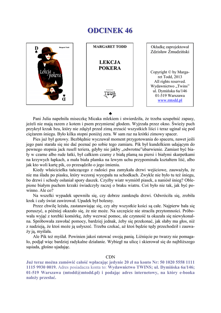 ODCINEK 46 MARGARET TODD Okładkę zaprojektował Zdzisław Żmudziński LEKCJA POKERA Copyright © by Margaret Todd, 2013 All rights reserved. Wydawnictwo „Twins” ul. Dymińska 6a/146 01-519 Warszawa www.mtodd.pl ♣ Pani Julia napełniła miseczkę Micaka mlekiem i stwierdziła, że trzeba uzupełnić zapasy, jeżeli nie mają razem z kotem i psem przymierać głodem. Wyjrzała przez okno. Świeży puch przykrył krzak bzu, który nie zdążył przed zimą zrzucić wszystkich liści i teraz uginał się pod ciężarem śniegu. Było kilka stopni poniżej zera. W sam raz na krótki zimowy spacer. Pies już był gotowy. Bezbłędnie wyczuwał moment przygotowania do spaceru, nawet jeśli jego pani starała się nie dać poznać po sobie tego zamiaru. Pik był kundelkiem udającym do pewnego stopnia jack rusell teriera, gdyby nie jakby „odwrotne”ubarwienie. Zamiast być biały w czarne albo rude łatki, był całkiem czarny z białą plamą na piersi i białymi skarpetkami na krzywych łapkach, a mała biała plamka na lewym uchu przypominała kształtem liść, albo jak kto woli kartę pik, co przesądziło o jego imieniu. Kiedy właścicielka tańczącego z radości psa zamykała drzwi wejściowe, zauważyła, że nie ma śladu po piasku, który wczoraj wysypała na schodkach. Zwykle nie było tu też śniegu, bo drzwi i schody osłaniał spory daszek. Czyżby wiatr wymiótł piasek, a naniósł śnieg? Oblepione białym puchem krzaki świadczyły raczej o braku wiatru. Coś było nie tak, jak być powinno. Ale co? Na wszelki wypadek upewniła się, czy dobrze zamknęła drzwi. Odwróciła się, zrobiła krok i cały świat zawirował. Upadek był bolesny. Przez chwilę leżała, zastanawiając się, czy aby wszystkie kości są całe. Najpierw bała się poruszyć, a później okazało się, że nie może. Na szczęście nie straciła przytomności. Próbowała wyjąć z torebki komórkę, żeby wezwać pomoc, ale czynność ta okazała się niewykonalna. Spróbowała zawołać pomocy, bardziej jednak, żeby się przekonać, jak słaby ma głos, niż z nadzieją, że ktoś może ją usłyszeć. Trzeba czekać, aż ktoś będzie tędy przechodził i zauważy ją, myślała. Ale Pik też myślał. Powinien jakoś ratować swoją panią. Liźnięcie po twarzy nie pomagało, podjął więc bardziej radykalne działanie. Wybiegł na ulicę i skierował się do najbliższego sąsiada, głośno ujadając. CDN Już teraz można zamówić całość wpłacając jedynie 20 zł na konto Nr: 50 1020 5558 1111 1115 9930 0019. Adres posiadacza konta to: Wydawnictwo TWINS; ul. Dymińska 6a/146; 01-519 Warszawa ([email protected]) i podając adres internetowy, na który e-booka należy przesłać.