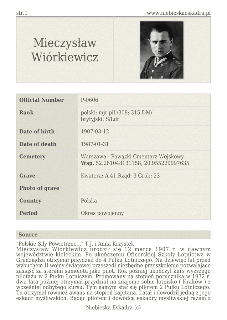 str.1 www.niebieskaeskadra.pl Mieczysław Wiórkiewicz Official Number P-0606 Rank polski: mjr pil./308; 315 DM/ brytyjski: S/Ldr Date of birth 1907-03-12 Date of death 1987-01-31 Cemetery Warszawa - Powązki Cmentarz Wojskowy Wsp. 52.261048131158, 20.955229997635 Grave Kwatera: A 41 Rząd: 3 Grób: 23 Photo of grave Country Polska Period Okres powojenny Source "Polskie Siły Powietrzne..." T.J. i Anna Krzystek Mieczysław Wiórkiewicz urodził się 12 marca 1907 r. w dawnym województwie kieleckim. Po ukończeniu Oficerskiej Szkoły Lotnictwa w Grudziądzu otrzymał przydział do 4 Pułku Lotniczego. Na dziewięć lat przed wybuchem II wojny światowej przeszedł niezbędne przeszkolenie pozwalające zasiąść za sterami samolotu jako pilot. Rok później ukończył kurs wyższego pilotażu w 2 Pułku Lotniczym. Promowany na stopień porucznika w 1932 r. dwa lata później otrzymał przydział na znajome sobie lotnisko ( Kraków ) z wcześniej odbytego kursu. Tym samym stał się pilotem 2 Pułku Lotniczego. Tu otrzymał również awans na stopień kapitana. Latał i dowodził jedną z jego eskadr myśliwskich. Będąc pilotem i dowódcą eskadry myśliwskiej razem z Niebieska Eskadra (c) str.2 www.niebieskaeskadra.pl nią ruszył na front we wrześniu 1939 r. Latał w lotnictwie Armii "Kraków" i "Lublin". Nie złożył broni. Po przedostaniu się do Francji znalazł się wśród lotników Grupy Montpellier. Dowodził Eskadrą Ćwiczebną w Lyonie. Z chwilą kapitulacji francuskiego sojusznika z grupą kolegów ewakuował się do Oranu. Była to samorzutna ewakuacja Polaków samolotem. Po lądowaniu Mietek z towarzyszami broni udał się pociągiem do Rabatu. Aby następnie autobusem dojechać do Casablanki. Tu zaokrętował się na statek idący w konwoju do Wielkiej Brytanii. Po dopłynięciu na Wyspę Ostatniej Nadziei po odpowiednim przeszkoleniu został skierowany do formowanego polskiego dywizjonu myśliwskiego. Od września 1940 do kwietnia 1941 r. miał honor i zaszczyt dowodzenia 308 Dywizjonem Myśliwskim Krakowskim. Odszedł z niego do służby w sztabie 11 Grupy Myśliwskiej. Pełnił funkcję oficera łącznikowego oraz oficera operacyjnego. Był też zastępcą Polskiego Oficera Łącznikowego w Fighter Command. Od początku maja do września 1942 r. dowodził 315 Dywizjonem Myśliwskim Dęblińskim. Po odwołaniu z tego polskiego dywizjonu przeszedł na stanowisko zastępcy dowódcy 1 Polskiego Skrzydła Myśliwskiego. Był zastępcą dowódcy 131 Portu Lotniczego. Od czerwca 1944 do maja 1945 r. szefował Wydziałem Wyszkolenia Personelu Latającego. Zmarł w Polsce w jej stolicy 31 stycznia 1987 r. Pochowany został na Cmentarzu Powązkowskim w Warszawie. Konrad RYDOŁOWSKI Mieczysław Wiórkiewicz urodził się w m. Młyny/k. Przysucha w rodzinie Stanisława i Antoniny Wiórkiewiczów (W. Grudniak) Niebieska Eskadra (c)