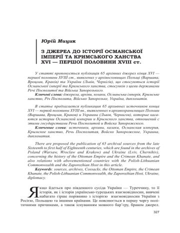 Юрій Мицик З ДЖЕРЕЛ ДО ІСТОРІЇ ОСМАНСЬКОЇ ІМПЕРІЇ ТА КРИМСЬКОГО ХАНСТВА ХVІ — ПЕРШОЇ ПОЛОВИНИ ХVІІІ ст. У статті пропонується публікація 65 архівних джерел кінця ХVІ — першої половини ХVІІІ ст., виявлених у архівосховищах Польщі (Варшава, Вроцлав, Краків) та України (Львів, Чернігів), що стосуються історії Османської імперії та Кримського ханства, стосунків з цими державами Речі Посполитої та Війська Запорозького. Ключові слова: джерела, архіви, козаки, Османська імперія, Кримське ханство, Річ Посполита, Військо Запорозьке, Україна, дипломатія. В статье предлагается публикация 65 архивных источников конца ХVI — первой половины ХVIII вв., выявленных в архивохранилищах Польши (Варшава, Вроцлав, Краков) и Украины (Львов, Чернигов), которые касаются истории Османской империи и Крымского ханства, отношений с этими государствами Речи Посполитой и Войска Запорожского. Ключевые слова: источники, архивы, казаки, Османская империя, Крымское ханство, Речь Посполитая, Войско Запорожское, Украина, дипломатия. There are proposed the publication of 65 archival sources from the late Sixteenth to first half of Eighteenth centuries, which are found in the archives of Poland (Warsaw, Wroclaw and Krakow) and Ukraine (Lviv, Chernihiv), concerning the history of the Ottoman Empire and the Crimean Khanate, and also relations with abovementioned countries with the Polish-Lithuanian Commonwealth and the Zaporozhian Host in this article. Keywords: sources, archives, Cossacks, the Ottoman Empire, the Crimean Khanate, the Polish-Lithuanian Commonwealth, the Zaporozhian Host, Ukraine, diplomacy. Я кщо йдеться про південного сусіда України — Туреччину, то її історія, як і історія українсько-турецьких взаємовідносин, вивчені набагато гірше порівняно з історією взаємовідносин України з Росією, Польщею та іншими країнами. Це пояснюється в першу чергу політичними причинами, а також існуванням мовного бар’єру, браком джерел. 327 МИЦИК ЮРІЙ Вищесказане стосується також історії Кримського ханства, яке протягом тривалого часу було васалом Османської імперії (варто відзначити, що архів Кримського ханства був знищений військами російського фельдмаршала Мініха у 1736 р.). Хоча в українській історичній науці існують певні традиції тюркології, однак в цьому напрямі були зроблені лише перші кроки. Особливої уваги потребує період турецького панування на землях південної України ХІV– ХVІІІ ст. У даній статті пропонується публікація текстів 65 джерел (переважно листів), виявлених нами у різний час у польських архівосховищах (Варшава, Вроцлав, Краків), а також чстково України (Львів, Чернігів), які було написано польською мовою або ж свого часу перекладено на неї з османської. Ці тексти наводяться повністю (всього 21) або у вигляді регестів чи уривків (всього 44). Дані джерела охоплюють період з 1589 по 1743 рр. і являють собою переважно дипломатичні матеріали. Це — умови мирних угод (№ 7), територіальних розмежувань (61), дипломатичні інструкції Речі Посполитої (№№ 8, 9, 15), звіти дипломатів Речі Посполитої (№№ 18, 31, 32, 33, 34, 44, 51, 64), листи короля Речі Посполитої Михайла Вишневецького (№ 42), молдавських господарів Михая Хороброго (10), Василя Лупу (№ 38), Костянтина (№ 1 додатків), кримських ханів Іслам-Ґірея ІІІ (№ 37), Мухамед-Ґірея ІV (№ 39), Аділь-Ґірея (№ 43) та інших кримських достойників, як от: Іслам — мурза (№ 48), Мустафа (№ 49), візир Батир-ага (№№ 46, 47); силістрійських пашів Османської імперії (№№ 53, 54), бендерського коменданта (№ 60), великих коронних гетьманів С. Жолкевського (№№ 19, 20, 21) та А. Сенявського (№№ 56, 57, 58, 59), коронного канцлера Яна Вєлопольського (№ 4