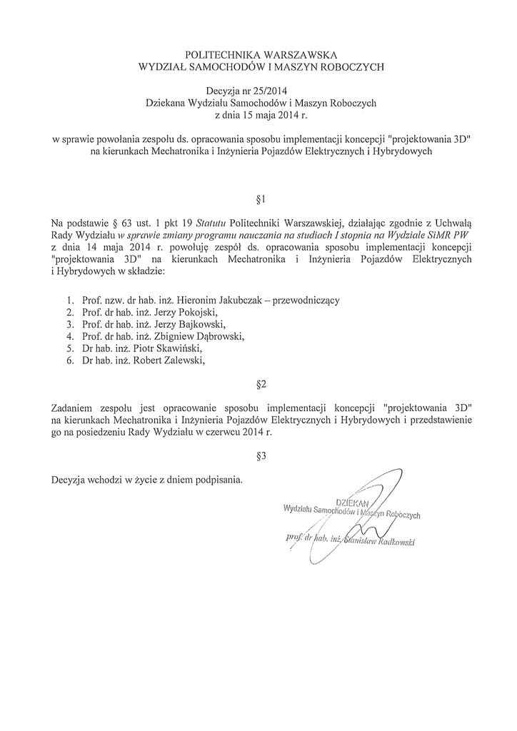 POLITECHNIKA WARSZAWSKA WYDZIAL SAMOCHODOW I MASZYN ROBOCZYCH Decyzja nr 25/2014 Dziekana Wydzialu Samochodow i Maszyn Roboczych z dnia 15 maja 2014 r. w sprawie powolania zespolu ds. opracowania sposobu implementacji koncepcji "projektowania 3D" na kierunkach Mechatronika i Inkynieria Pojazdow Elektrycznych i Hybrydowych Na podstawie § 63 ust. 1 pkt 19 &Mau Politechniki Warszawskiej, dzialajac zgodnie z Uchwalq Rady Wydzialu 14/ sprawie zmiany prop' C117111 nctuczctnia nct studiach I stopnict Ila Wydziale PW z dnia 14 maja 2014 r. powolujc zespol ds. opracowania sposobu implementacji koncepcji "projektowania 3D" na kierunkach Mechatronika i Inkynieria Pojazdow Elektrycznych i Hybrydowych w skladzie: 1. 2. 3. 4. 5. 6. Prof. nzw. dr hab. ink. Hieronim .Takubczak — przewodniczqcy Prof. dr hab. ink. Jerzy Pokojski, Prof. dr hab. ink. Jerzy Bajkowski, Prof. dr hab. ink. Zbigniew Dabrowski, Dr hab. ink. Piotr Skawinski, Dr hab. ink. Robert Zalewski, §2 Zadaniem zespolu jest opracowanie sposobu implementacji koncepcji "projektowania 3D" na kierunkach Mechatronika i Inkynieria Pojazdow Elektrycznych i Hybrydowych i przedstawienie go na posiedzeniu Rady Wydzialu w czerwcu 2014 r. §3 Decyzj a wchodzi w kycie z dniem podpisania. oziEKAN Wydzialu Samoofiodow i fKivqn Roboczych / prof V 11(.1 k 0 WS KI