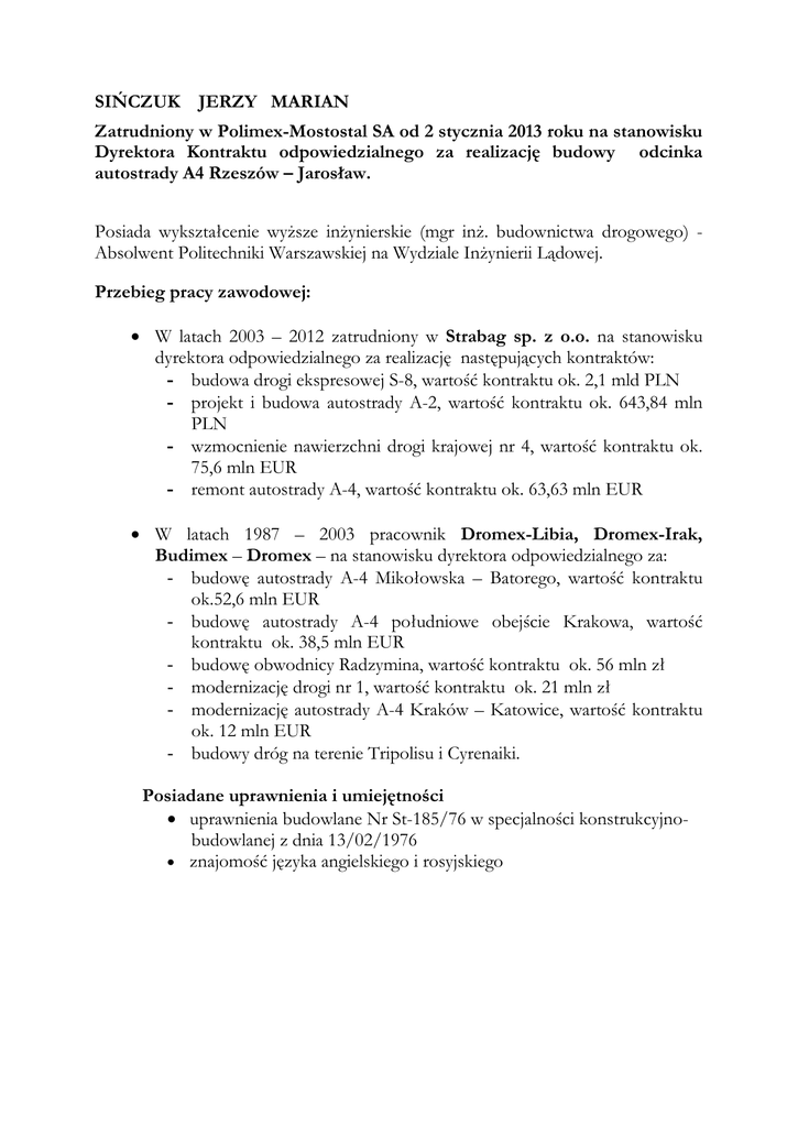 SIŃCZUK JERZY MARIAN Zatrudniony w Polimex-Mostostal SA od 2 stycznia 2013 roku na stanowisku Dyrektora Kontraktu odpowiedzialnego za realizację budowy odcinka autostrady A4 Rzeszów – Jarosław. Posiada wykształcenie wyŜsze inŜynierskie (mgr inŜ. budownictwa drogowego) Absolwent Politechniki Warszawskiej na Wydziale InŜynierii Lądowej. Przebieg pracy zawodowej: • W latach 2003 – 2012 zatrudniony w Strabag sp. z o.o. na stanowisku dyrektora odpowiedzialnego za realizację następujących kontraktów: - budowa drogi ekspresowej S-8, wartość kontraktu ok. 2,1 mld PLN - projekt i budowa autostrady A-2, wartość kontraktu ok. 643,84 mln PLN - wzmocnienie nawierzchni drogi krajowej nr 4, wartość kontraktu ok. 75,6 mln EUR - remont autostrady A-4, wartość kontraktu ok. 63,63 mln EUR • W latach 1987 – 2003 pracownik Dromex-Libia, Dromex-Irak, Budimex – Dromex – na stanowisku dyrektora odpowiedzialnego za: - budowę autostrady A-4 Mikołowska – Batorego, wartość kontraktu ok.52,6 mln EUR - budowę autostrady A-4 południowe obejście Krakowa, wartość kontraktu ok. 38,5 mln EUR - budowę obwodnicy Radzymina, wartość kontraktu ok. 56 mln zł - modernizację drogi nr 1, wartość kontraktu ok. 21 mln zł - modernizację autostrady A-4 Kraków – Katowice, wartość kontraktu ok. 12 mln EUR - budowy dróg na terenie Tripolisu i Cyrenaiki. Posiadane uprawnienia i umiejętności • uprawnienia budowlane Nr St-185/76 w specjalności konstrukcyjnobudowlanej z dnia 13/02/1976 • znajomość języka angielskiego i rosyjskiego
