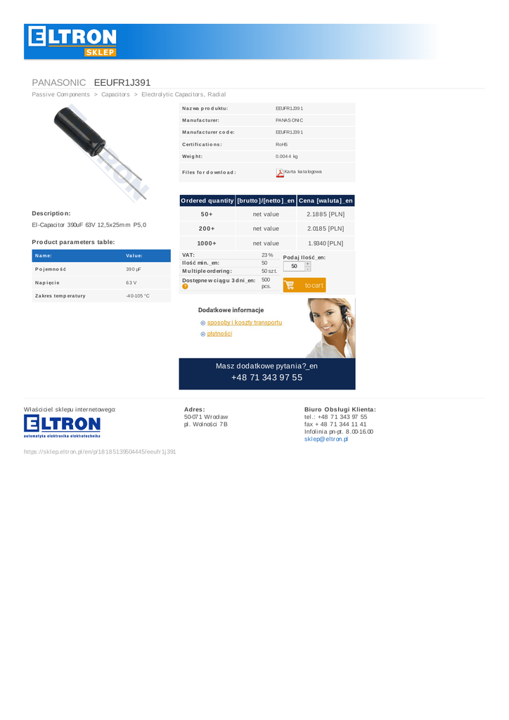 PANASONICEEUFR1J391 Passi veCom ponents > Capaci tor s > El ectr ol yti cCapaci tor s,Radi al N a z wa p ro d u ktu : EEUFR1J39 1 M a n u fa c tu rer: PANAS ONI C M a n u fa c tu rerc o d e: EEUFR1J39 1 C erti fi c a ti o n s : RoHS Wei g h t: 0.004 4 kg Ka rta ka ta logowa F i l es fo rd o wn l o a d : O rderedqua ntity [brutto ] /[netto ] _en Cena [wa luta ] _en Des criptio n: El -Capaci tor 390uF63V12,5x25m m P5,0 P ro ductpa ra m eters ta ble: 50+ netval ue 2.18 8 5[PLN] 200+ netval ue 2.018 5[PLN] 10 0 0 + netval ue 1.9340[PLN] 39 0µF VAT: Ilośćmin._en: M u ltipleord ering : 23% 50 50sz t. N a p i ęc i e 6 3V Dostępnewciąg u 3d ni_en: 500 pcs. Z a kres tem p era tu ry -4 0-105°C N a m e: Va l u e: P o j em n o ś ć Pod ajIlość_en: + 50 - tocart Maszdodatkowepytania?_en +48713439755 Wł aści ci el skl epui nter netowego: https://skl ep.el tr on.pl /en/p/18 18 5139504445/eeufr 1j 391 Adres : 50-07 1Wr ocł aw pl .Wol ności 7 B Biuro O bs ługiKlienta : tel .:+48 7 134397 55 fax+48 7 13441141 Infol i ni apn-pt.8 .00-16.00 skl ep@ el tr on.pl