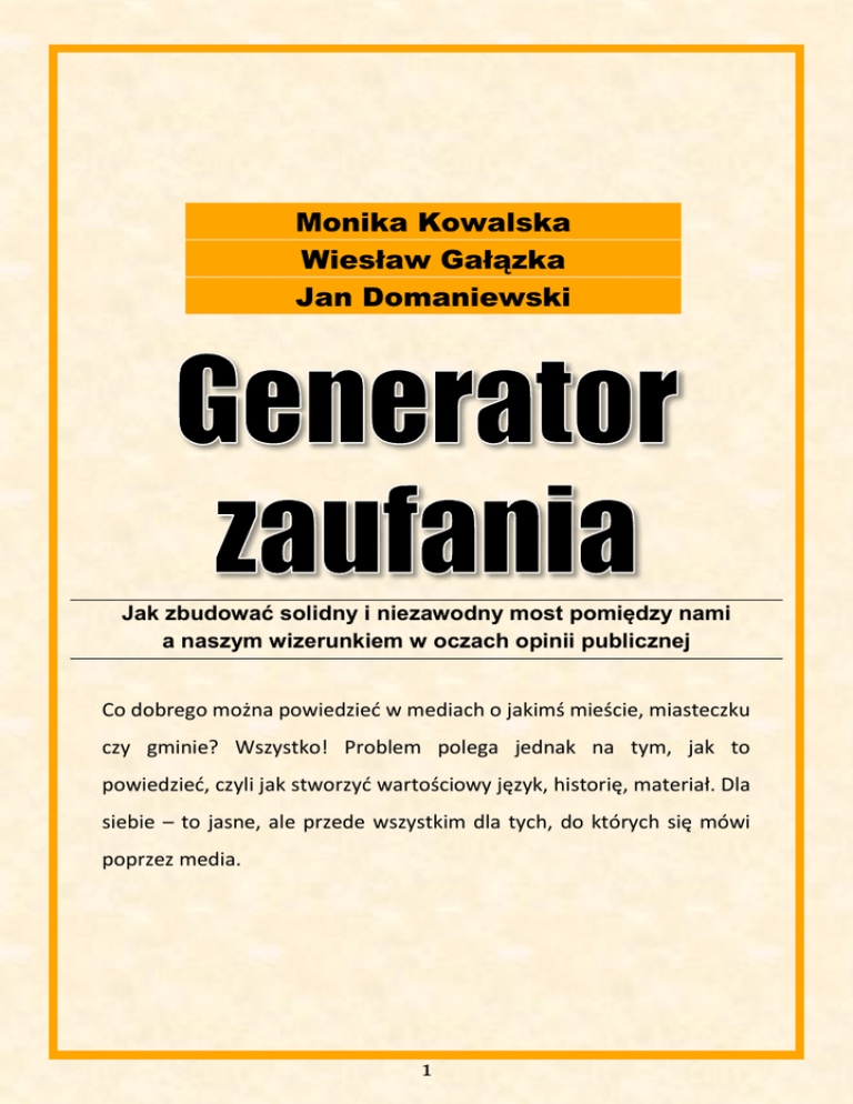 Monika Kowalska Wiesław Gałązka Jan Domaniewski Jak zbudować solidny i niezawodny most pomiędzy nami a naszym wizerunkiem w oczach opinii publicznej Co dobrego można powiedzieć w mediach o jakimś mieście, miasteczku czy gminie? Wszystko! Problem polega jednak na tym, jak to powiedzieć, czyli jak stworzyć wartościowy język, historię, materiał. Dla siebie – to jasne, ale przede wszystkim dla tych, do których się mówi poprzez media. 1 WSTĘP Obojętne, czy jesteśmy politykiem, urzędnikiem, działaczem lokalnym lub biznesmenem, zawsze zadajemy sobie to samo pytanie: dlaczego istnieje tak głęboki rów pomiędzy naszymi chęciami a tym, jak się nas przedstawia publicznie, najczęściej oczywiście w mediach? Odpowiedź jest prosta: w olbrzymim stopniu dlatego, że sami siebie nie doceniamy, a nawet zaniedbujemy. Nad tym rowem można bowiem wybudować w pełni kontrolowany przez nas most z trzech kolejnych elementów. Pierwszy to język, ale nie taki, który uruchamia strumień bezcelowych informacji. Chcemy zaprezentować metodę Stylebooka Komunikacji Zadaniowej, która ma na uwadze przede wszystkim to, co odpowiedni język ma zdziałać w świadomości odbiorcy. Język, który w codziennej komunikacji ma siłę najlepszego przekazu reklamowego z dopracowanym każdym wyrazem i przecinkiem. Drugi element to poligon dla Komunikacji Zadaniowej, czyli metoda autoanalizy: odnalezienie własnego etosu na podstawie analizy naszego potencjału wizerunkowego, zdefiniowanie wizerunku niechcianego oraz zapanowanie nad nim, pozycjonowanie i w efekcie rekonstrukcja wizerunku uruchamiająca to wszystko, co jest naszym autentycznym atutem. Trzecim elementem jest sprawny transport tego, co stworzyliśmy, na arenę publiczną, czyli metoda synchronizacji, w której chodzi o to, aby media otrzymały odpowiedni przekaz, który nie jest jedynie kompromisem oczekiwań obu stron, ale w pełni je satysfakcjonuje. Media – jeśli chodzi o wartość dla odbiorców, nas – jeśli chodzi o zakładany wizerunek. Te trzy elementy to prawdziwy generator zaufania, który umożliwia interesujące i wartościowe dla wszystkich zaistnienie w mediach. A co najważniejsze, zrozumiałe w swojej wymowie. Zapraszamy do zapoznania się z naszym e-bookiem. 2 Jest związany z panelem „Jak wygrać wybory”, który odbędzie się podczas świdnickiego Kongresu Regionów 2013. Ale nie chodzi tu o sprawne zagrywki PR-owe czy manipulację opinią publiczną. Wygrywa ten, kto budzi autentyczne zaufanie oraz ma niekłamane poważanie. Często na długo przed pójściem do urn. Obojętne, o jakie wybory chodzi. 3 SPIS TREŚCI ROZDZIAŁ I: JĘZYK ZYSKU, CZYLI KOMUNIKACJA ZADANIOWA 5 ROZDZIAŁ II: LEGENDA WŁASNA, CZYLI AUTOANALIZA 10 ROZDZIAŁ III: ODPOWIEDNI PRZEKAZ, CZYLI SYNCHRONIZACJA O AUTORACH 15 17 4 ROZDZIAŁ I JĘZYK ZYSKU, CZYLI KOMUNIKACJA ZADANIOWA MAMY PROBLEM… W odróżnieniu od języka reklamy czy marketingu język tzw. relacji zewnętrznych (opinia publiczna, klienci, interesariusze zewnętrzni wobec podmiotu komunikacji itd.) oraz wewnętrznych (pracownicy, członkowie danej społeczności bądź organizacji, która jest podmiotem komunikacji) budowany jest zwykle bez ścisłych założeń co do wizerunku, który ma wygenerować w umyśle odbiorcy komunikatu. Z kolei język reklamy i marketingu nie mógłby być wzorem dla języka komunikacji zewnętrznej oraz wewnętrznej, bo jest obliczony na wywołanie stosunkowo prostych skojarzeń czy odruchów u odbiorcy, związanych przede wszystkim z nabywaniem określonych dóbr. Aż tak wąska funkcjonalność nie miałaby zastosowania w języku związanym z całą paletą najróżniejszych relacji międzyludzkich. Właśnie z powodu braku wzorców oraz metody w języku komunikacji i PR panuje olbrzymia dowolność, a osiąganie zamierzonych, niezwykle precyzyjnych celów jest po prostu niemożliwe. W środowisku osób zajmujących się w Polsce komunikacją oraz PR panuje przekonanie, że sfery tak niedookreślonej jak zwykła codzienna komunikacja (czyli nie reklamowa i nie marketingowa) nie da się kontrolować i programować na poziomie pojedynczych słów, pojęć, fraz oraz terminów. A nawet jeśli byłoby to możliwe, to i tak powstanie konstrukcja werbalna zbyt sztywna, żeby z niej w swobodny sposób korzystać. Z tego powodu obecny język relacji zewnętrznych oraz wewnętrznych firm, instytucji i organizacji jest tak naprawdę wyłącznie „informowaniem o działaniach”, nie zaś „budowaniem wizerunku i promocją własnych wartości” w sposób ściśle planowy – zadaniowy. Jednocześnie brak metody precyzyjnego zarządzania językiem relacji zewnętrznych i wewnętrznych powoduje, że firmy, organizacje, instytucje najczęściej 5 nie uświadamiają sobie własnego potencjału wizerunkowego. A to dlatego, że nie potrafią odnaleźć i nazwać konkretnymi, zrozumiałymi słowami wartości, które mogłyby tworzyć ich etos. Mówiąc prościej, nie potrafią wykorzystać własnych atutów, które dane im są z racji konkretnego miejsca, które zajmują w rzeczywistości, oraz z racji aktywności będących ich domeną. ATUTY NOWEGO SPOJRZENIA W reklamie każde słowo i przecinek mają sprzedawać produkt. Wbrew obiegowym opiniom w komunikacji zewnętrznej i wewnętrznej instytucji, osoby, organizacji czy firmy każde słowo oraz każdy przecinek mogą być wykorzystane z równym zyskiem. Nawet najdrobniejszy element komunikacji powinien mieć jeden zasadniczy cel: budować wizerunek i efektywnie generować zaufanie. Budować siłę szeroko rozumianej marki, aby myślano i mówiono o niej dokładnie tak, jak tego chcemy. To „czysty zysk” w najlepszym tego słowa znaczeniu. Temu służy innowacyjna metoda osiągania maksymalnego zysku z języka, czyli Stylebook Komunikacji Zadaniowej. Powstaje język, który się opłaca i „zarabia” na siebie. Wreszcie! Należy planować profesjonalne kampanie, można również angażować na