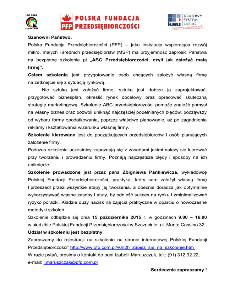 ISO 9001 ZETOM-CERT Szanowni Państwo, Polska Fundacja Przedsiębiorczości (PFP) – jako instytucja wspierająca rozwój mikro, małych i średnich przedsiębiorstw (MSP) ma przyjemność zaprosić Państwa na bezpłatne szkolenie pt. „ABC Przedsiębiorczości, czyli jak założyć małą firmę”. Celem szkolenia jest przygotowanie osób chcących założyć własną firmę na zetknięcie się z sytuacją rynkową. Nie sztuką jest założyć firmę, sztuką jest dobrze ją zaprojektować, przygotować biznesplan, określić rynek docelowy oraz opracować skuteczną strategię marketingową. Szkolenie ABC przedsiębiorczości pomoże znaleźć pomysł na własny biznes oraz pozwoli uniknąć najczęściej popełnianych błędów, począwszy od wyboru formy opodatkowania, poprzez właściwe planowanie, aż po zagadnienia reklamy i kształtowania wizerunku własnej firmy. Szkolenie kierowane jest do początkujących przedsiębiorców i osób planujących założenie firmy. Podczas szkolenia uczestnicy zapoznają się z zasadami jakimi należy się kierować przy tworzeniu i prowadzeniu firmy. Poznają najczęstsze błędy i sposoby na ich uniknięcie. Szkolenie prowadzone jest przez pana Zbigniewa Pankiewicza, wykładowcę Polskiej Fundacji Przedsiębiorczości, praktyka, który sam założył własną firmę I przeszedł przez wszystkie etapy jej tworzenia, a obecnie doradza jak optymalnie wykorzystywać własne zasoby i atuty, by odnieść sukces na rynku i zminimalizować ryzyko porażki. Kładzie duży nacisk na zajęcia praktyczne w oparciu o nowoczesne metodyki szkoleń. Szkolenie odbędzie się dnia 15 października 2015 r. w godzinach 9.00 – 16.00 w siedzibie Polskiej Fundacji Przedsiębiorczości w Szczecinie, ul. Monte Cassino 32. Udział w szkoleniu jest bezpłatny. Zapraszamy do rejestracji na szkolenie na stronie internetowej Polskiej Fundacji Przedsiębiorczości” http://www.pfp.com.pl/v6n2h_zapisz_sie_na_szkolenie.htm W razie pytań, prosimy o kontakt do pani Izabelli Maruszczak, tel.: (91) 312 92 22, e-mail: [email protected] Serdecznie zapraszamy ! ISO 9001 ZETOM-CERT Program szkolenia „ABC Przedsiębiorczości, czyli jak założyć małą firmę” Temat zajęć Godzina 9.00 – 9.15 Powitanie uczestników i wprowadzenie 9.15 – 10.30 Pakiet informacji na start: jakie urzędy trzeba odwiedzić jak wybrać biuro księgowe i przygotować się do rozmowy o formie opodatkowania kontakt z ZUS Projektowanie własnego biznesu - pomysł na biznes - czy to się może udać? 10.30 – 10.45 Przerwa 10.45 – 12.15 Przygotowanie biznesplanu, analiza finansowa inwestycji i działalności firmy. Koszty a przychody w firmie. 12.15 – 12.30 Przerwa 12.30 – 14.15 Badanie rynku i przygotowanie strategii marketingowej firmy. Strategia reklamy i bezkosztowego kształtowania wizerunku. 14.15 – 14.30 Przerwa 14.30 – 16.00 Strategie sprzedaży, budowanie bazy klientów, podstawowe techniki obsługi klientów. Zarządzanie czasem przedsiębiorcy. 16.00 Zakończenie szkolenia