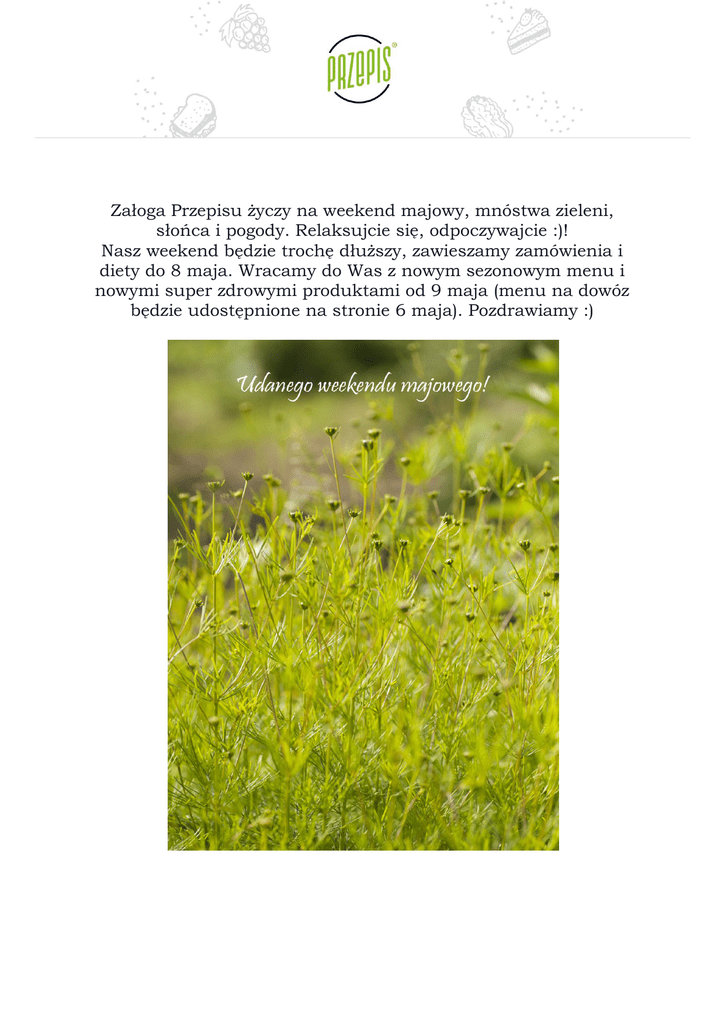 Załoga Przepisu życzy na weekend majowy, mnóstwa zieleni, słońca i pogody. Relaksujcie się, odpoczywajcie :)! Nasz weekend będzie trochę dłuższy, zawieszamy zamówienia i diety do 8 maja. Wracamy do Was z nowym sezonowym menu i nowymi super zdrowymi produktami od 9 maja (menu na dowóz będzie udostępnione na stronie 6 maja). Pozdrawiamy :)
