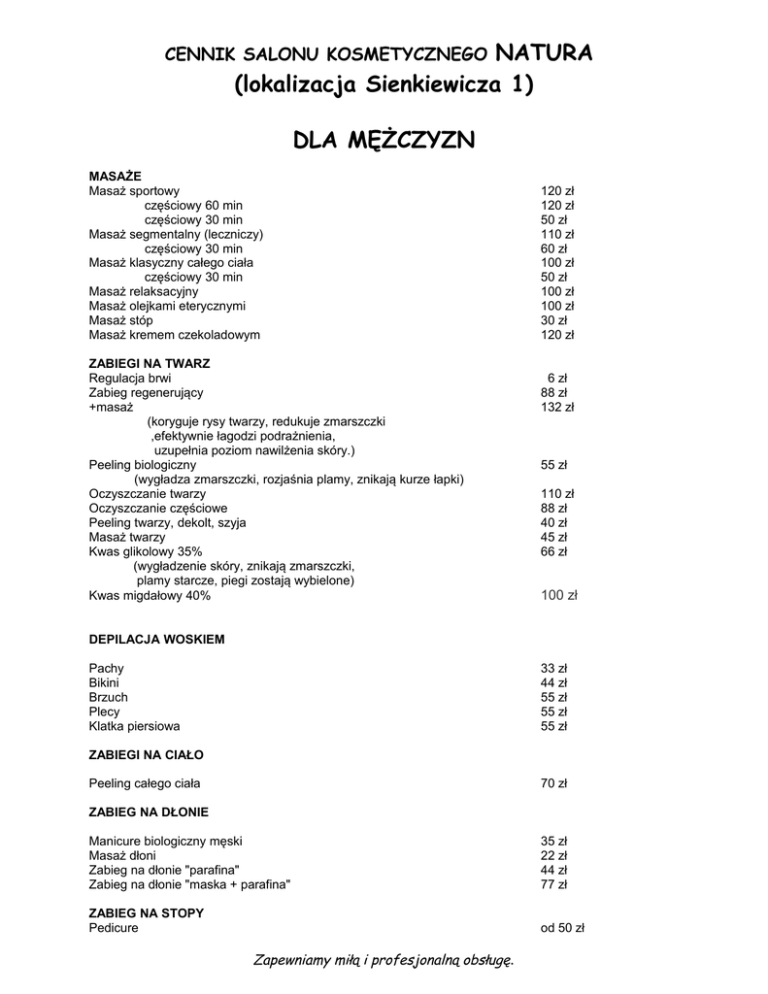 NATURA (lokalizacja Sienkiewicza 1) CENNIK SALONU KOSMETYCZNEGO DLA MĘŻCZYZN MASAŻE Masaż sportowy częściowy 60 min częściowy 30 min Masaż segmentalny (leczniczy) częściowy 30 min Masaż klasyczny całego ciała częściowy 30 min Masaż relaksacyjny Masaż olejkami eterycznymi Masaż stóp Masaż kremem czekoladowym ZABIEGI NA TWARZ Regulacja brwi Zabieg regenerujący +masaż (koryguje rysy twarzy, redukuje zmarszczki ,efektywnie łagodzi podrażnienia, uzupełnia poziom nawilżenia skóry.) Peeling biologiczny (wygładza zmarszczki, rozjaśnia plamy, znikają kurze łapki) Oczyszczanie twarzy Oczyszczanie częściowe Peeling twarzy, dekolt, szyja Masaż twarzy Kwas glikolowy 35% (wygładzenie skóry, znikają zmarszczki, plamy starcze, piegi zostają wybielone) Kwas migdałowy 40% 120 zł 120 zł 50 zł 110 zł 60 zł 100 zł 50 zł 100 zł 100 zł 30 zł 120 zł 6 zł 88 zł 132 zł 55 zł 110 zł 88 zł 40 zł 45 zł 66 zł 100 zł DEPILACJA WOSKIEM Pachy Bikini Brzuch Plecy Klatka piersiowa 33 zł 44 zł 55 zł 55 zł 55 zł ZABIEGI NA CIAŁO Peeling całego ciała 70 zł ZABIEG NA DŁONIE Manicure biologiczny męski Masaż dłoni Zabieg na dłonie "parafina" Zabieg na dłonie "maska + parafina" 35 zł 22 zł 44 zł 77 zł ZABIEG NA STOPY Pedicure od 50 zł Zapewniamy miłą i profesjonalną obsługę.