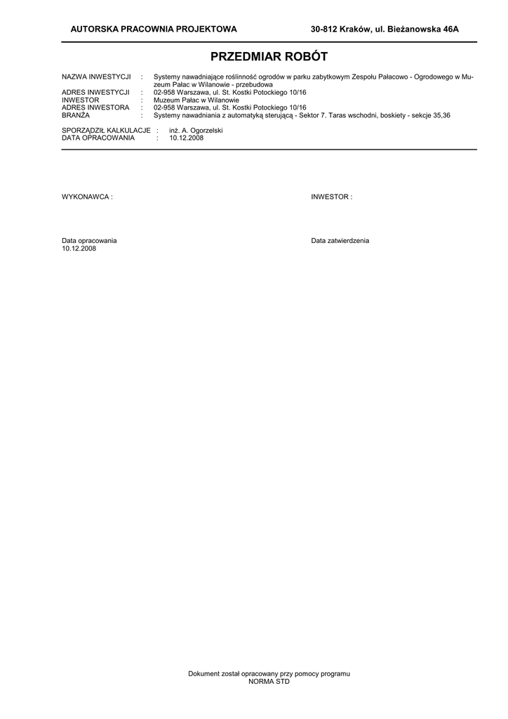 AUTORSKA PRACOWNIA PROJEKTOWA 30-812 Kraków, ul. BieŜanowska 46A PRZEDMIAR ROBÓT NAZWA INWESTYCJI : ADRES INWESTYCJI INWESTOR ADRES INWESTORA BRANśA : : : : Systemy nawadniające roślinność ogrodów w parku zabytkowym Zespołu Pałacowo - Ogrodowego w Muzeum Pałac w Wilanowie - przebudowa 02-958 Warszawa, ul. St. Kostki Potockiego 10/16 Muzeum Pałac w Wilanowie 02-958 Warszawa, ul. St. Kostki Potockiego 10/16 Systemy nawadniania z automatyką sterującą - Sektor 7. Taras wschodni, boskiety - sekcje 35,36 SPORZĄDZIŁ KALKULACJE : DATA OPRACOWANIA : inŜ. A. Ogorzelski 10.12.2008 WYKONAWCA : INWESTOR : Data opracowania 10.12.2008 Data zatwierdzenia Dokument został opracowany przy pomocy programu NORMA STD 1wilanów-nawodnienie-sektor 7 DZIAŁY KOSZTORYSU Lp. Nazwa działu Nawodnienie terenu parku w Wilanowie sektor 7 1 Roboty ziemne 2 Roboty drogowe 3 Rurociągi 3.1 Rurociągi - montaŜ 3.2 Rurociągi - materiał 4 Urządzenia 4.1 Urządzenia - montaŜ 4.2 Urządzenia - materiał 5 Uruchomienie instalacji automatycznego nawadniania 6 Kable energetyczne Od 1 7 16 16 25 50 50 52 55 56 -2- Norma STD Wersja 4.17 Do 6 15 49 24 49 54 51 54 55 56 1wilanów-nawodnienie-sektor 7 PRZEDMIAR Lp. Podst Opis i wyliczenia j.m. Nawodnienie terenu parku w Wilanowie sektor 7 1 Roboty ziemne 1 Roboty pomiarowe-tyczenie oraz inwentaryzacja powykonawcza trasy przewo- szt d.1 wycena in- dów i urządzeń za kaŜde rozpoczete 100m trasy dywidualna 4 szt 2 KNR 2-01 d.1 0701-01 3 KNR 2-01 d.1 0704-01 4 KNNR 1 d.1 0408-01 5 KNNR 1 d.1 0301-01 6 KNNR 1 d.1 0208-01 Ręczne kopanie rowów o głębok.0,4 m i szer.dna 0,3 w gruncie kat. I-II m 390 m Ręczne zasypywanie rowów dla kabli o głębok.do 0.4 m i szer.dna do 0.4 m w m gruncie kat. I-II 390 m Zagęszczanie nasypów z gruntu sypkiego kat.I-II ubijakami mechanicznymi m3 390*0.3*0.3 m3 Wykopy z załadunkiem ręcznym i transportem na odległość do 1 km (grunt kat. I-II) bez odspojenia (zał. szczegółowe pkt. 2.2) R -66r-g/100m3 390*0.3*0.1 m3 Dodatek za kaŜdy rozp. 1 km transportu ziemi samochodami samowyładowczymi po terenie lub drogach gruntowych (kat.gr. I-IV) Krotność = 14 11.7 m3 2 Roboty drogowe 7 KNR AT-03 Roboty remontowe - cięcie piłą nawierzchni bitumicznych na gł. do 5 cm d.2 0101-01 92*2 m3 m3 m 9 KNR AT-03 Roboty remontowe - cięcie piłą nawierzchni betonowych niespękanych - doda- m d.2 0101-05 tek za kaŜdy 1 cm ponad 6 cm Krotność = 4 92*2 m 11 KNNR 6 d.2 0801-06 12 KNR 4-01 d.2 0108-09 13 KNR 4-01 d.2 0108-10 14 KNNR 6 d.2 0109-01 Rozebranie nawierzchni z mas mineralno-bitumicznych gr. 4 cm ręcznie m2 92*0.6 m2 Rozebranie podbudowy z betonu gr. 10 cm mechanicznie m2 92*0.6 m2 Wywiezienie gruzu spryzmowanego samochodami skrzyniowymi na odl.do 1 km 55.2*0.14 m3 Wywiezienie gruzu spryzmowanego samochodami skrzyniowymi - za kaŜdy nast. 1 km Krotność = 14 55.2*0.14 m3 Podbudowy betonowe gr.10 cm pielęgnowane piaskiem i wodą m2 55.2 m2 15 KNR AT-04 Naprawy tymczasowe nawierzchni bitumicznych wykonywane na zimno - wyd.2 0105-03 boje o gł. do 5 cm 55.2 3 3.1 16 KNNR 4 d.3.1 1411-01 Norma STD Wersja 4.17 m3 m3 4.00 RAZEM 4.00 390.00 RAZEM 390.00 390.00 RAZEM 390.00 35.10 RAZEM 35.10 11.70 RAZEM 11.70 11.70 RAZEM 11.70 184.00 RAZEM 184.00 184.00 RAZEM 184.00 184.00 RAZEM 184.00 55.20 RAZEM 55.20 55.20 RAZEM 55.20 7.73 RAZEM 7.73 7.73 RAZEM 7.73 55.20 RAZEM 55.20 55.20 RAZEM 55.20 11.70 RAZEM 11.70 m2 m2 Rurociągi Rurociągi - montaŜ PodłoŜa pod kanały i obiekty z piasku grub. 10 cm m3 390*0.1*0.3 m3 -3- Razem m 8 KNR AT-03 Roboty remontowe - cięcie piłą nawierzchni betonowych niespękanych na gł. 6 m d.2 0101-04 cm 92*2 m 10 KNNR 6 d.2 0802-03 Poszcz 1wilanów-nawodnienie-sektor 7 PRZEDMIAR Lp. Podst Opis i wyliczenia j.m. 17 KNR-W 2-19 MontaŜ rurociągów z rur polietylenowych o śr. nominalnnej 63 mm z rur w zwo- m d.3.1 0301-06 jach - analogia 55 m 18 KNR-W 2-19 MontaŜ rurociągów z rur polietylenowych o śr. nominalnnej 50 mm z rur w zwo- m d.3.1 0301-05 jach - analogia 260 m 19 KNR-W 2-19 MontaŜ rurociągów z rur polietylenowych o śr. nominalnnej 40 mm z rur w zwo- m d.3.1 0301-04 jach - analogia 280 m 20 KNR-W 2-19 MontaŜ rurociągów z rur polietylenowych o śr. nominalnnej 20 mm z rur w zwo- m d.3.1 0301-01 jach - analogia 60 m 21 KNR-W 2-19 Oznakowanie trasy rurociągu ułoŜonego w ziemi taśmą z tworzywa sztucznego m d.3.1 0102-01 390 m 22 KNNR 5 d.3.1 0705-01 UłoŜenie rur osłonowych z PCW o śr.160 mm Arot - dwudzielne m 94 m 23 KNR-W 2-19 MontaŜ linii kroplującej z rur polietylenowych o śr. nominalnej 16mm w zwojach m d.3.1 0301-01 z umocowaniem szpilkami plastikowymi 4460 m 24 MontaŜ kształtek i materiałów pomocniczych dla instalacji aytomatycznego na- szt d.3.1 kalk. własna wadniania 115 szt 3.2 Rurociągi - materiał 25 Rurociągi z rur PE o śr. 63mm - materiał d.3.2 kalk. własna 55 Razem 55.00 RAZEM 55.00 260.00 RAZEM 260.00 280.00 RAZEM 280.00 60.00 RAZEM 60.00 390.00 RAZEM 390.00 94.00 RAZEM 94.00 4 460.00 RAZEM 4 460.00 115.00 RAZEM 115.00 55.00 RAZEM 55.00 260.00 RAZEM 260.00 280.00 RAZEM 280.00 60.00 RAZEM 60.00 390.00 RAZEM 390.00 94.00 RAZEM 94.00 4 460.00 RAZEM 4 460.00 28.00 RAZEM 28.00 1.00 RAZEM 1.00 6.00 RAZEM 6.00 m m 26 Rurociągi z rur PE o śr. 50mm - materiał d.3.2 kalk. własna 260 m 27 Rurociągi z rur PE o śr.40mm - materiał d.3.2 kalk. własna 280 m 28 Rurociągi z rur PE o śr.20mm - materiał d.3.2 kalk. własna 60 m 29 Oznakowanie trasy rurociągu taśmą - materiał d.3.2 analiza indywidualna 390 m 30 UłoŜenie rur osłonowych Arot 160 dwudzielnych - materiał d.3.2 analiza indywidualna 94 m 31 Linia kroplująca z rur PE 16 mm - materiał d.3.2 kalk. własna 4460 m 32 Kształtki dla instalacji automatycznego nawadniania d.3.2 kalk. własna - kolano 20 mm x 3/4" 28 kpl. 33 Kształtki dla instalacji automatycznego nawadniania d.3.2 kalk. własna - kolano 25 mm x 3/4" 1 kpl. 34 Kształtki dla instalacji automatycznego nawadniania d.3.2 kalk. własna 
