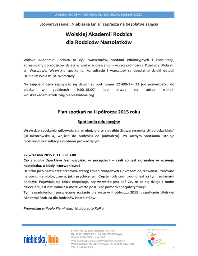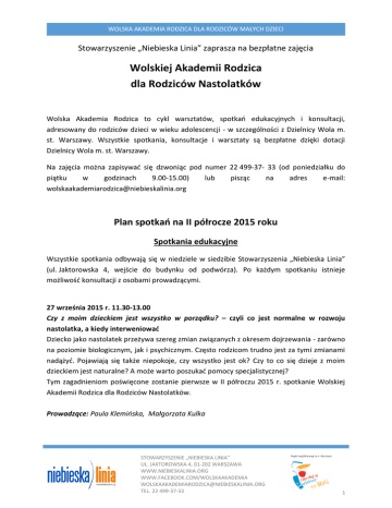 WOLSKA AKADEMIA RODZICA DLA RODZICÓW MAŁYCH DZIECI Stowarzyszenie „Niebieska Linia” zaprasza na bezpłatne zajęcia Wolskiej Akademii Rodzica dla Rodziców Nastolatków Wolska Akademia Rodzica to cykl warsztatów, spotkań edukacyjnych i konsultacji, adresowany do rodziców dzieci w wieku adolescencji - w szczególności z Dzielnicy Wola m. st. Warszawy. Wszystkie spotkania, konsultacje i warsztaty są bezpłatne dzięki dotacji Dzielnicy Wola m. st. Warszawy. Na zajęcia można zapisywać się dzwoniąc pod numer 22 499-37- 33 (od poniedziałku do piątku w godzinach 9.00-15.00) lub pisząc na adres e-mail: [email protected] Plan spotkań na II półrocze 2015 roku Spotkania edukacyjne Wszystkie spotkania odbywają się w niedziele w siedzibie Stowarzyszenia „Niebieska Linia” (ul. Jaktorowska 4, wejście do budynku od podwórza). Po każdym spotkaniu istnieje możliwość konsultacji z osobami prowadzącymi. 27 września 2015 r. 11.30-13.00 Czy z moim dzieckiem jest wszystko w porządku? – czyli co jest normalne w rozwoju nastolatka, a kiedy interweniować Dziecko jako nastolatek przeżywa szereg zmian związanych z okresem dojrzewania - zarówno na poziomie biologicznym, jak i psychicznym. Często rodzicom trudno jest za tymi zmianami nadążyć. Pojawiają się także niepokoje, czy wszystko jest ok? Czy to co się dzieje z moim dzieckiem jest naturalne? A może warto poszukać pomocy specjalistycznej? Tym zagadnieniom poświęcone zostanie pierwsze w II półroczu 2015 r. spotkanie Wolskiej Akademii Rodzica dla Rodziców Nastolatków. Prowadzące: Paula Klemińska, Małgorzata Kulka STOWARZYSZENIE „NIEBIESKA LINIA” UL. JAKTOROWSKA 4, 01-202 WARSZAWA WWW.NIEBIESKALINIA.ORG WWW.FACEBOOK.COM/WOLSKAAKADEMIA [email protected] TEL. 22 499-37-33 1 WOLSKA AKADEMIA RODZICA DLA RODZICÓW MAŁYCH DZIECI 11 października 2015 r. 11.30-13.00 Zagrożenia okresu dojrzewania Z okresem dojrzewania nieodłącznie kojarzą się problemy z zachowaniem nastolatków, np. wagary, alkohol i inne używki, ryzykowane zachowania seksualne itp. Podczas zajęć skupimy się na najczęściej występujących zagrożeniach oraz na tym, na co warto zwracać uwagę, jak reagować i - przede wszystkim - jak zapobiegać ich wystąpieniu. Prowadzące: Małgorzata Kulka, Magdalena Zięba 25 października 2015 r. 11.30-13.00 Rodzic też człowiek – czyli kilka słów o tym, jak być rodzicem nastolatka i nie oszaleć Bycie rodzicem nastolatka to nie lada wyzwanie. Jak odnaleźć się w sytuacji, kiedy mamy w domu młodego człowieka, który już nie jest dzieckiem, a jednocześnie nie jest jeszcze dorosły? Jaka jest rola rodzica w tym okresie? I jak sobie z tym wszystkim poradzić? O tym będziemy rozmawiać podczas kolejnego spotkania Wolskiej Akademii Rodzica. Prowadzące: Małgorzata Wincenciak, Magdalena Zięba 15 listopada 2015 r. 11.30-13.00 Poszukując oazy spokoju – czyli jak radzić sobie z emocjami w kontakcie z dorastającym dzieckiem Kontakt z nastolatkiem jest często dla rodzica niełatwy i budzi szereg silnych emocji, także tych nieprzyjemnych. Dlatego kolejne spotkanie chcemy poświęcić właśnie emocjom, z którymi mierzą się rodzice oraz sposobom na radzenie sobie z nimi. Prowadzące: Ewelina Nęcka, Małgorzata Wincenciak STOWARZYSZENIE „NIEBIESKA LINIA” UL. JAKTOROWSKA 4, 01-202 WARSZAWA WWW.NIEBIESKALINIA.ORG WWW.FACEBOOK.COM/WOLSKAAKADEMIA [email protected] TEL. 22 499-37-33 2 WOLSKA AKADEMIA RODZICA DLA RODZICÓW MAŁYCH DZIECI 22 listopada 2015 r. 11.30-13.00 Czym skorupka za młodu nasiąknie… - czyli o tym, czy wychowanie nastolatka jest w ogóle możliwe i – jeśli tak – to jak to robić Czy wychowanie nastolatka jest w ogóle możliwe? Jeśli tak, to jak to robić? Jak stawiać granice i jednocześnie nie zmieniać kontaktu z dzieckiem w ciąg kłótni? Odpowiedzi na te pytania przyniesie kolejne spotkanie edukacyjne Wolskiej Akademii Rodzica. Prowadzące: Paula Klemińska, Magdalena Zięba 29 listopada 2015 r. 11.30-13.00 Rozmowa z przybyszem z innej planety – czyli słów kilka o tym, co robić, aby komunikacja z nastolatkiem była jak najlepsza Czas dojrzewania jest często określanym okresem „burzy i naporu”. Jest to okres bardzo intensywnych zmian w funkcjonowaniu dzieci. Wielu rodziców zwraca uwagę na problemy w kontakcie z nastolatkami. Stąd ostatnie w tym roku spotkanie Wolskiej Akademii Rodzica chcemy poświęcić właśnie tematowi komunikacji i temu, co robić, aby była ona jak najlepsza. Prowadzące: Paula Klemińska, Agnieszka Wolańczyk Indywidualne konsultacje rodzicielskie Zapraszamy także na indywidualne konsultacje rodzicielskie ze specjalistami ze Stowarzyszenia „Niebieska Linia”. Każda konsultacja trwa ok. 50 min. Spotkania odbywają się w siedzibie Stowarzyszenia „Niebieska Linia” (ul. Jaktorowska 4, wejście od podwórza). Na konsultacje zapisywać się można dzwoniąc pod numer 22 499-37-33 (czynny od poniedziałku do piątku w godzinach 9.00-15.00). STOWARZYSZENIE „NIEBIESKA LINIA” UL. JAKTOROWSKA 4, 01-202 WARSZAWA WWW.NIEBIESKALINIA.ORG WWW.FACEBOOK.COM/WOLSKAAKADEMIA [email protected] TEL. 22 499-37-33 3 WOLSKA AKADEMIA RODZICA DLA RODZICÓW MAŁYCH DZIECI Warsztaty Wszystkie spotkania odbywają się w siedzibie Stowarzyszenia „Niebieska Linia” (ul. Jaktorowska 4, wejście od podwórza). Wiedzę przekazywaną podczas spotkań edukacyjnych warto ćwiczyć, utrwalać i poszerzać. Okazją do tego są bezpłatne warsztaty Wolskiej Akademii Rodzica. Podczas 6 spotkań będziemy koncentrować się na zagadnieniach takich jak: konstruktywne sposoby radzenia sobie z własnymi emocjami przez rodzica; wspieranie nastolatka w radzeniu sobie ze swoimi emocjami w trudnych dla niego sytuacjach; komunikacja bez przemocy; wpływ poszczególnych metod wychowawczych na relację rodzic - dziecko; relacje oparte na szacunku, zaufaniu i poszanowaniu granic rodzica i dziecka; stawianie granic; wpływ czynników chroniącyc