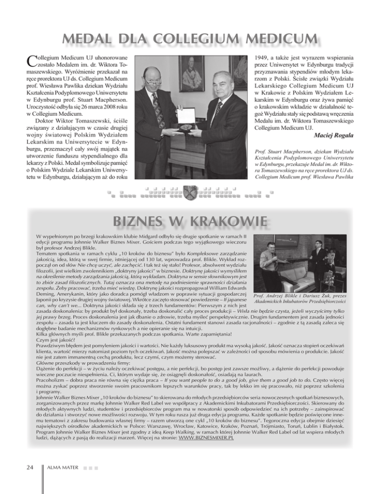MEDAL DLA COLLEGIUM MEDICUM C ollegium Medicum UJ uhonorowane zostało Medalem im. dr. Wiktora Tomaszewskiego. Wyróżnienie przekazał na ręce prorektora UJ ds. Collegium Medicum prof. Wiesława Pawlika dziekan Wydziału Kształcenia Podyplomowego Uniwersytetu w Edynburgu prof. Stuart Macpherson. Uroczystość odbyła się 26 marca 2008 roku w Collegium Medicum. Doktor Wiktor Tomaszewski, ściśle związany z działającym w czasie drugiej wojny światowej Polskim Wydziałem Lekarskim na Uniwersytecie w Edynburgu, przeznaczył cały swój majątek na utworzenie funduszu stypendialnego dla lekarzy z Polski. Medal symbolizuje pamięć o Polskim Wydziale Lekarskim Uniwersytetu w Edynburgu, działającym aż do roku 1949, a także jest wyrazem wspierania przez Uniwersytet w Edynburgu tradycji przyznawania stypendiów młodym lekarzom z Polski. Ścisłe związki Wydziału Lekarskiego Collegium Medicum UJ w Krakowie z Polskim Wydziałem Lekarskim w Edynburgu oraz żywa pamięć o krakowskim wkładzie w działalność tegoż Wydziału stały się podstawą wręczenia Medalu im. dr. Wiktora Tomaszewskiego Collegium Medicum UJ. Maciej Rogala Prof. Stuart Macpherson, dziekan Wydziału Kształcenia Podyplomowego Uniwersytetu w Edynburgu, przekazuje Medal im. dr. Wiktora Tomaszewskiego na ręce prorektora UJ ds. Collegium Medicum prof. Wiesława Pawlika BIZNES W KRAKOWIE W wypełnionym po brzegi krakowskim klubie Midgard odbyło się drugie spotkanie w ramach II edycji programu Johnnie Walker Biznes Mixer. Gościem podczas tego wyjątkowego wieczoru był profesor Andrzej Blikle. Tematem spotkania w ramach cyklu „10 kroków do biznesu” było Kompleksowe zarządzanie jakością, idea, którą w swej firmie, istniejącej od 130 lat, wprowadza prof. Blikle. Wykład rozpoczął on od słów Nie chcę uczyć, ale zachęcić. I tak też się stało! Profesor, absolwent wydziału filozofii, jest wielkim zwolennikiem „doktryny jakości” w biznesie. Doktrynę jakości wymyśliłem na określenie metody zarządzania jakością, którą wykładam. Doktryna w sensie słownikowym jest to zbiór zasad filozoficznych. Tutaj oznacza ona metodę na podniesienie sprawności działania zespołu. Żeby pracować, trzeba mieć wiedzę. Doktrynę jakości rozpropagował William Edwards Deming, Amerykanin, który jako doradca pomógł władzom w poprawie sytuacji gospodarczej Prof. Andrzej Blikle i Dariusz Żuk, prezes Japonii po kryzysie drugiej wojny światowej. Wkrótce zaczęto stosować powiedzenie – If japanese Akademickich Inkubatorów Przedsiębiorczości can, why can’t we... Doktryna jakości składa się z trzech fundamentów: Pierwszym z nich jest zasada doskonalenia: by produkt był doskonały, trzeba doskonalić cały proces produkcji – Wisła nie będzie czysta, jeżeli wyczyścimy tylko jej prawy brzeg. Proces doskonalenia jest jak dbanie o zdrowie, trzeba myśleć perspektywicznie. Drugim fundamentem jest zasada jedności zespołu – zasada ta jest kluczem do zasady doskonalenia. Ostatni fundament stanowi zasada racjonalności – zgodnie z tą zasadą zaleca się dogłębne badanie mechanizmów rynkowych a nie opieranie się na intuicji. Kilka głównych myśli prof. Blikle przekazanych podczas spotkania. Warte zapamiętania! Czym jest jakość? Prawdziwym błędem jest pomyleniem jakości i wartości. Nie każdy luksusowy produkt ma wysoką jakość. Jakość oznacza stopień oczekiwań klienta, wartość mierzy natomiast poziom tych oczekiwań. Jakość można polepszać w zależności od sposobu mówienia o produkcie. Jakość nie jest zatem immanentną cechą produktu, lecz czymś, czym możemy sterować. Główne przeszkody w prowadzeniu firmy: Dążenie do perfekcji – w życiu należy oczekiwać postępu, a nie perfekcji, bo postęp jest zawsze możliwy, a dążenie do perfekcji powoduje wieczne poczucie niespełnienia. Ci, którym wydaje się, że osiągnęli doskonałość, osiadają na laurach. Pracoholizm – dobra praca nie równa się ciężka praca – If you want people to do a good job, give them a good job to do. Często więcej można zyskać poprzez stworzenie swoim pracownikom lepszych warunków pracy, tak by lekko im się pracowało, niż poprzez szkolenia i programy. Johnnie Walker Biznes Mixer „10 kroków do biznesu” to skierowana do młodych przedsiębiorców seria nowoczesnych spotkań biznesowych, zorganizowanych przez markę Johnnie Walker Red Label we współpracy z Akademickimi Inkubatorami Przedsiębiorczości. Skierowany do młodych aktywnych ludzi, studentów i przedsiębiorców program ma w nowatorski sposób odpowiedzieć na ich potrzeby – zainspirować do działania i stworzyć nowe możliwości rozwoju. W tym roku rusza już druga edycja programu. Każde spotkanie będzie poświęcone innemu tematowi z zakresu budowania własnej firmy – razem utworzą one cykl „10 kroków do biznesu”. Tegoroczna edycja obejmie dziesięć największych ośrodków akademickich w Polsce: Warszawę, Wrocław, Katowice, Kraków, Poznań, Trójmiasto, Toruń, Lublin i Białystok. Program Johnnie Walker Biznes Mixer jest zgodny z ideą Keep Walking, w ramach której Johnnie Walker Red Label od lat wspiera młodych ludzi, dążących z pasją do realizacji marzeń. Więcej na stronie: WWW.BIZNESMIXER.PL 24 ALMA MATER
