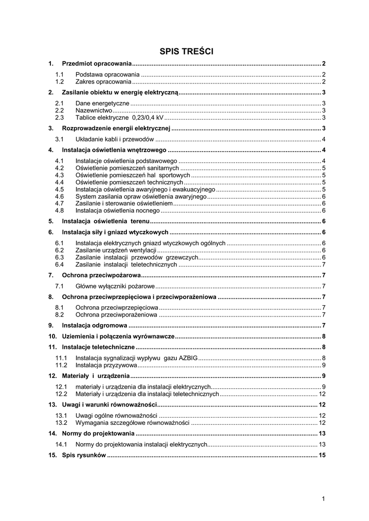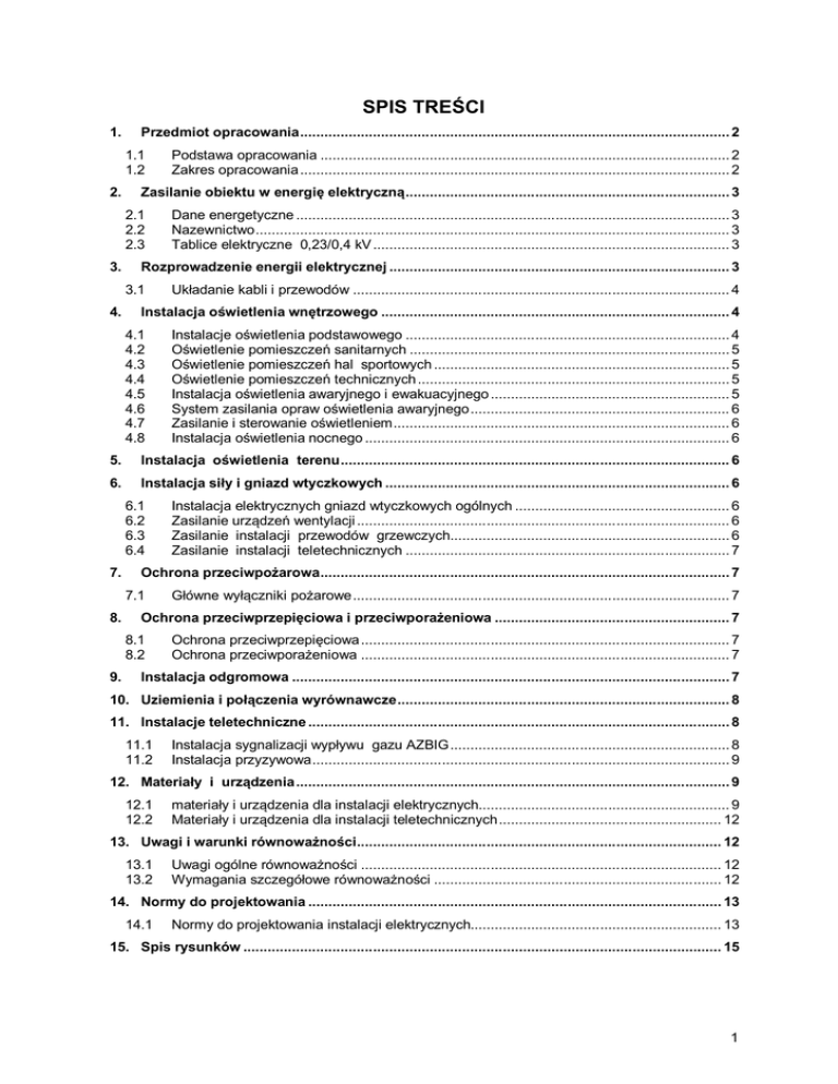 SPIS TREŚCI 1. Przedmiot opracowania .......................................................................................................... 2 1.1 1.2 2. Zasilanie obiektu w energię elektryczną ................................................................................ 3 2.1 2.2 2.3 3. Dane energetyczne ........................................................................................................... 3 Nazewnictwo ..................................................................................................................... 3 Tablice elektryczne 0,23/0,4 kV ........................................................................................ 3 Rozprowadzenie energii elektrycznej .................................................................................... 3 3.1 4. Podstawa opracowania ..................................................................................................... 2 Zakres opracowania .......................................................................................................... 2 Układanie kabli i przewodów ............................................................................................. 4 Instalacja oświetlenia wnętrzowego ...................................................................................... 4 4.1 4.2 4.3 4.4 4.5 4.6 4.7 4.8 Instalacje oświetlenia podstawowego ................................................................................ 4 Oświetlenie pomieszczeń sanitarnych ............................................................................... 5 Oświetlenie pomieszczeń hal sportowych ......................................................................... 5 Oświetlenie pomieszczeń technicznych ............................................................................. 5 Instalacja oświetlenia awaryjnego i ewakuacyjnego ........................................................... 5 System zasilania opraw oświetlenia awaryjnego ................................................................ 6 Zasilanie i sterowanie oświetleniem ................................................................................... 6 Instalacja oświetlenia nocnego .......................................................................................... 6 5. Instalacja oświetlenia terenu ................................................................................................ 6 6. Instalacja siły i gniazd wtyczkowych ..................................................................................... 6 6.1 6.2 6.3 6.4 7. Ochrona przeciwpożarowa ..................................................................................................... 7 7.1 8. Główne wyłączniki pożarowe ............................................................................................. 7 Ochrona przeciwprzepięciowa i przeciwporażeniowa .......................................................... 7 8.1 8.2 9. Instalacja elektrycznych gniazd wtyczkowych ogólnych ..................................................... 6 Zasilanie urządzeń wentylacji ............................................................................................ 6 Zasilanie instalacji przewodów grzewczych..................................................................... 6 Zasilanie instalacji teletechnicznych ................................................................................ 7 Ochrona przeciwprzepięciowa ........................................................................................... 7 Ochrona przeciwporażeniowa ........................................................................................... 7 Instalacja odgromowa ............................................................................................................ 7 10. Uziemienia i połączenia wyrównawcze .................................................................................. 8 11. Instalacje teletechniczne ........................................................................................................ 8 11.1 11.2 Instalacja sygnalizacji wypływu gazu AZBIG ..................................................................... 8 Instalacja przyzywowa ....................................................................................................... 9 12. Materiały i urządzenia ........................................................................................................... 9 12.1 12.2 materiały i urządzenia dla instalacji elektrycznych.............................................................. 9 Materiały i urządzenia dla instalacji teletechnicznych ....................................................... 12 13. Uwagi i warunki równoważności .......................................................................................... 12 13.1 13.2 Uwagi ogólne równoważności ......................................................................................... 12 Wymagania szczegółowe równoważności ....................................................................... 12 14. Normy do projektowania ...................................................................................................... 13 14.1 Normy do projektowania instalacji elektrycznych.............................................................. 13 15. Spis rysunków ...................................................................................................................... 15 1 1. Przedmiot opracowania Przedmiotem opracowania jest projekt wykonawczy instalacji elektrycznych i teletechnicznych wewnętrznych dla planowanej inwestycji pod nazwą: "Zmiana lokalizacji budowy dwóch boisk uniwersalnych, zadaszonych halami sportowymi typu namiotowego na terenie Wojskowej Akademii Technicznej w Warszawie", Warszawa ul. Kartezjusza 1, działka 322. 1.1 Podstawa opracowania Podstawę niniejszego opracowania stanowią: - Umowa ze Zleceniodawcą, - Plan sytuacyjny, - Podkłady architekto
