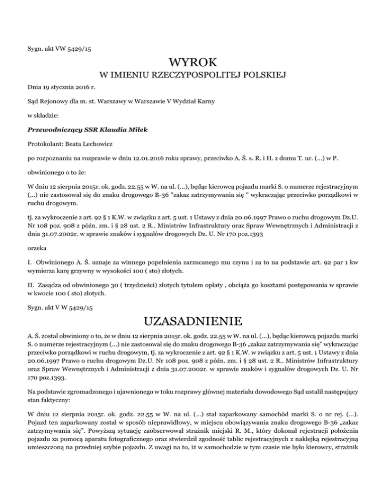 Sygn. akt VW 5429/15 WYROK W IMIENIU RZECZYPOSPOLITEJ POLSKIEJ Dnia 19 stycznia 2016 r. Sąd Rejonowy dla m. st. Warszawy w Warszawie V Wydział Karny w składzie: Przewodniczący SSR Klaudia Miłek Protokolant: Beata Lechowicz po rozpoznaniu na rozprawie w dniu 12.01.2016 roku sprawy, przeciwko A. Ś. s. R. i H. z domu T. ur. (...) w P. obwinionego o to że: W dniu 12 sierpnia 2015r. ok. godz. 22.55 w W. na ul. (...), będąc kierowcą pojazdu marki S. o numerze rejestracyjnym (...) nie zastosował się do znaku drogowego B-36 "zakaz zatrzymywania się " wykraczając przeciwko porządkowi w ruchu drogowym. tj. za wykroczenie z art. 92 § 1 K.W. w związku z art. 5 ust. 1 Ustawy z dnia 20.06.1997 Prawo o ruchu drogowym Dz.U. Nr 108 poz. 908 z późn. zm. i § 28 ust. 2 R.. Ministrów Infrastruktury oraz Spraw Wewnętrznych i Administracji z dnia 31.07.2002r. w sprawie znaków i sygnałów drogowych Dz. U. Nr 170 poz.1393 orzeka I. Obwinionego A. Ś. uznaje za winnego popełnienia zarzucanego mu czynu i za to na podstawie art. 92 par 1 kw wymierza karę grzywny w wysokości 100 ( sto) złotych. II. Zasądza od obwinionego 30 ( trzydzieści) złotych tytułem opłaty , obciąża go kosztami postępowania w sprawie w kwocie 100 ( sto) złotych. Sygn. akt V W 5429/15 UZASADNIENIE A. Ś. został obwiniony o to, że w dniu 12 sierpnia 2015r. ok. godz. 22.55 w W. na ul. (...), będąc kierowcą pojazdu marki S. o numerze rejestracyjnym (...) nie zastosował się do znaku drogowego B-36 „zakaz zatrzymywania się” wykraczając przeciwko porządkowi w ruchu drogowym, tj. za wykroczenie z art. 92 § 1 K.W. w związku z art. 5 ust. 1 Ustawy z dnia 20.06.1997 Prawo o ruchu drogowym Dz.U. Nr 108 poz. 908 z późn. zm. i § 28 ust. 2 R.. Ministrów Infrastruktury oraz Spraw Wewnętrznych i Administracji z dnia 31.07.2002r. w sprawie znaków i sygnałów drogowych Dz. U. Nr 170 poz.1393. Na podstawie zgromadzonego i ujawnionego w toku rozprawy głównej materiału dowodowego Sąd ustalił następujący stan faktyczny: W dniu 12 sierpnia 2015r. ok. godz. 22.55 w W. na ul. (...) stał zaparkowany samochód marki S. o nr rej. (...). Pojazd ten zaparkowany został w sposób nieprawidłowy, w miejscu obowiązywania znaku drogowego B-36 „zakaz zatrzymywania się”. Powyższą sytuację zaobserwował strażnik miejski R. M., który dokonał rejestracji położenia pojazdu za pomocą aparatu fotograficznego oraz stwierdził zgodność tablic rejestracyjnych z naklejką rejestracyjną umieszczoną na przedniej szybie pojazdu. Z uwagi na to, iż w samochodzie w tym czasie nie było kierowcy, strażnik miejski na szybie samochodu zostawił wezwanie do osobistego stawienia się w terminie 7 dni w siedzibie Straży Miejskiej m. st. W.. Samochód marki S. o nr rej. (...) w miejscu tym zaparkował A. Ś.. Powyższy stan faktyczny Sąd ustalił na podstawie: wyjaśnień obwinionego A. Ś. /e-protokół rozprawy z dnia 12 stycznia 2016 r. od godz. 00:02:57 do godz. 00:06:04/, pisemnych wyjaśnień obwinionego A. Ś. /k. 10/, zeznań świadka R. M. /k. 11v, e-protokół rozprawy z dnia 12 stycznia 2016 r. od godz. 00:06:33 do godz. 00:08:38/, a także notatki urzędowej /k. 1/, zdjęć /k. 3, 24-27/, wezwań /k. 4, 6/, zwrotnych potwierdzeń odbioru /k. 5, 7/ oraz pisma /k. 23/. Obwiniony A. Ś. w pisemnych wyjaśnieniach złożonych w postępowaniu wyjaśniającym wyjaśnił, że w dniu 12 sierpnia 2015 r. przeprowadził się do mieszkania w W. przy ul. (...) i od pracownika agencji nieruchomości działającego na zlecenie właściciela otrzymał jeden komplet kluczy umożliwiający wejście jedynie do mieszkania. Obwiniony wyjaśnił, że do nieruchomości przypisane jest również miejsce garażowe. Podkreślił również, że wejście na klatkę schodową jest możliwe wyłącznie przy użyciu karty magnetycznej, której pracownik agencji nieruchomości nie posiadał, natomiast właściciel nieruchomości nie mógł mu tego dnia osobiście jej przekazać. Obwiniony wyjaśnił, że z uwagi na powyższą sytuację wszystkie rzeczy, które wówczas przywiózł, mógł wnieść do mieszkania wchodząc przez klatkę schodową od ul. (...). Podkreślił, że samochód zaparkował wówczas przy ul. (...) w celu przemieszczenia rzeczy z samochodu na klatkę schodową, które następnie przeniósł on do mieszkania. Podkreślił również, że po zakończeniu czynności związanych z przeprowadzką udał się, aby zaparkować swój samochód na miejscu garażowym, które przypisane było do mieszkania. Wyjaśnił, że zobaczył wówczas za wycieraczką samochodu wezwanie wystawione przez Straż Miejską. Obwiniony podkreślił, że samochód zaparkowany był w tym miejscu przez około 30-40 minut, że miało to miejsce w porze nocnej i samochód nie utrudniał ruchu. Podkreślił również, że jego zdaniem znak zakazu w porze nocnej był słabo widoczny i podczas wykonywania manewru parkowania nie zauważył on powyższego znaku drogowego. Podkreślił nadto, że przed jego samochodem były wówczas zaparkowane 2-3 inne pojazdy. /k. 10 wyjaśnienia pisemne obwinionego A. Ś./ Składając wyjaśnienia przed Sądem obwiniony A. Ś. przyznał się do popełnienia zarzucanego mu czynu. Wskazał jednak, że jego zdaniem jego czyn nie stanowił czynu szkodliwego, dlatego też nie wyczerpywał znamion tego wykroczenia. Odnosząc się do zarzutu obwiniony potwierdził, że zaparkował pojazd w tym miejscu, podnosząc jednak, że była to boczna ulica. Wyjaśnił również, że od pracowników miejscowej ochrony dowiedział się, że znak ten został umieszczony w tym miejscu z uwagi na budowę na ul. (...). Obwiniony podkreślił, że ok. godz. 23:00 budowa nie była kontynuowana oraz, że zatrzymał się na chwilę, gdyż przeprowadzał się tego dnia i chciał rozpakować rzeczy. Odnosząc się do zarzutu obwiniony oświadczył, że w pewnych wyjątkach można nie stosować się do znaku drogowego zakaz zatrzymywania się.