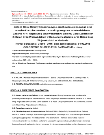 Strona 1 z 4 Ogłoszenie powiązane: Ogłoszenie nr 4634-2016 z dnia 2016-01-07 r. Ogłoszenie o zamówieniu - Zielona Góra ZADANIE NR 1: Rejon Dróg Wojewódzkich w Zielonej Górze: 1. Zakres obejmuje: a) konserwację oznakowania pionowego oraz urządzeń bezpieczeństwa ruchu polegającego na: - montażu znaków wraz ze słupkami montażu... Termin składania ofert: 2016-01-15 Zielona Góra: Roboty konserwacyjne oznakowania pionowego oraz urządzeń bezpieczeństwa ruchu drogowego na terenie działania: Zadanie nr 1: Rejon Dróg Wojewódzkich w Zielonej Górze Zadanie nr 2: Rejon Dróg Wojewódzkich w Kożuchowie Zadanie nr 3: Rejon Dróg Wojewódzkich w Kłodawie Numer ogłoszenia: 24808 - 2016; data zamieszczenia: 04.02.2016 OGŁOSZENIE O UDZIELENIU ZAMÓWIENIA - Usługi Zamieszczanie ogłoszenia: obowiązkowe. Ogłoszenie dotyczy: zamówienia publicznego. Czy zamówienie było przedmiotem ogłoszenia w Biuletynie Zamówień Publicznych: tak, numer ogłoszenia w BZP: 4634 - 2016r. Czy w Biuletynie Zamówień Publicznych zostało zamieszczone ogłoszenie o zmianie ogłoszenia: nie. SEKCJA I: ZAMAWIAJĄCY I. 1) NAZWA I ADRES: Województwo Lubuskie - Zarząd Dróg Wojewódzkich w Zielonej Górze, Al. Niepodległości 32, 65-042 Zielona Góra, woj. lubuskie, tel. 068 3280300, faks 068 3280332. I. 2) RODZAJ ZAMAWIAJĄCEGO: Administracja samorządowa. SEKCJA II: PRZEDMIOT ZAMÓWIENIA II.1) Nazwa nadana zamówieniu przez zamawiającego: Roboty konserwacyjne oznakowania pionowego oraz urządzeń bezpieczeństwa ruchu drogowego na terenie działania: Zadanie nr 1: Rejon Dróg Wojewódzkich w Zielonej Górze Zadanie nr 2: Rejon Dróg Wojewódzkich w Kożuchowie Zadanie nr 3: Rejon Dróg Wojewódzkich w Kłodawie. II.2) Rodzaj zamówienia: Usługi. II.3) Określenie przedmiotu zamówienia: ZADANIE NR 1: Rejon Dróg Wojewódzkich w Zielonej Górze: 1. Zakres obejmuje: a) konserwację oznakowania pionowego oraz urządzeń bezpieczeństwa ruchu polegającego na: - montażu znaków wraz ze słupkami - montażu znaków bez słupków wykonaniu znaków bez montażu - wykonaniu urządzeń bezpieczeństwa ruchu b) montaż i demontaż barier ochronnych stalowych - bariery ochronne U-14a z rozstawem słupków co 2m - bariery ochronne http://bzp0.portal.uzp.gov.pl/index.php?ogloszenie=show&pozycja=24808&rok=201... 2016-02-04 Strona 2 z 4 U-14a z rozstawem słupków co 4m - montaż zakończeń barier - montaż słupków, wsporników, prowadnic - montaż punktowych elementów odblaskowych U-1c 2. Usługi objęte zamówieniem: 1) oznakowania pionowego i urządzeń bezpieczeństwa ruchu drogowego będą realizowane w zależności od potrzeb: a) w sytuacjach zagrażających bezpieczeństwu ruchu drogowego, maksymalny czas na przystąpienie do realizacji czy zabezpieczenia terenu będzie wynosił..godziny od chwili przyjęcia zlecenia pisemnego/ telefonicznego*, poczty elektronicznej, w tym czasie należy między innymi wykonać tymczasowe oznakowanie i zabezpieczenie miejsca robót . b) w pozostałych sytuacjach - zamówienie wg potrzeb - każdorazowo zostanie określany czas realizacji od chwili przyjęcia zlecenia pisemnego przy użyciu faksu, poczty elektronicznej. 2) bariery drogowe stalowe - Usługi objęte zamówieniem będą realizowane przez Wykonawcę w różnych okresach w zależności od potrzeb: a) w sytuacjach zagrażających bezpieczeństwu ruchu drogowego, maksymalny czas na przystąpienie do realizacji i zabezpieczenia terenu będzie wynosił..godziny (zgodnie z ofertą Wykonawcy) od chwili przyjęcia zlecenia pisemnego przy użyciu faksu/ telefonicznego*, poczty elektronicznej, w tym czasie należy miedzy innymi wykonać tymczasowe oznakowanie i zabezpieczenie miejsca usług. b) w pozostałych sytuacjach - każdorazowo zostanie określany czas realizacji od chwili przyjęcia zlecenia przy użyciu faksu, poczty elektronicznej. * zlecenia telefoniczne będą miały zastosowanie tylko w dni wolne od pracy i świąteczne oraz poza godzinami urzędowania RDW Zielona Góra, zlecenia telefoniczne będą potwierdzane pisemnie następnego dnia roboczego. 3. Zlecenie, o którym mowa w pkt 2.1 a) i b) oraz 2.2 a) i b) będące podstawą do realizacji usług, będzie zawierać: zakres prac, ich szczegółową lokalizację oraz termin wykonania. ZADANIE NR 2: Rejon Dróg Wojewódzkich w Kożuchowie: 1. Zakres przedmiotu zamówienia obejmuje konserwację oznakowania pionowego oraz urządzeń bezpieczeństwa ruchu polegającego na: - montażu znaków wraz ze słupkami, - montażu znaków bez słupków, wykonaniu znaków i pozostałych elementów oznakowania bez montażu, - wykonaniu usługi montażu, demontażu i pozostałych prac, - wykonaniu urządzeń bezpieczeństwa ruchu - barier ochronnych i ich elementów. 2. Usługi będą realizowane przez Wykonawcę w różnych okresach w zależności od potrzeb: 1) w sytuacjach zagrażających bezpieczeństwu ruchu drogowego, maksymalny czas na przystąpienie do realizacji i zabezpieczenia terenu będzie wynosił..godziny (zgodnie z ofertą wykonawcy) od chwili przyjęcia zlecenia przy użyciu faksu/ telefonicznego*, poczty elektronicznej, przed przystąpieniem do realizacji należy wykonać tymczasowe oznakowanie i zabezpieczenie miejsca robót. 2) w pozostałych sytuacjach - każdorazowo zostanie określany czas realizacji od chwili przyjęcia zlecenia pisemnego przy użyciu faksu, poczty elektronicznej. * zlecenia telefoniczne będą miały zastosowanie tylko w dni wolne od pracy i świąteczne oraz poza godzinami urzędowania RDW Kożuchów, zlecenia telefoniczne będą potwierdzane pisemnie następnego dnia roboczego. 3. Zlecenie, o którym mowa w pkt 2.1) i 2.2), będące podstawą do realizacji usług, będzie zawierać: zakres prac, ich szczegółową lokalizację oraz termin wykonania. ZADANIE NR 3: Rejon Dróg Wojewódzkich w Kłodawie: 1. Przedmiotem zamówienia jest wykonanie konserwacji oznakowania pionowego oraz urządzeń bezpieczeństwa ruchu droga