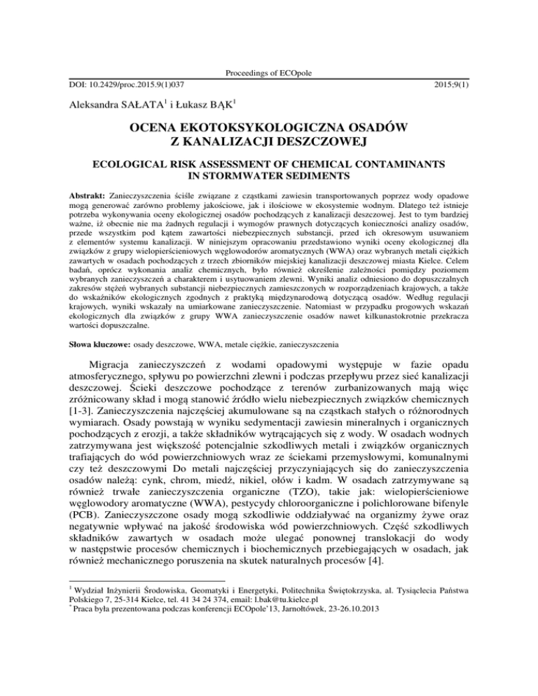 Proceedings of ECOpole DOI: 10.2429/proc.2015.9(1)037 2015;9(1) Aleksandra SAŁATA1 i Łukasz BĄK1 OCENA EKOTOKSYKOLOGICZNA OSADÓW Z KANALIZACJI DESZCZOWEJ ECOLOGICAL RISK ASSESSMENT OF CHEMICAL CONTAMINANTS IN STORMWATER SEDIMENTS Abstrakt: Zanieczyszczenia ściśle związane z cząstkami zawiesin transportowanych poprzez wody opadowe mogą generować zarówno problemy jakościowe, jak i ilościowe w ekosystemie wodnym. Dlatego też istnieje potrzeba wykonywania oceny ekologicznej osadów pochodzących z kanalizacji deszczowej. Jest to tym bardziej ważne, iż obecnie nie ma żadnych regulacji i wymogów prawnych dotyczących konieczności analizy osadów, przede wszystkim pod kątem zawartości niebezpiecznych substancji, przed ich okresowym usuwaniem z elementów systemu kanalizacji. W niniejszym opracowaniu przedstawiono wyniki oceny ekologicznej dla związków z grupy wielopierścieniowych węglowodorów aromatycznych (WWA) oraz wybranych metali ciężkich zawartych w osadach pochodzących z trzech zbiorników miejskiej kanalizacji deszczowej miasta Kielce. Celem badań, oprócz wykonania analiz chemicznych, było również określenie zależności pomiędzy poziomem wybranych zanieczyszczeń a charakterem i usytuowaniem zlewni. Wyniki analiz odniesiono do dopuszczalnych zakresów stężeń wybranych substancji niebezpiecznych zamieszczonych w rozporządzeniach krajowych, a także do wskaźników ekologicznych zgodnych z praktyką międzynarodową dotyczącą osadów. Według regulacji krajowych, wyniki wskazały na umiarkowane zanieczyszczenie. Natomiast w przypadku progowych wskazań ekologicznych dla związków z grupy WWA zanieczyszczenie osadów nawet kilkunastokrotnie przekracza wartości dopuszczalne. Słowa kluczowe: osady deszczowe, WWA, metale ciężkie, zanieczyszczenia Migracja zanieczyszczeń z wodami opadowymi występuje w fazie opadu atmosferycznego, spływu po powierzchni zlewni i podczas przepływu przez sieć kanalizacji deszczowej. Ścieki deszczowe pochodzące z terenów zurbanizowanych mają więc zróżnicowany skład i mogą stanowić źródło wielu niebezpiecznych związków chemicznych [1-3]. Zanieczyszczenia najczęściej akumulowane są na cząstkach stałych o różnorodnych wymiarach. Osady powstają w wyniku sedymentacji zawiesin mineralnych i organicznych pochodzących z erozji, a także składników wytrącających się z wody. W osadach wodnych zatrzymywana jest większość potencjalnie szkodliwych metali i związków organicznych trafiających do wód powierzchniowych wraz ze ściekami przemysłowymi, komunalnymi czy też deszczowymi Do metali najczęściej przyczyniających się do zanieczyszczenia osadów należą: cynk, chrom, miedź, nikiel, ołów i kadm. W osadach zatrzymywane są również trwałe zanieczyszczenia organiczne (TZO), takie jak: wielopierścieniowe węglowodory aromatyczne (WWA), pestycydy chloroorganiczne i polichlorowane bifenyle (PCB). Zanieczyszczone osady mogą szkodliwie oddziaływać na organizmy żywe oraz negatywnie wpływać na jakość środowiska wód powierzchniowych. Część szkodliwych składników zawartych w osadach może ulegać ponownej translokacji do wody w następstwie procesów chemicznych i biochemicznych przebiegających w osadach, jak również mechanicznego poruszenia na skutek naturalnych procesów [4]. 1 Wydział Inżynierii Środowiska, Geomatyki i Energetyki, Politechnika Świętokrzyska, al. Tysiąclecia Państwa Polskiego 7, 25-314 Kielce, tel. 41 34 24 374, email: [email protected] * Praca była prezentowana podczas konferencji ECOpole’13, Jarnołtówek, 23-26.10.2013 288 Aleksandra Sałata i Łukasz Bąk Określenia jakości osadów pochodzących z kanalizacji deszczowej oraz ich wpływu na środowisko naturalne dokonuje się, najczęściej przyjmując kryteria umożliwiające ocenę stopnia zanieczyszczenia osadów według Rozporządzenia Ministra Środowiska w sprawie standardów jakości gleby oraz standardów jakości ziemi [5]. Dodatkowo można wykorzystywać kryteria geochemiczne dla osadów powstających w ekosystemie wodnym. Badania geochemiczne osadów dennych jezior i rzek, wykonywane w ramach programu Państwowego Monitoringu Środowiska, obecnie są powszechnie wykorzystywane do oceny zanieczyszczenia środowiska wód powierzchniowych [6, 7]. Mając na uwadze ogromny wpływ zakumulowanych w osadach substancji niebezpiecznych na środowisko naturalne, coraz częściej odnosi się wyniki analiz do parametrów ekotoksykologicznych, które określają zakres oddziaływania zanieczyszczeń na organizmy żywe rezydujące w środowisku wodnym. Parametr TEL (threshold effects level) określa górną granicę zakresu stężeń zanieczyszczeń, poniżej której negatywny wpływ na organizmy wodne występuje dość rzadko. Parametr PEL (probable effects level) definiowany jest jako dolna granica stężeń zanieczyszczeń, których negatywny wpływ na organizmy żywe może być znaczny [8]. W artykule przedstawiono wyniki analiz osadów z kanalizacji deszczowej ze zlewni zlokalizowanych na terenie miasta Kielce. Do oceny ich oddziaływania na środowisko naturalne wykorzystano krajowe standardy geochemiczne, a także wskaźniki ekotoksykologiczne PEL i TEL. Materiał i metody badań Miejsce poboru próbek Analizie fizykochemicznej poddano osady pobrane ze zbiorników oczyszczalni wód deszczowych zlokalizowanych w obrębie miasta Kielce. Do badań wytypowano trzy obiekty różniące się budową, czasem eksploatacji, a także sposobem użytkowania i zagospodarowania zlewni, co przedstawiono w tabeli 1. Tabela 1 Charakterystyka obiektów wytypowanych do badań Table 1 Catchments selected for research Dane wyjściowe Rok oddania do użytku Typ zbiornika Powierzchnia całkowita zlewni [ha] Zabudowa mieszkaniowa [%] Tereny przemysłowe [%] Łąki, pola orne [%] Lasy [%] Tereny zielone [%] PIE 1992 otwarty 804,6 63 9 27 1 0 Zbiorniki wytypowane do analiz WIT JES 2003 2001 otwarty zamknięty 1