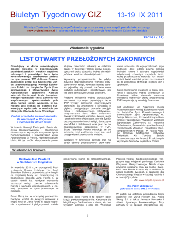 Biuletyn Tygodniowy CIZ 13-19 IX 2011 Biuletyn Centrum Informacyjnego Zakonów opracowywany przez zespół portalu internetowego www.zyciezakonne.pl i sekretariat Konferencji Wyższych Przełożonych Zakonów Męskich 38/2011 (133) Wiadomość tygodnia LIST OTWARTY PRZEŁOŻONYCH ZAKONNYCH Obradujący w domu rekolekcyjnym diecezji kieleckiej w Skorzeszycach przełożeni żeńskich i męskich wspólnot zakonnych i pozostałych form życia konsekrowanego wystosowali protest na ręce prezesa TVP Juliusza Brauna. Zaproszeni przez bpa Kazimierza Gurdę, przewodniczącego Komisji Episkopatu Polski ds. Instytutów Życia Konsekrowanego i Stowarzyszeń Życia Apostolskiego członkowie Konsult czterech Konferencji życia konsekrowanego rozmawiali o misji zakonów we współczesnym społeczeństwie polskim. Uznali jednak wspólnie, iż konieczna jest reakcja na ostatnie bulwersujące wydarzenia w mediach publicznych. Oto treść Listu Otwartego: Protest przeciwko brakowi szacunku dla wierzących w Chrystusa i wyznawców innych religii W imieniu Komisji Episkopatu Polski ds. Życia Konsekrowanego i Konferencji Przełożonych Wyższych Instytutów Życia Konsekrowanego i Stowarzyszeń Życia Apostolskiego w Polsce, reprezentujących blisko 40 tys. osób, zdecydowanie prote- stujemy przeciwko eskalacji w ostatnim czasie w Telewizji Polskiej aktów agresji, cynizmu i braku szacunku wobec chrześcijaństwa i wartości chrześcijańskich. Wyrażamy przypuszczenie, że gdyby zjawisko deprecjonowania wartości dotyczyło innych religii, wówczas bardzo szybko pojawiłby się protest, zarówno wielu instytucji publicznych i państwowych, jak też osób pełniących funkcje publiczne. Postawa milczenia wobec powyższych zachowań, czy wręcz pojawiające się w TVP wyrazy zdziwienia napływającymi protestami są znamienne i świadczą o głęboko postępującym procesie zobojętnienia i niebezpiecznego relatywizmu. Eksponowanie osób, które świadomie drwią i wyśmiewają wartości, święte księgi i znaki nie tylko chrześcijan, ale też Żydów oraz wyznawców innych religii, świadczy o ksenofobii i nietolerancji oraz jest nie do zaakceptowania szczególnie w TVP. Skoro Telewizja Polska odwołuje się do pełnienia misji publicznej, musi brać pod uwagę wiarę i przekonania widzów. Wierzący w Chrystusa zawsze stali na straży obrony podstawowych praw czło- wieka, szacunku dla jego przekonań i jego godności. Jest jednak pewna granica wolności słowa i zakresu wypowiedzi artystycznej, chroniąca zwykłych, ludzi, której przekraczanie narusza ich wrażliwość i świat wartości, przez co zmuszani są do znoszenia zbytniego ciężaru kpin i upokorzeń. Takie zachowania świadczą o braku tolerancji i szacunku wobec wierzących w Chrystusa, którzy stanowią ogromną większość odbiorców oferty programowej TVP i wspierają tę telewizję finansowo. List podpisali: bp Kazimierz Gurda Przewodniczący Komisji Episkopatu Polski ds. Instytutów Życia Konsekrowanego i Stowarzyszeń Życia Apostolskiego; M. Leticja Niemczura, Przewodnicząca Konferencji Przełożonych Wyższych Żeńskich Zgromadzeń Zakonnych; M. Weronika Solwulewska, Przewodnicząca Konferencji Przełożonych Żeńskich Klasztorów Kontemplacyjnych w Polsce; P. Teresa Nalepa, Krajowa Konferencja Instytutów Świeckich; Ks. Tomasz Sielicki Przewodniczący Konferencji Przełożonych Wyższych Zakonów Męskich w Polsce Wiadomości krajowe odśpiewana litania do Błogosławionego. Relikwie Jana Pawła II w Sanktuarium Mogilskim 14 września 2011 r., w uroczystość Podwyższenia Krzyża Świętego Ks. Kard. Stanisław Dziwisz przewodniczył w bazylice mogilskiej Mszy św. dziękczynnej za beatyfikację papieża Jana Pawła II. W czasie homilii ks. Kardynał wymownie zaznaczył wciąż obecne znieważanie Krzyża i wartości chrześcijańskich w naszej Ojczyźnie, w życiu publicznym, w mediach. Przed Mszą św. w uroczystej procesji Ks. Kardynał wniósł do świątyni relikwiarz z kroplą krwi bł. Jana Pawła II, gdzie wspólnie z cystersami i pielgrzymami została Papieża-Polaka, Najdostojniejszego Pielgrzyma tego miejsca i gorliwego Czciciela Chrystusa Ukrzyżowanego. Niech dziękczynienie składane Bogu za osobę i świętość Jana Pawła II łączy się z modlitwą o naszą osobistą świętość, o szacunek dla Chrystusowego Krzyża w każdej rodzinie i w naszej Ojczyźnie. Za: www.mogila.cystersi.pl Ks. Piotr Skarga SJ patronem roku 2012 w Polsce Relikwie Jana Pawła II to kolejny (obok krzyża pektoralnego) dar Ks. Kardynała dla Mogilskiego Sanktuarium - staną się one wyrazem pamięci i czci dla Wielkiego 1 W piątek na ostatnim posiedzeniu Sejm ustanowił rok 2012 Rokiem ks. Piotra Skargi SJ, a także Janusza Korczaka i Józefa Ignacego Kraszewskiego. Trzy uchwały w tej sprawie przygotowała sej- mowa Komisja Kultury i Środków Przekazu, a za ich przyjęciem posłowie zagłosowali niemal jednomyślnie. Za inicjatywę ogłoszenia roku 2012 Rokiem ks. Piotra Skargi SJ odpowiedzialni są posłowie PO, których zdaniem zapisał się on w historii "jako czołowy polski przedstawiciel kontrreformacji, filantrop oraz ten, który w trosce o Ojczyznę miał kościele św. Pawła Apostoła, której przewodniczył ks. bp Wiesław Lechowicz. Następnie uczestnicy liturgii przeszli na Cmentarz św. Rozalii, gdzie przy grobie o. W. Całki odsłonięto Tablicę Ponarską. Kolejnym punktem uroczystości był wieczór pamięci w Muzeum im. S. Fischera w Bochni poświęcony duchowieństwu polskiemu w archidiecezji wileńskiej i osobie o. W. Całki. Wystąpili: ks. prof. dr Tadeusz Krahel (Archidiecezjalne Wyższe Seminarium Duchowne w Białymstoku), Martyrologia duchowieństwa polskiego w archidiecezji wileńskiej w latach 1939-1945 Grażyna Potępa (Muzeum w Bochni), Ojciec Władysław Całka, redemptorysta z Bochni Janina Kęsek (Muzeum w Bochni), Dziennik więzienny o. Władysława Całki. Życiorys o. W. Całki na: www.redemptor.p