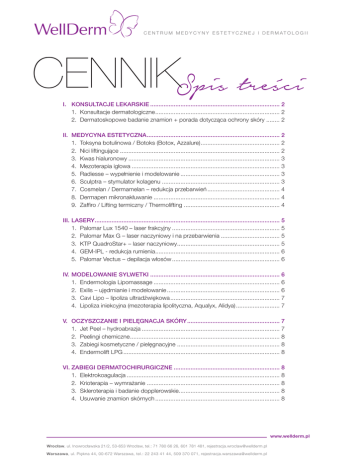 C E N T R U M M E D Y C Y N Y E S T E T Y C Z N E J I D E R M AT O L O G I I CENNIKSpis treści I. KONSULTACJE LEKARSKIE ............................................................................. 2 1. Konsultacje dermatologiczne.......................................................................... 2 2. Dermatoskopowe badanie znamion + porada dotycząca ochrony skóry ........ 2 II. MEDYCYNA ESTETYCZNA............................................................................... 2 1. Toksyna botulinowa / Botoks (Botox, Azzalure)............................................... 2 2. Nici liftingujące ............................................................................................... 2 3. Kwas hialuronowy .......................................................................................... 3 4. Mezoterapia igłowa ........................................................................................ 3 5. Radiesse – wypełnienie i modelowanie ........................................................... 3 6. Sculptra – stymulator kolagenu ...................................................................... 3 7. Cosmelan / Dermamelan – redukcja przebarwień ........................................... 4 8. Dermapen mikronakłuwanie ........................................................................... 4 9. Zaffiro / Lifting termiczny / Thermolifting ......................................................... 4 III. LASERY.............................................................................................................. 5 1. Palomar Lux 1540 – laser frakcyjny ................................................................ 5 2. Palomar Max G – laser naczyniowy i na przebarwienia ................................... 5 3. KTP QuadroStar+ – laser naczyniowy............................................................. 5 4. GEM-IPL - redukcja rumienia.......................................................................... 6 5. Palomar Vectus – depilacja włosów ................................................................ 6 IV. MODELOWANIE SYLWETKI ............................................................................. 6 1. Endermologia Lipomassage ........................................................................... 6 2. Exilis – ujędrnianie i modelowanie ................................................................... 6 3. Cavi Lipo – lipoliza ultradźwiękowa ................................................................. 7 4. Lipoliza iniekcyjna (mezoterapia lipolityczna, Aqualyx, Alidya).......................... 7 V. OCZYSZCZANIE I PIELĘGNACJA SKÓRY....................................................... 7 1. Jet Peel – hydroabrazja .................................................................................. 7 2. Peelingi chemiczne......................................................................................... 8 3. Zabiegi kosmetyczne / pielęgnacyjne ............................................................. 8 4. Endermolift LPG ............................................................................................. 8 VI. ZABIEGI DERMATOCHIRURGICZNE ............................................................... 8 1. Elektrokoagulacja ........................................................................................... 8 2. Krioterapia – wymrażanie ............................................................................... 8 3. Skleroterapia i badanie dopplerowskie............................................................ 8 4. Usuwanie znamion skórnych .......................................................................... 8 www.wellderm.pl Wrocław, ul. Inowrocławska 21/2, 53-653 Wrocław, tel.: 71 780 66 26, 601 781 481, [email protected] Warszawa, ul. Piękna 44, 00-672 Warszawa, tel.: 22 243 41 44, 509 370 071, [email protected] C E N T R U M M E D Y C Y N Y E S T E T Y C Z N E J I D E R M AT O L O G I I I. KONSULTACJE LEKARSKIE Usługi dostępne w Centrum WellDerm Wrocław, Warszawa 1. Konsultacje dermatologiczne Konsultacja dermatologiczna / estetyczna u dr Agnieszki Bliżanowskiej ........................... 200 PLN Konsultacja dermatologiczna / estetyczna ....................................................................... 150 PLN Wystawienie recepty bez wizyty dla stałych pacjentów....................................................... 50 PLN 2. Dermatoskopowe badanie znamion + porada dotycząca ochrony skóry ................. 200 PLN II. MEDYCYNA ESTETYCZNA 1. Toksyna botulinowa / Botoks (Botox, Azzalure) Usługa dostępna w Centrum WellDerm Wrocław, Warszawa Redukcja zmarszczek (cena uzależniona od nasilenia zmian - ilości zużytego preparatu): Zmarszczka międzybrwiowa „lwia zmarszczka” ..................................................... 400 – 900 PLN Zmarszczki poziome na czole ................................................................................ 400 – 700 PLN „Kurze łapki” .......................................................................................................... 400 – 700 PLN „Zmarszczki palacza” ............................................................................................. 300 – 500 PLN Baby botox................................................................................................................. od 450 PLN Mezobotox ................................................................................................................. od 400 PLN Inne zastosowanie toksyny botulinowej: Redukcja „brody czarownicy”................................................................................. 350 – 450 PLN Podniesienie powiek .............................................................................................. 400 – 500 PLN Podniesienie kącików ust ....................................................................................... 300 – 400 PLN Zmarszc
