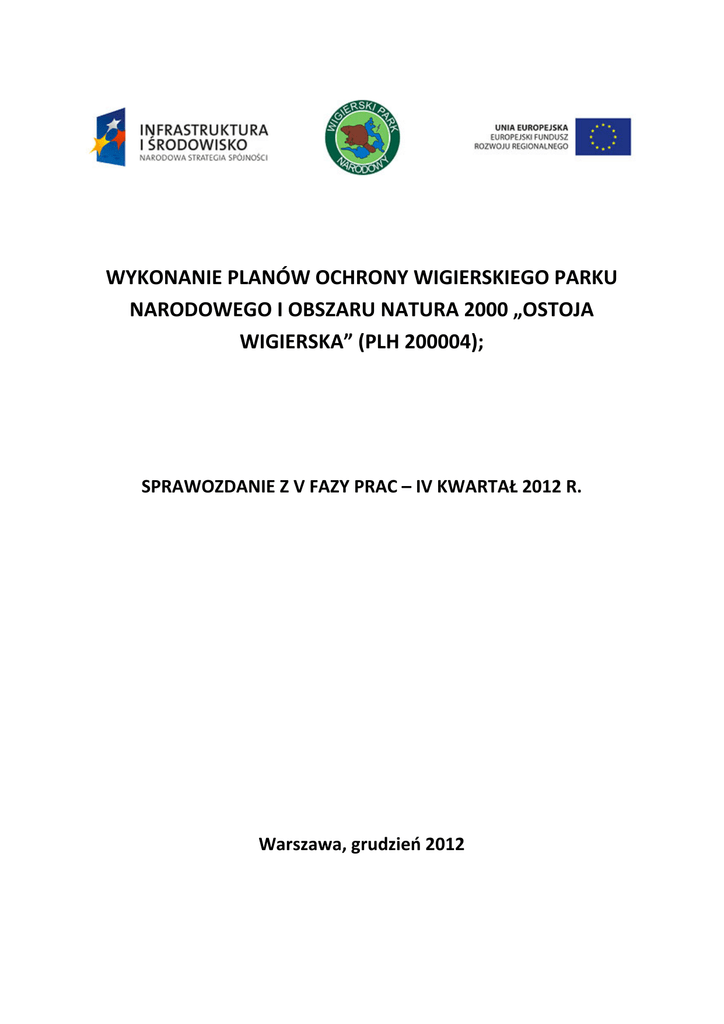 WYKONANIE PLANÓW OCHRONY WIGIERSKIEGO PARKU NARODOWEGO I OBSZARU NATURA 2000 „OSTOJA WIGIERSKA” (PLH 200004); SPRAWOZDANIE Z V FAZY PRAC – IV KWARTAŁ 2012 R. Warszawa, grudzień 2012 Zadanie pt. „Wykonanie planów ochrony Wigierskiego Parku Narodowego i obszaru Natura 2000 „Ostoja Wigierska” Spis treści: I. PRZEDMIOT ZAMÓWIENIA I PODSTAWA PRAWNA....................................................................3 II. ZAKRES PRAC OBJĘTYCH SPRAWOZDANIEM................................................................................3 III. MERYTORYCZNE ZAANGAŻOWANIE W REALIZACJI ZAMÓWIENIA.....................................4 IV. SPRAWOZDANIE SZCZEGÓŁÓWE ZESPOŁÓW..........................................................................5 IV. 1 Wykonanie planów ochrony Wigierskiego Parku Narodowego i obszaru Natura 2000 „Ostoja Wigierska” (PLH 200004) w części dotyczącej lądowych ekosystemów nieleśnych, torfowiskowych i bagiennych (zdanie 8)..............................................................................................5 Załącznik merytoryczny ........................................................................................................................6 IV.2 Wykonanie planów ochrony Wigierskiego Parku Narodowego i obszaru Natura 2000 „Ostoja Wigierska” (PLH 200004) w części dotyczącej ochrony zasobów i ekosystemów wodnych (zadanie 9) ..........................................................................................................................21 IV.3 Wykonanie planów ochrony Wigierskiego Parku Narodowego i obszaru Natura 2000 „Ostoja Wigierska” (PLH 200004) w części dotyczącej ochrony zwierząt (zadanie 12).....................47 Załączniki merytoryczne.....................................................................................................................50 1. Identyfikacja zagrożeń................................................................................................................50 2. Ocena dotychczasowej ochrony.................................................................................................50 3. Matryca operatów szczegółowych.............................................................................................50 Projekt realizowany przez konsorcjum Narodowa Fundacja Ochrony Środowiska i Taxus S.I 2 Zadanie pt. „Wykonanie planów ochrony Wigierskiego Parku Narodowego i obszaru Natura 2000 „Ostoja Wigierska” I. PRZEDMIOT ZAMÓWIENIA I PODSTAWA PRAWNA Przedmiotem zamówienia jest wykonanie dwóch projektów planów ochrony (zwanych dalej projektami „Planu" dla: 1. 2. Wigierskiego Parku Narodowego (w skrócie WPN) Specjalnego Obszaru Ochrony Siedlisk (w skrócie SOO) „Ostoja Wigierska” PLH200004 Zadanie realizowane jest na podstawie umowy nr OPIK 37‐1 – 2.1/2011 z dnia 14 czerwca 2011 r. zawartej pomiędzy Wigierskim Parkiem Narodowym jako zlecającym, a wykonawcą, którym jest konsorcjum firm Narodowa Fundacja Ochrony Środowiska oraz Taxus S.I. II. ZAKRES PRAC OBJĘTYCH SPRAWOZDANIEM Niniejsze sprawozdanie obejmuje zasadniczo IV kwartał 2012 r., przy czym w przypadku niektórych operatów, które nie były przedmiotem rozliczenia w poprzednich kwartałach, uwzględniono także te wykonane wcześniej prace. Zgodnie z harmonogramem realizowano działania wchodzące w skład następujących zadań: Zadanie II.1 Realizacja przedsięwzięcia 8. Wykonanie "Operatu ochrony lądowych ekosystemów nieleśnych, torfowiskowych i bagiennych". 9. Wykonanie "Operatu ochrony zasobów i ekosystemów wodnych". 10. Wykonanie "Operatu ochrony roślin". 12. Wykonanie "Operatu ochrony zwierząt". 14. Wykonanie opracowania "Zagospodarowanie przestrzenne Wigierskiego Parku Narodowego i jego otuliny". 15. Wykonanie opracowań analitycznych. Szczegóły dotyczące prac zespołów przedstawiono w dalszej części sprawozdania. Część materiałów wynikowych załączono na płycie CD. W przypadku zadania Wykonanie opracowania "Zagospodarowanie przestrzenne Wigierskiego Parku Narodowego i jego otuliny" zebrano opracowania planistyczne – studia uwarunkowań i kierunków zagospodarowania przestrzennego (SUiKZP) oraz miejscowe plany zagospodarowania przestrzennego (MPZP) gmin obejmujących obszar Wigierskiego Parku Narodowego i jego otuliny i rozpoczęto analizę ich ustaleń pod kątem ewentualnego wpływu na cele ochrony Parku i przedmioty ochrony obszarów Natura 2000. Na obecnym etapie pozyskano i są analizowane: • dla gminy Giby: SUiKZP Projekt realizowany przez konsorcjum Narodowa Fundacja Ochrony Środowiska i Taxus S.I 3 Zadanie pt. „Wykonanie planów ochrony Wigierskiego Parku Narodowego i obszaru Natura 2000 „Ostoja Wigierska” • dla gminy Krasnopol: SUiKZP • dla gminy Nowinka: 4 MPZP, SUiKZP • dla gminy Suwałki: 23 MPZP, SUiKZP • dla gminy Szypliszki: 1 MPZP, SUiKZP Sukcesywnie analizowane są także inne opracowania strategiczne na poziomie gminnym, powiatowym i wojewódzkim na potrzeby opisania uwarunkowań społeczno‐gospodarczych funkcjonowania Parku. Zadanie to będzie kontynuowane także w kolejnym etapie prac. W ramach zadania Wykonanie opracowań analitycznych zestawiono w postaci tabel zagrożenia dla poszczególnych walorów Wigierskiego Parku Narodowego, w tym dla przedmiotów ochrony obszarów Natura 2000 i dokonani ich kodyfikacji zgodnie z obowiązującymi wytycznymi Generalnej Dyrekcji Ochrony Środowiska. Dokonano także oceny skuteczności dotychczasowej ochrony. Zadanie to będzie kontynuowane także w kolejnym etapie prac. W okresie sprawozdawczym kontynuowano także działania organizacyjne i merytoryczne, niezbędne dla prowadzenia projektu, w tym: 1. nadzór nad postępem prac i działaniami zespołu autorskiego i działaniami koordynatorów planów zadań ochronnych, 2. przygotowanie matrycy operatów szczegółowych (załącznik nr 3) 3. administracyjna obsługa zamówienia, 4. finansowa obsługa zamówi