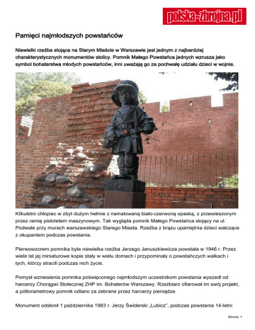 Pamięci najmłodszych powstańców Niewielki rzeźba stojąca na Starym Mieście w Warszawie jest jednym z najbardziej charakterystycznych monumentów stolicy. Pomnik Małego Powstańca jednych wzrusza jako symbol bohaterstwa młodych powstańców, inni uważają go za pochwałę udziału dzieci w wojnie. Kilkuletni chłopiec w zbyt dużym hełmie z namalowaną biało-czerwoną opaską, z przewieszonym przez ramię pistoletem maszynowym. Tak wygląda pomnik Małego Powstańca stojący na ul. Podwale przy murach warszawskiego Starego Miasta. Rzeźba z brązu upamiętnia dzieci walczące z okupantem podczas powstania. Pierwowzorem pomnika była niewielka rzeźba Jerzego Januszkiewicza powstała w 1946 r. Przez wiele lat jej miniaturowe kopie stały w wielu domach i przypominały o powstańczych walkach i tych, którzy stracili podczas nich życie. Pomysł wzniesienia pomnika poświęconego najmłodszym uczestnikom powstania wyszedł od harcerzy Chorągwi Stołecznej ZHP im. Bohaterów Warszawy. Rzeźbiarz ofiarował im swój projekt, a półtorametrowy pomnik odlano za zebrane przez harcerzy pieniądze. Monument odsłonił 1 października 1983 r. Jerzy Świderski „Lubicz”, podczas powstania 14-letni Strona: 1 łącznik plutonu Kompanii Harcerskiej batalionu „Gustaw” Zgrupowania Armii Krajowej „Róg”. – Pomnik jest symbolem bohaterstwa tamtych lat dla wszystkich warszawiaków – relacjonowało tego dnia Polskie Radio. Rok później na murze za pomnikiem umieszczono tablicę pamiątkową z krzyżem harcerskim i wyrytym fragmentem powstańczej piosenki „Warszawskie dzieci”. Od momentu powstania rzeźba wzbudza kontrowersje. Jednym przypomina o bohaterstwie małych powstańców, dla innych jest pochwałą udziału dzieci w walkach. Nie zmienia to faktu, że wiele dzieci na ochotnika zgłaszało się do oddziałów i uczestniczyło w zrywie. Najmłodsi 12–14-letni chłopcy, tzw. zawiszacy, pełnili służbę pomocniczą, roznosili pocztę polową, kolportowali prasę powstańczą, byli przewodnikami w kanałach, niszczyli butelkami z benzyną niemieckie czołgi. Starsi czasem z bronią w ręku pełnili służbę na barykadach. Dziewczyny troszczyły się o rannych i przenosiły meldunki. Dziś o ich walce przypomina nie tylko pomnik na Starym Mieście, lecz także jego kopia stojąca w Sali Małego Powstańca w Muzeum Powstania Warszawskiego. Strona: 2 Strona: 3